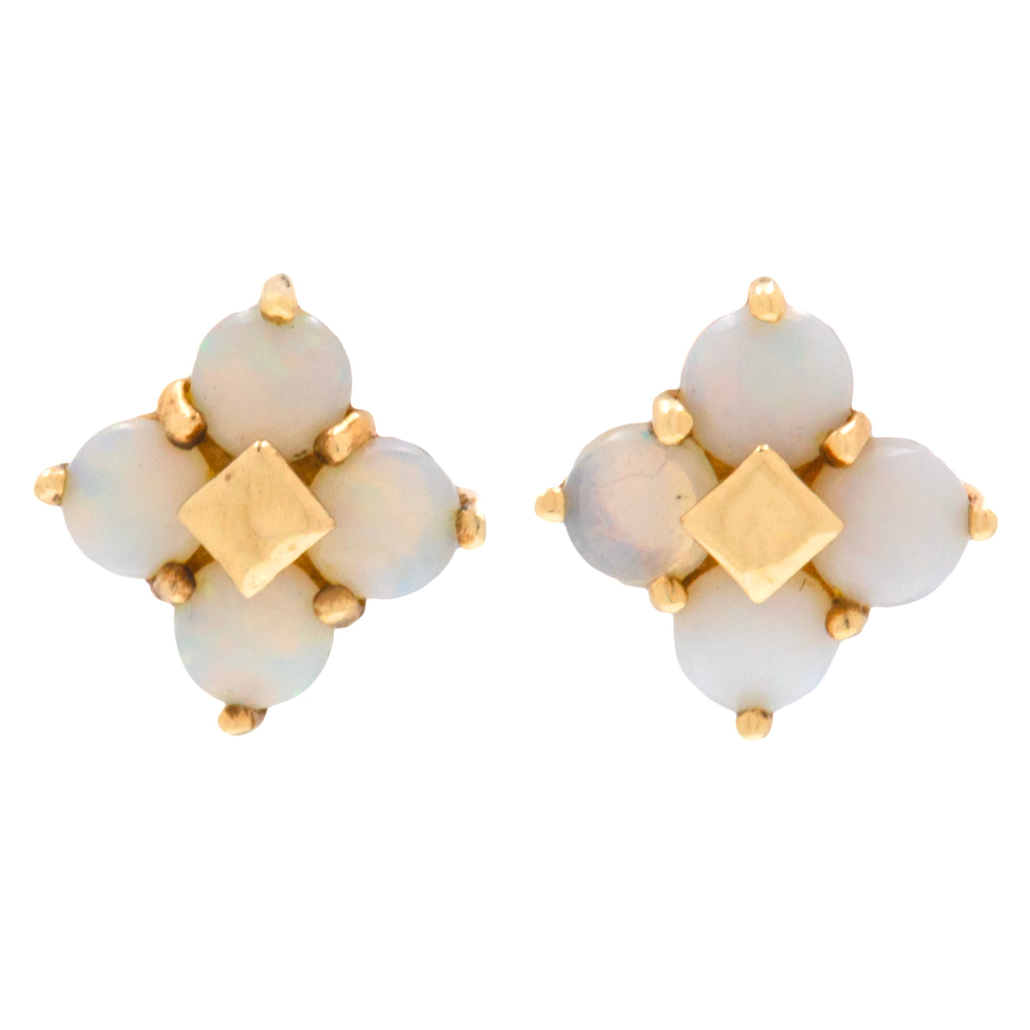 EXCELLENT. With securely set smooth Opals, perfectly formed yellow Gold, and tight-fitting butterfly backs, these 10ct Gold Opal flower cluster stud earrings are in excellent condition! The Opals are a dainty delight, and look gorgeous against the buttery 9ct Gold. With 9ct Gold butterfly backs you can wear these earrings with absolute confidence.