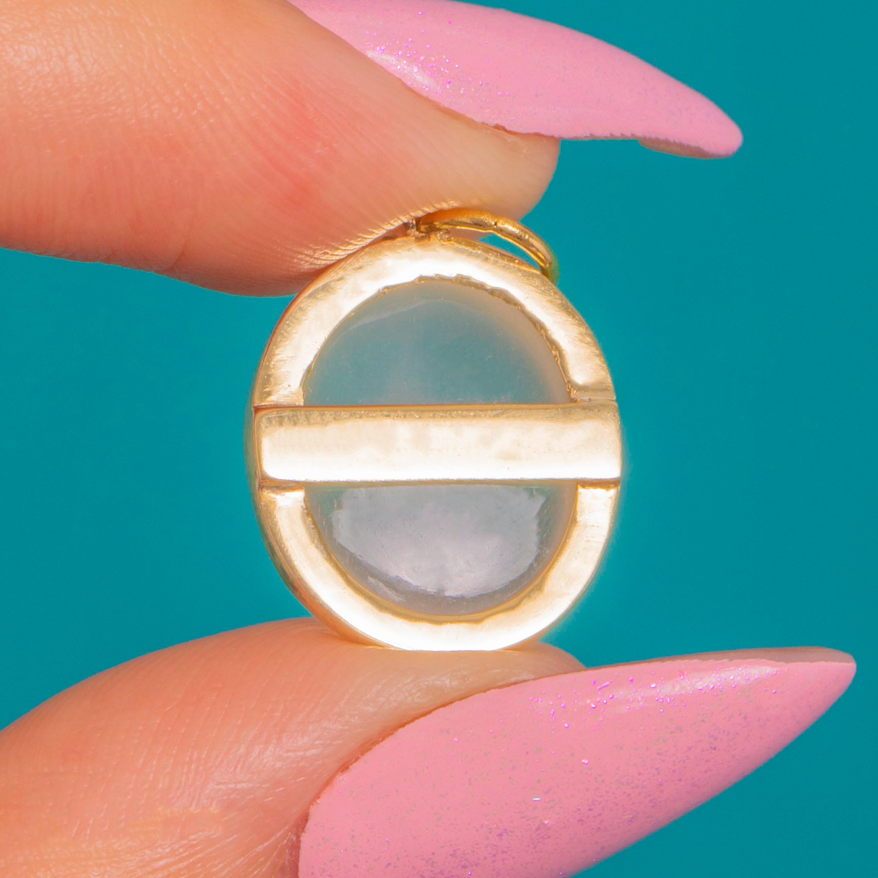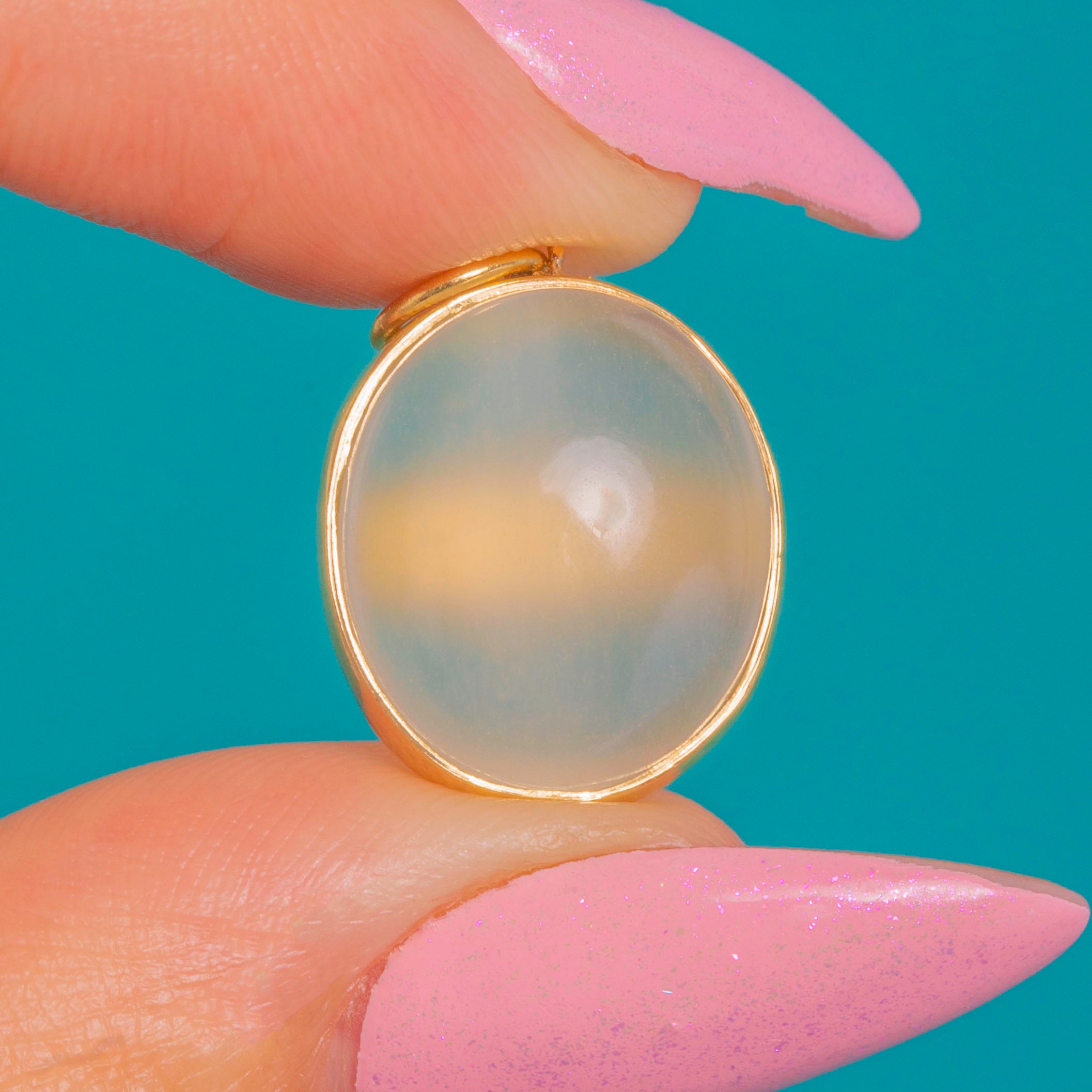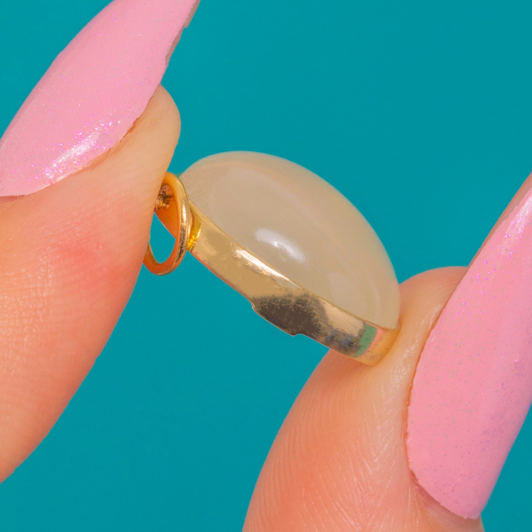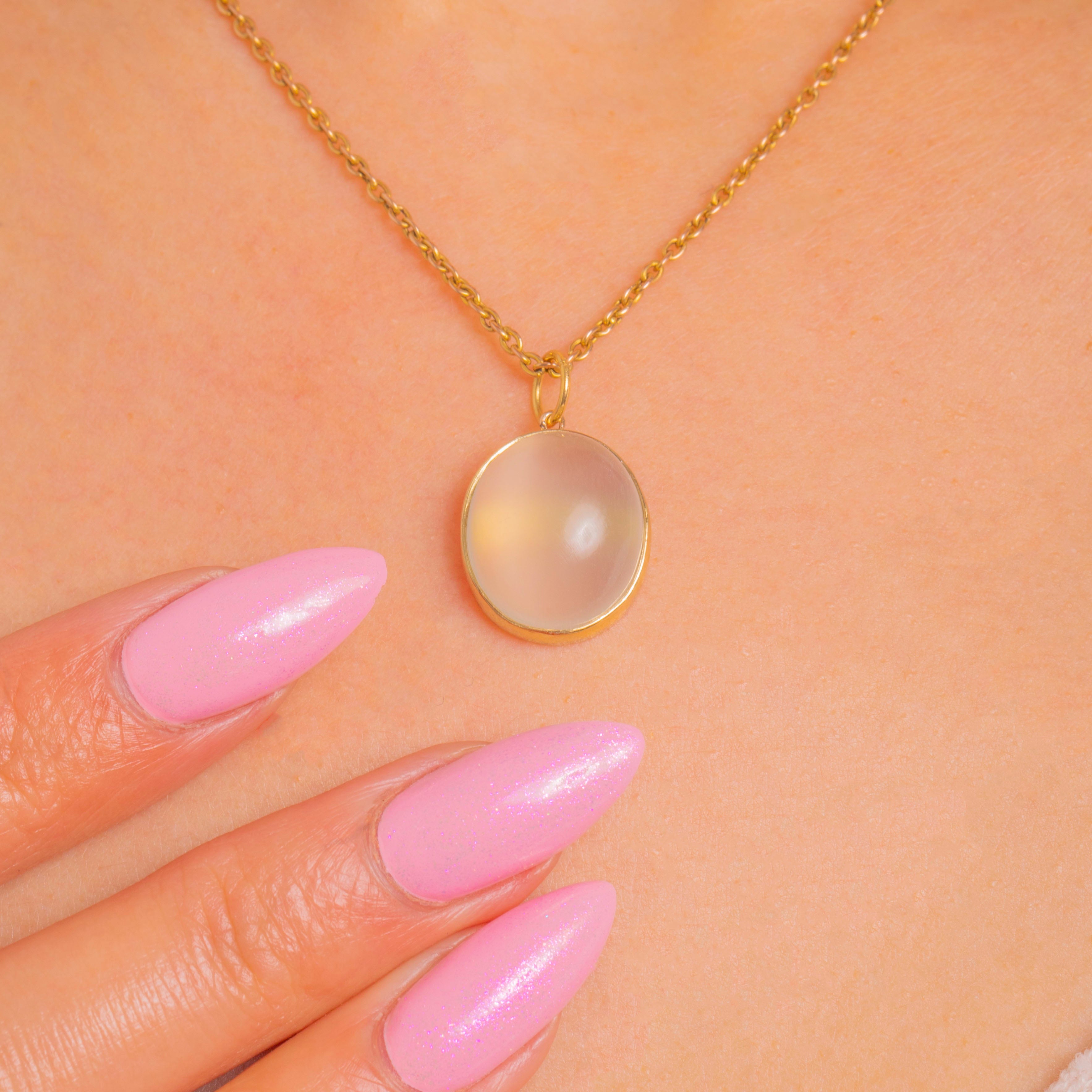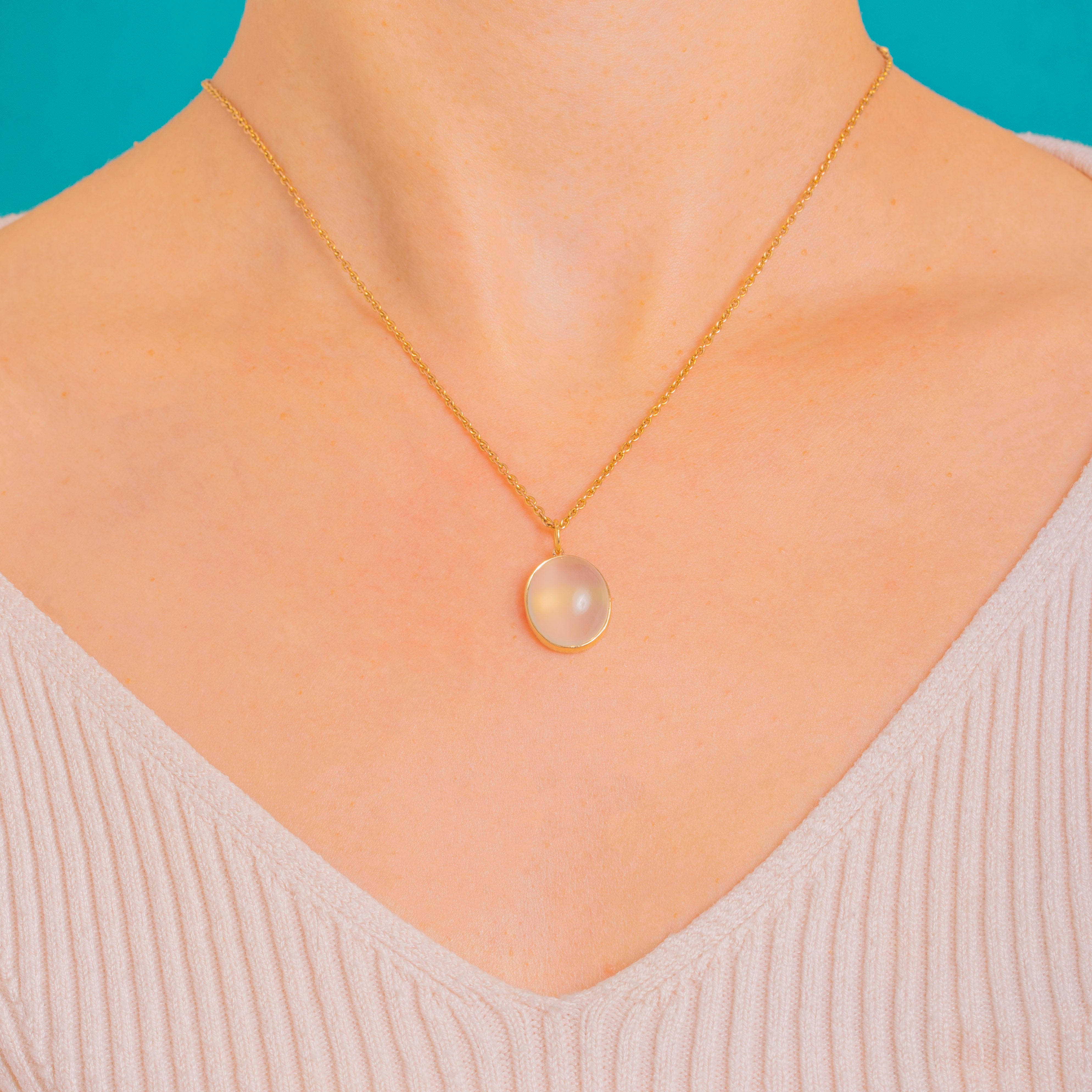 Sleek, luminous and effortlessly elegant, this Art Deco charm centres on a high-domed Cat’s Eye Moonstone whose silky band of light glides across a milky, pearly body. The cabochon’s ethereal glow is beautifully showcased in a smooth, closed-back 14ct Gold bezel with a neat soldered jump ring for easy styling.