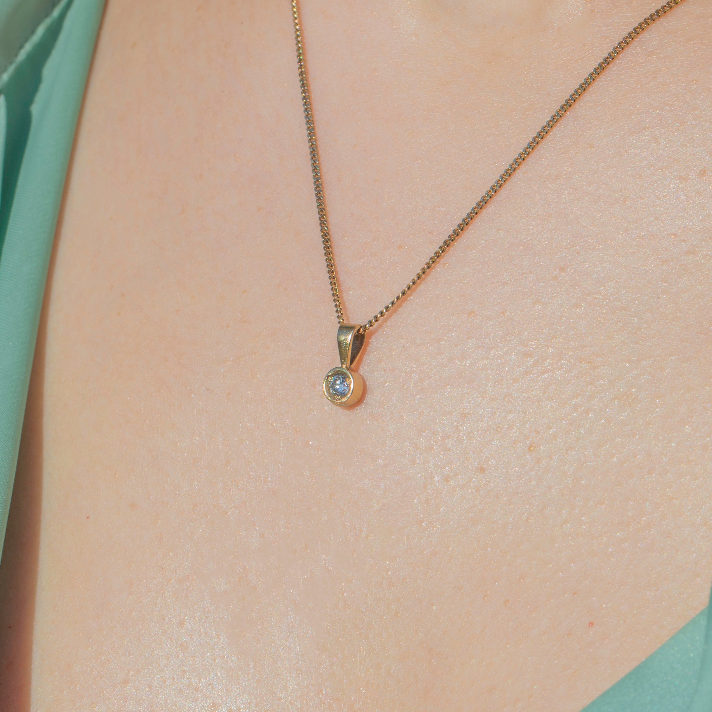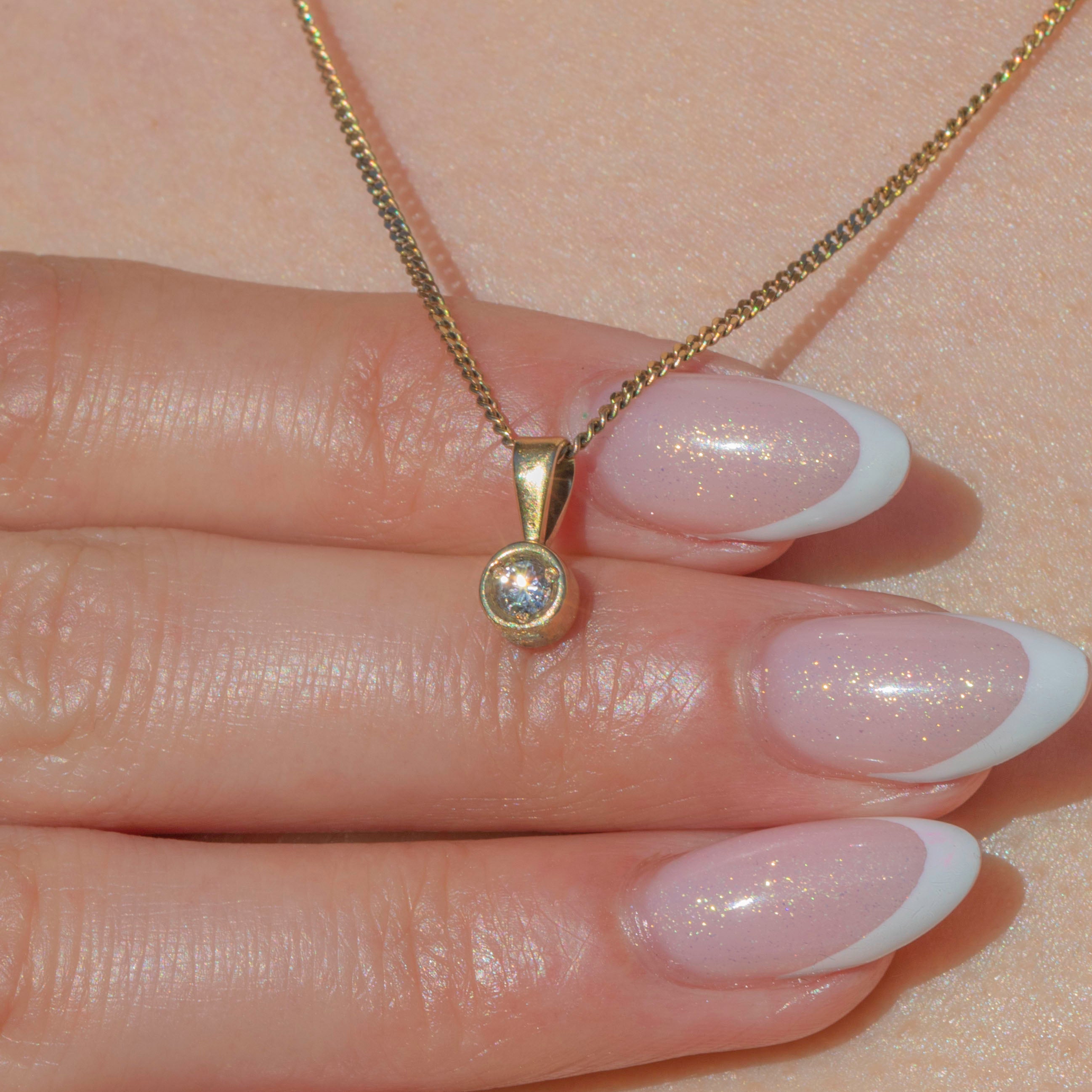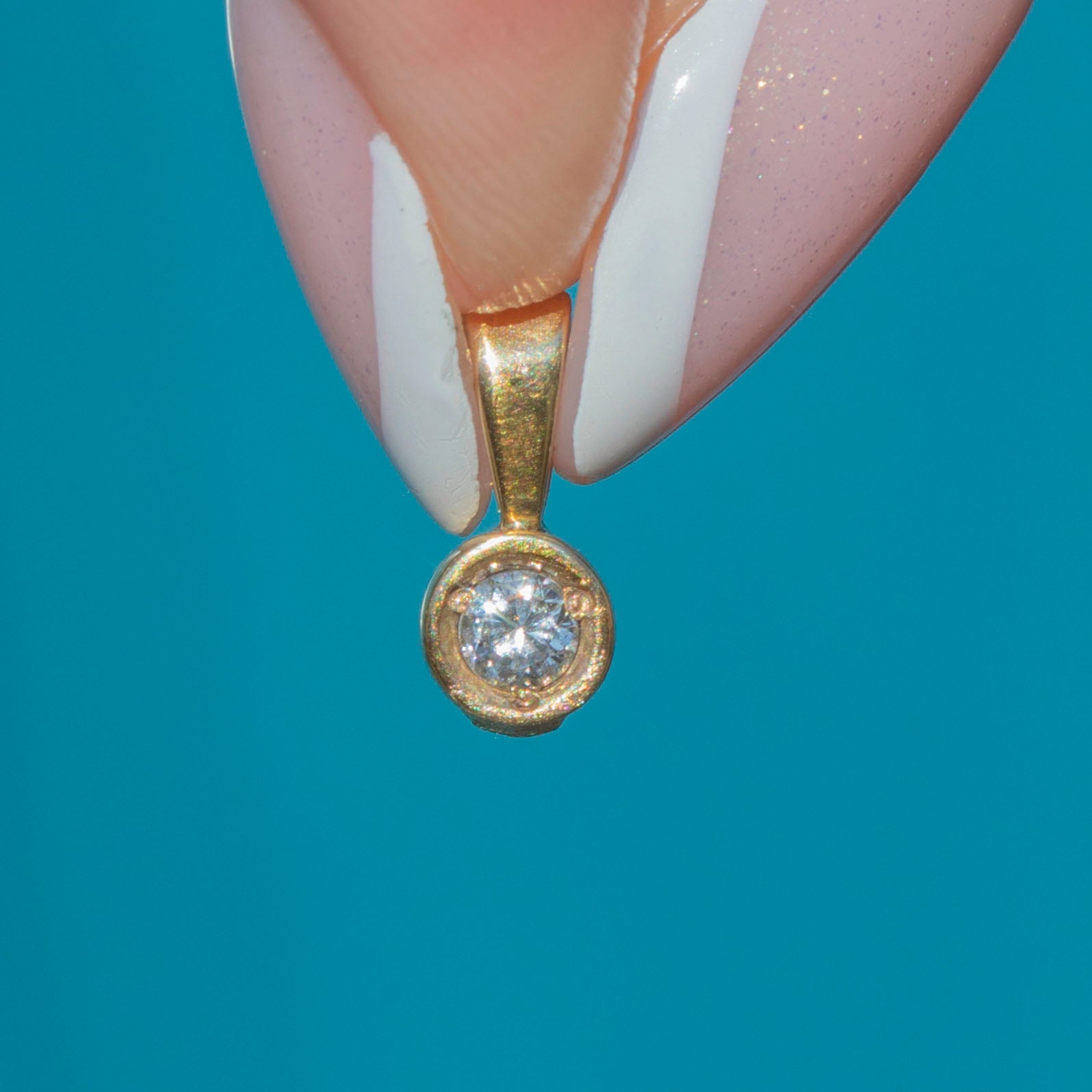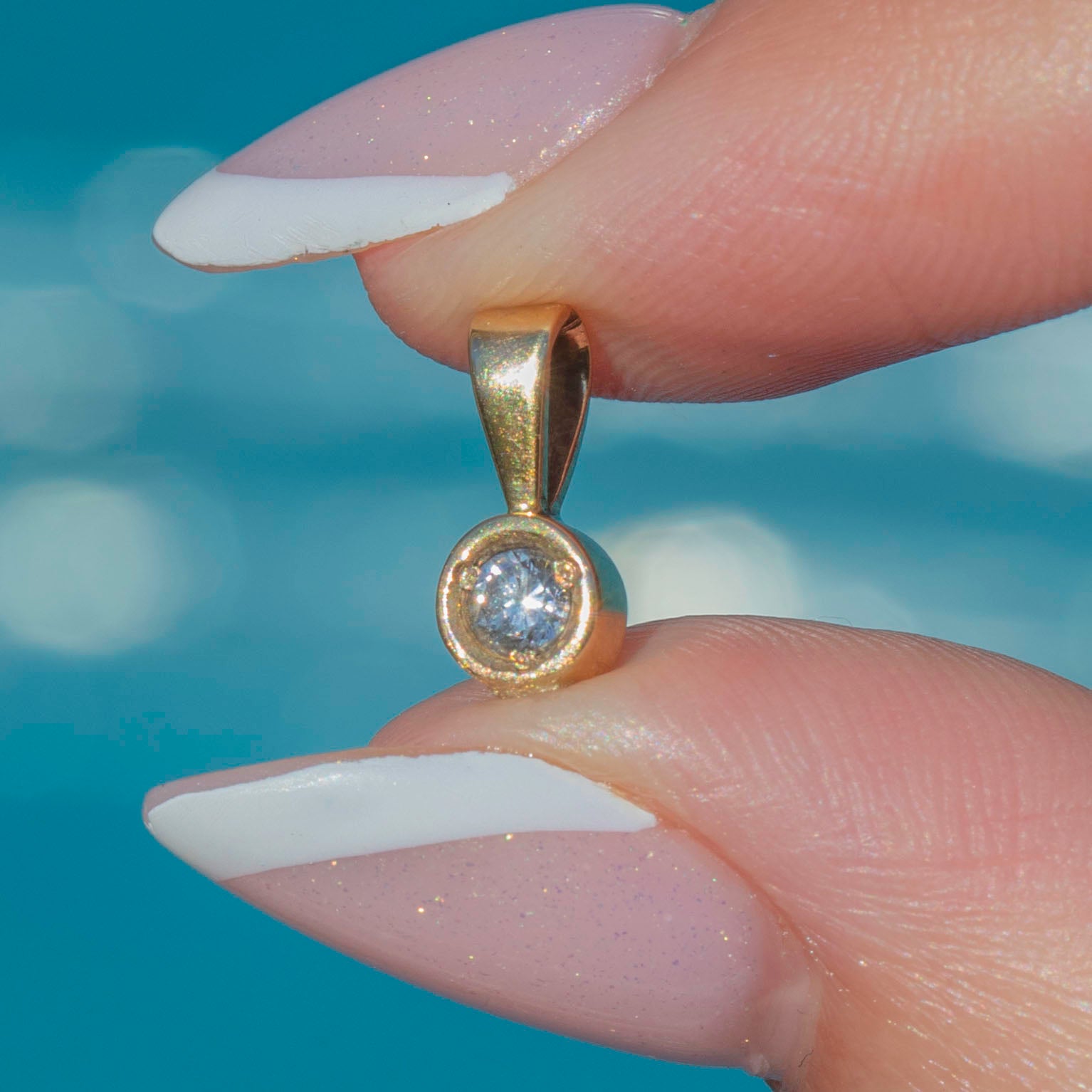 The 0.10ct Diamond is stunning, twinkling beautifully as she catches the light. She is set within a glossy 14ct Gold bezel, beneath an elegant bale. Weighing under a gram, this petite antique Diamond charm is the perfect dainty piece to add to a fine chain or elegant bracelet.