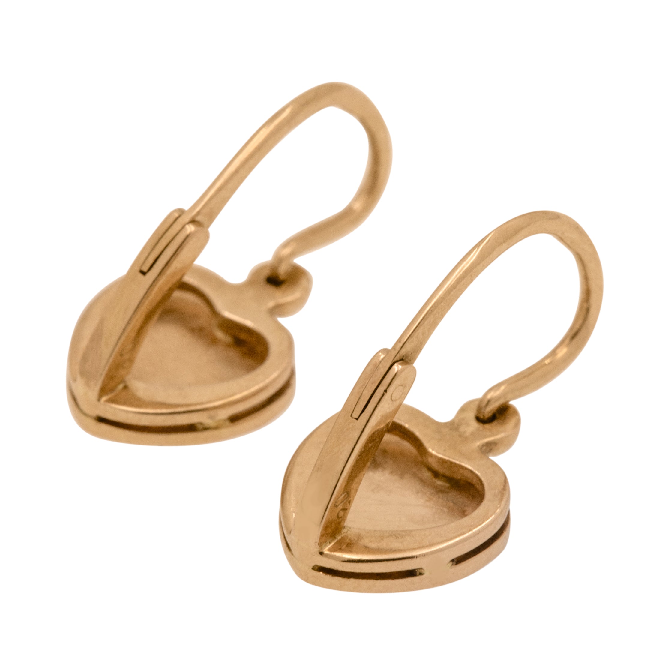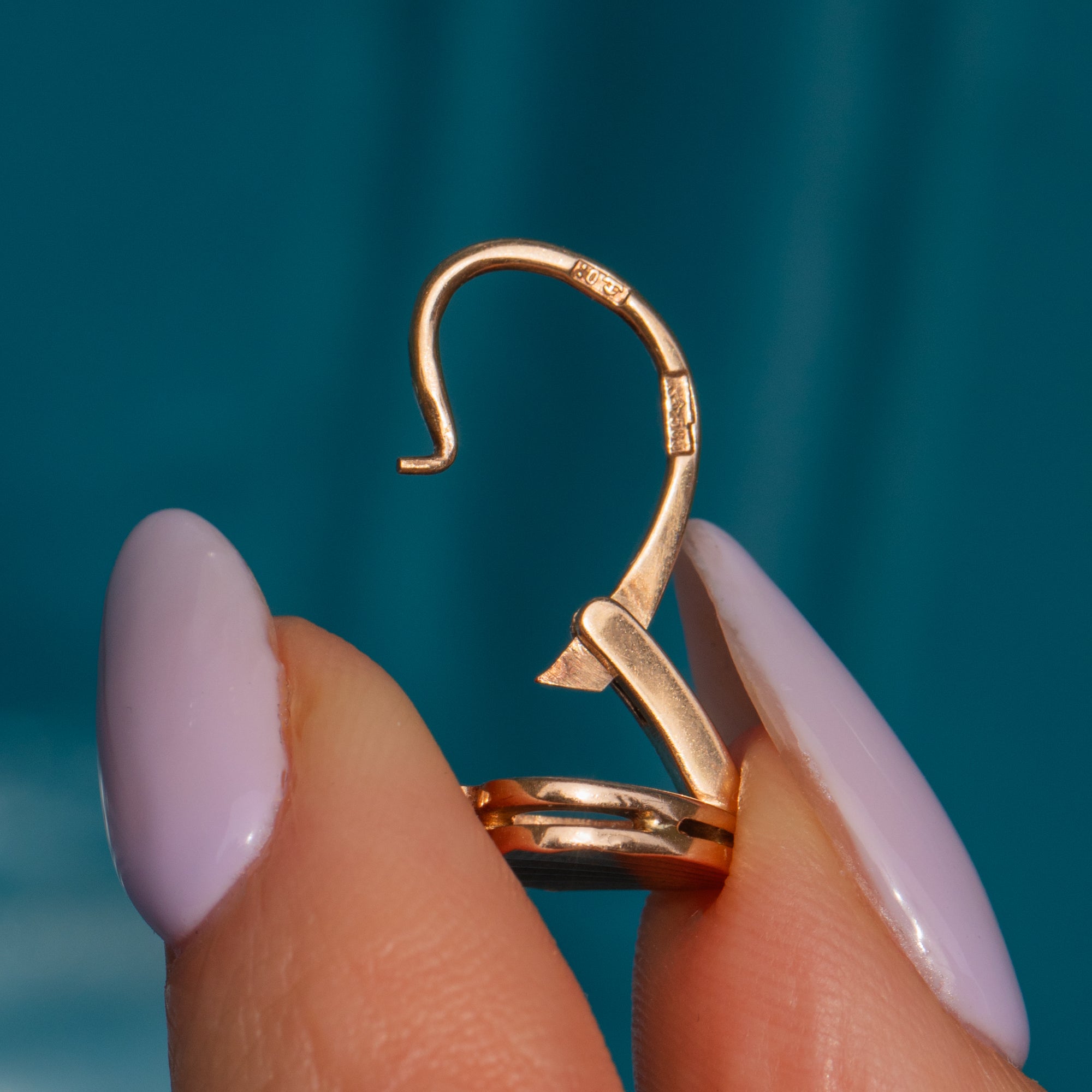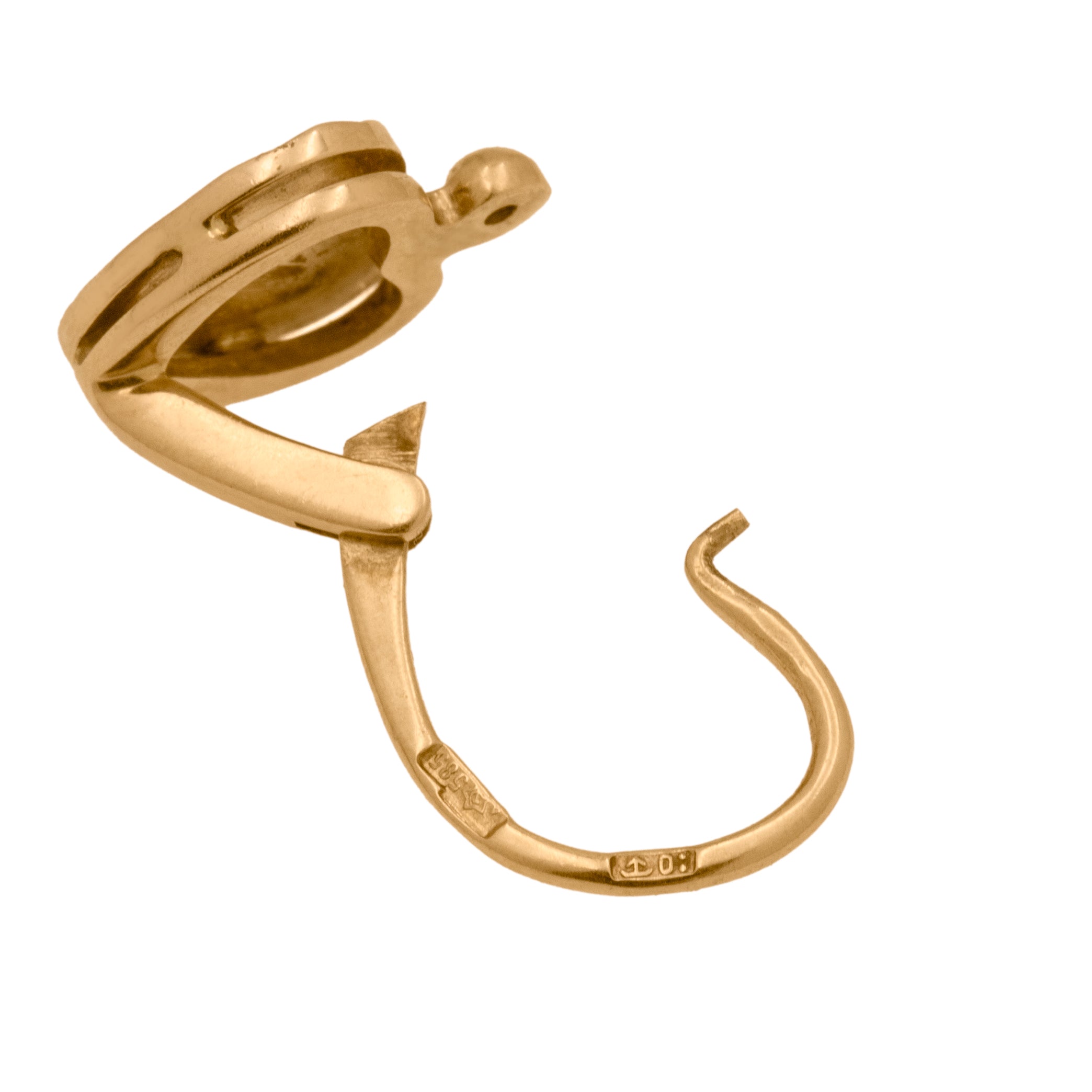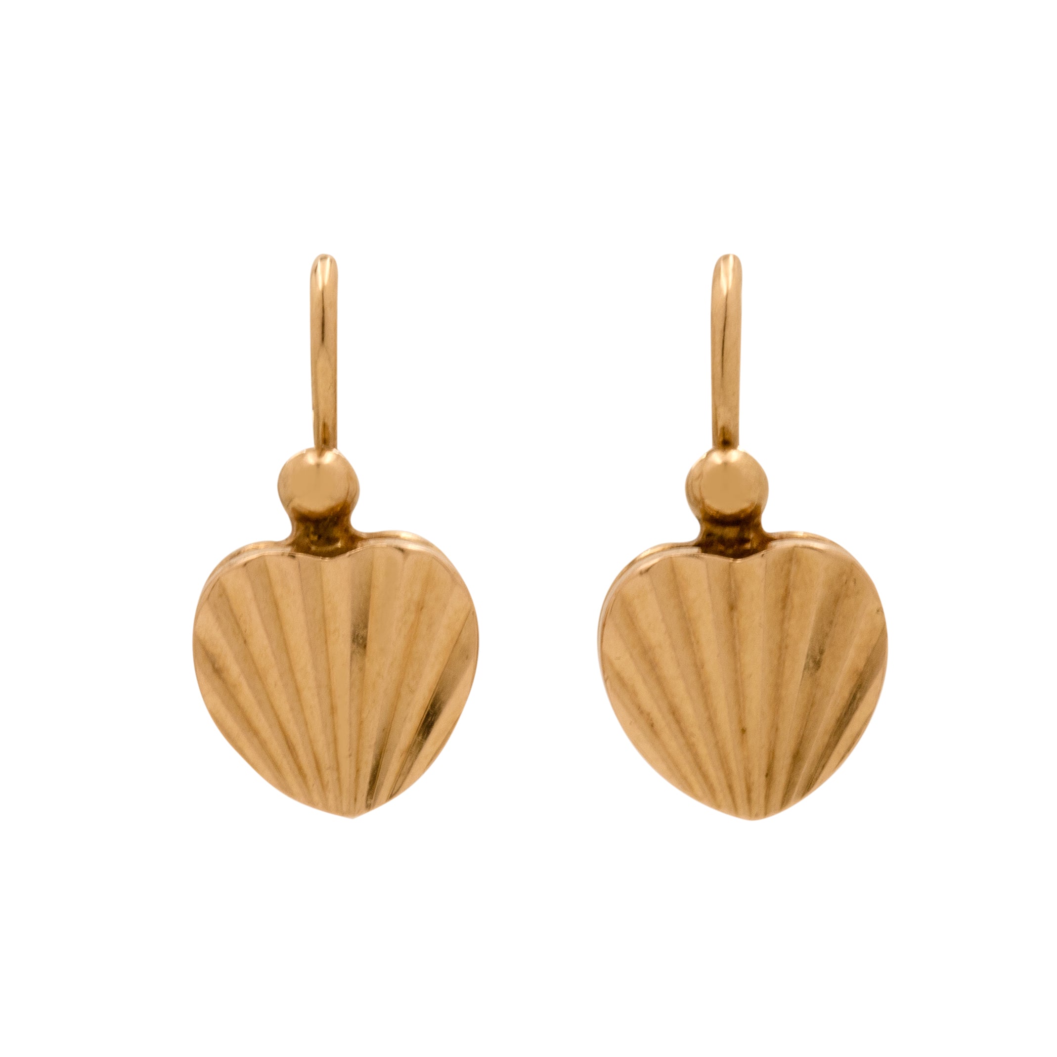 EXCELLENT. These pretty 14ct Gold heart Dormeuse earrings are in excellent condition. The Gold is saturated throughout and the ridged details are crisp and free from dents or scuffs. There is some minimal wear on the back of the hearts, commensurate with age, but this cannot be seen while the earrings are being worn. The levers are in perfect working condition, allowing you to wear these superb Art Deco earrings with absolute confidence!