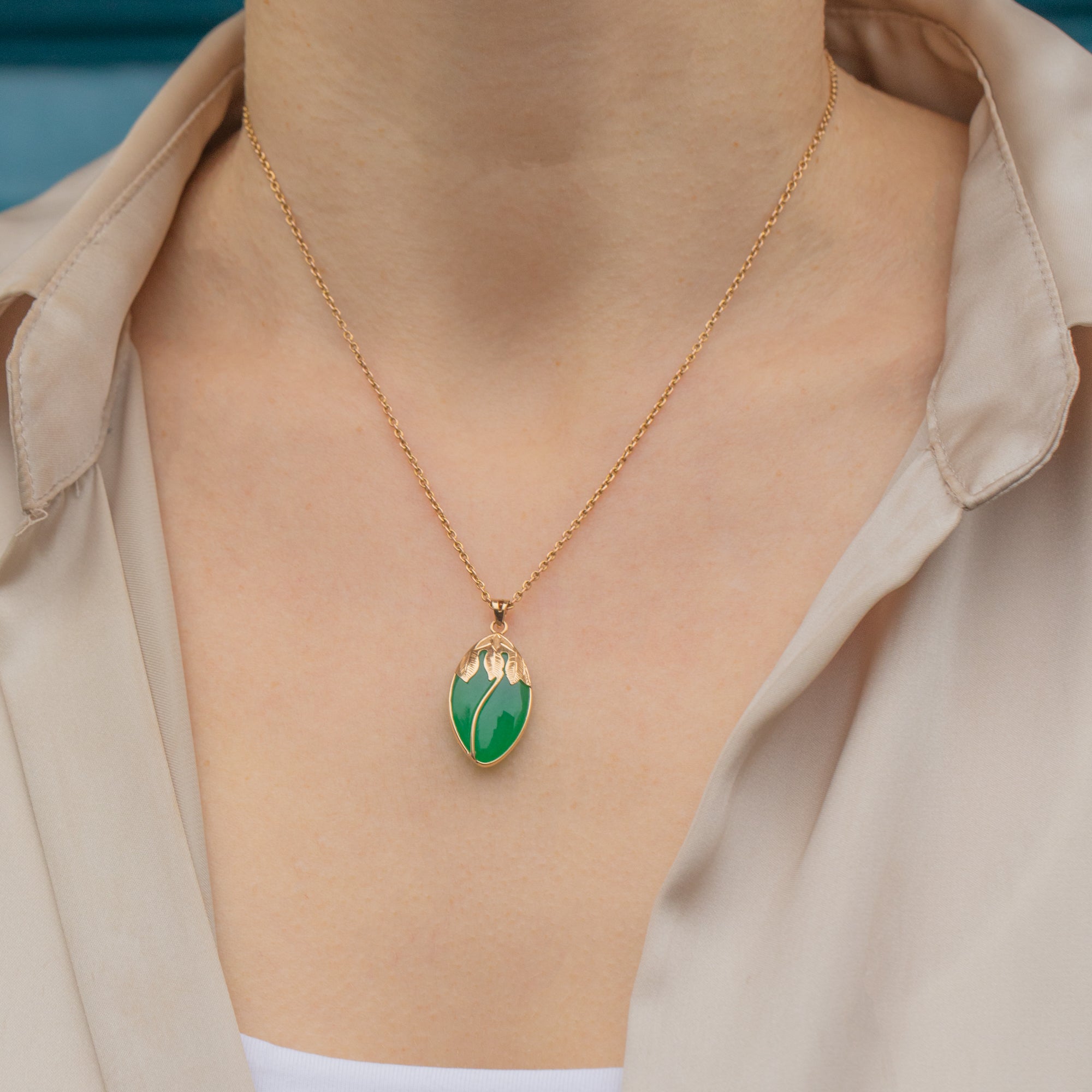 Add a pop of colour to your neck stack with this 14ct Gold Jade Navette pendant!