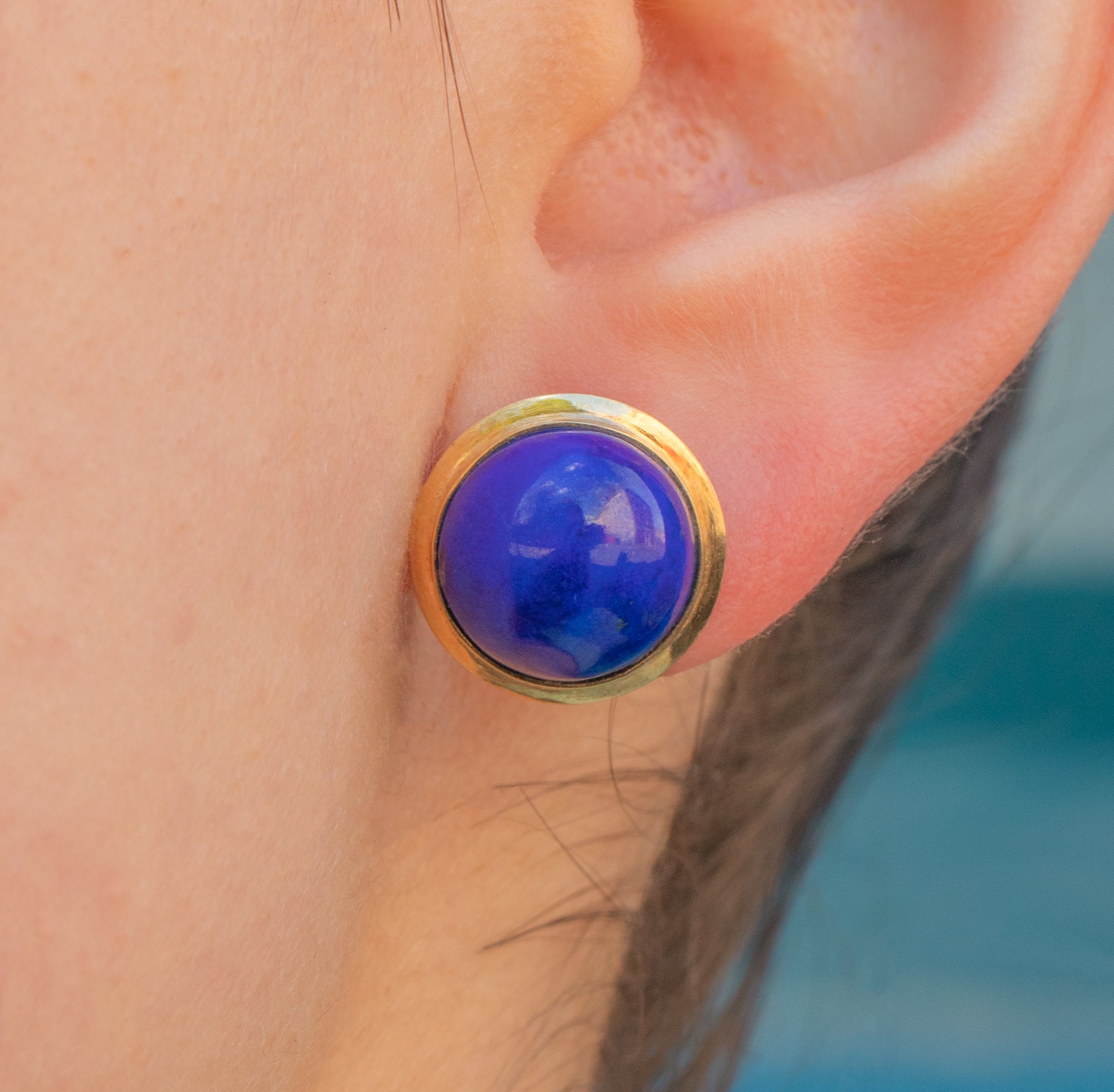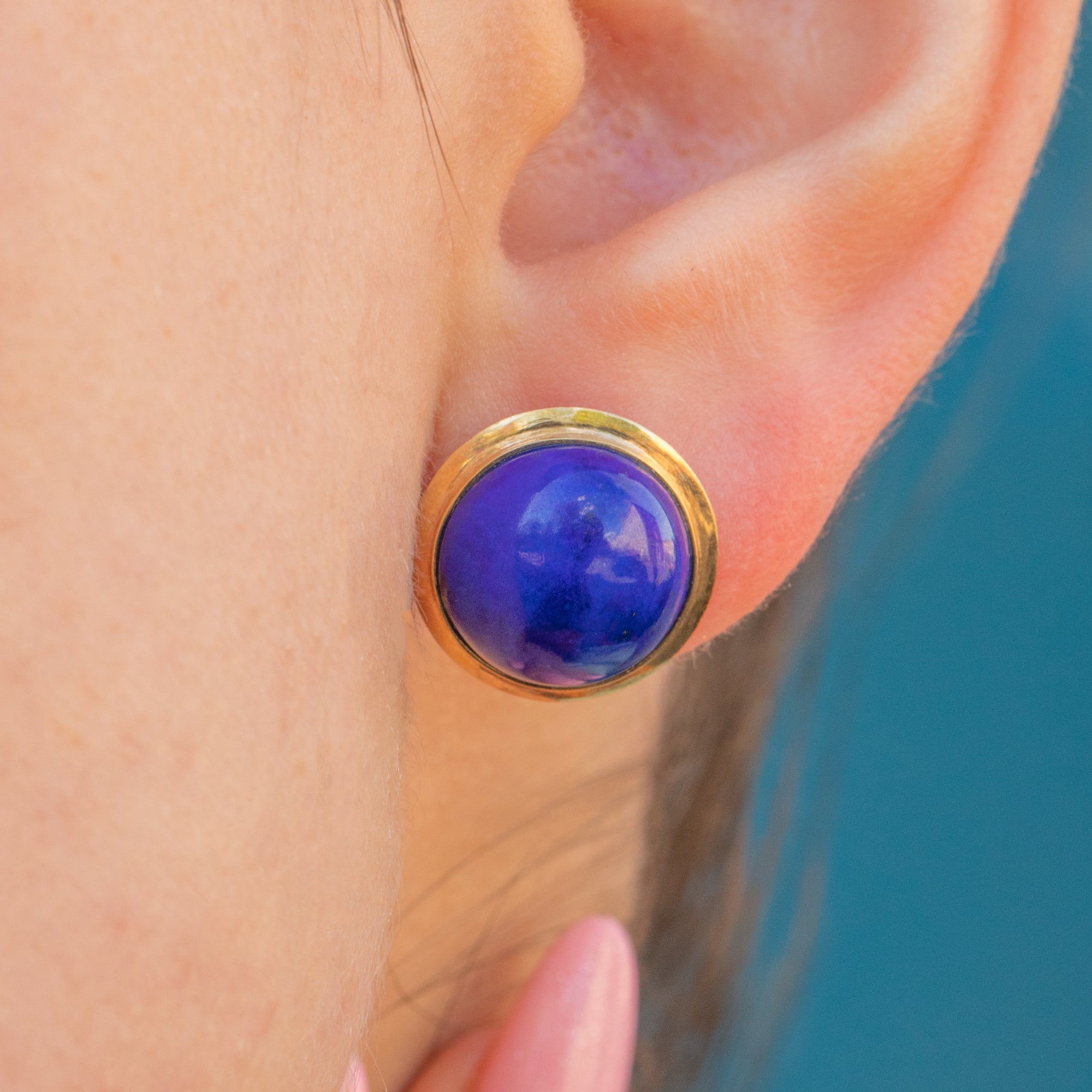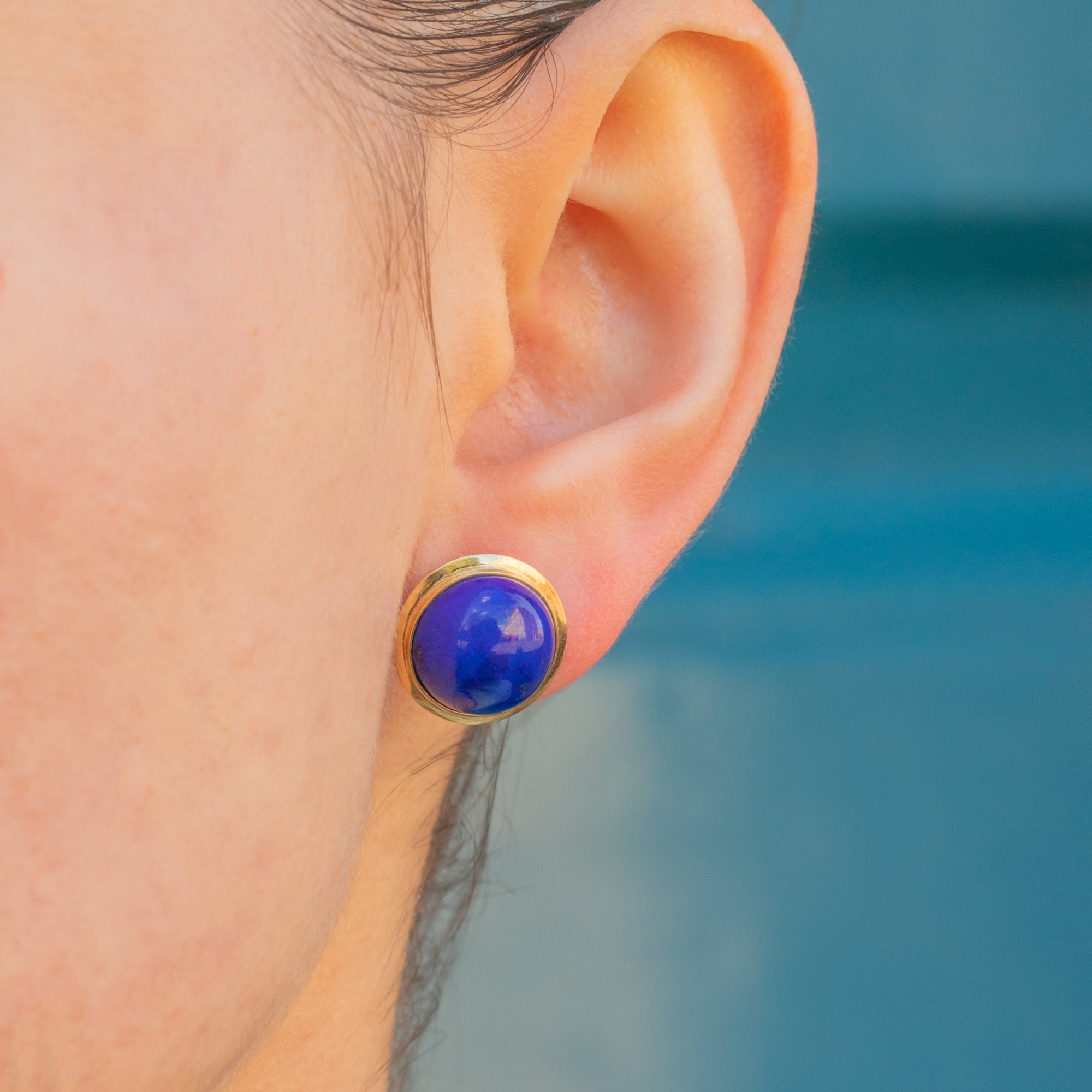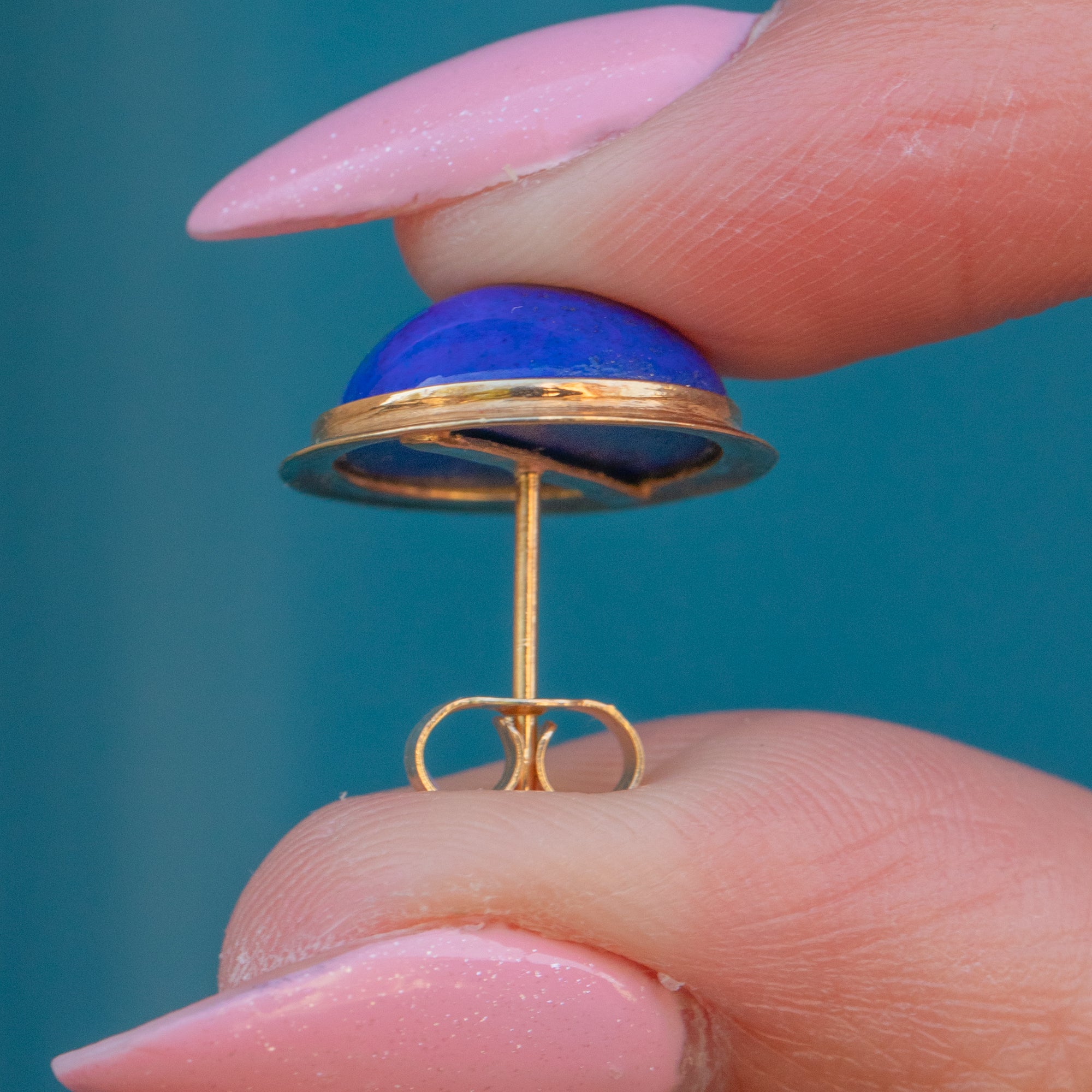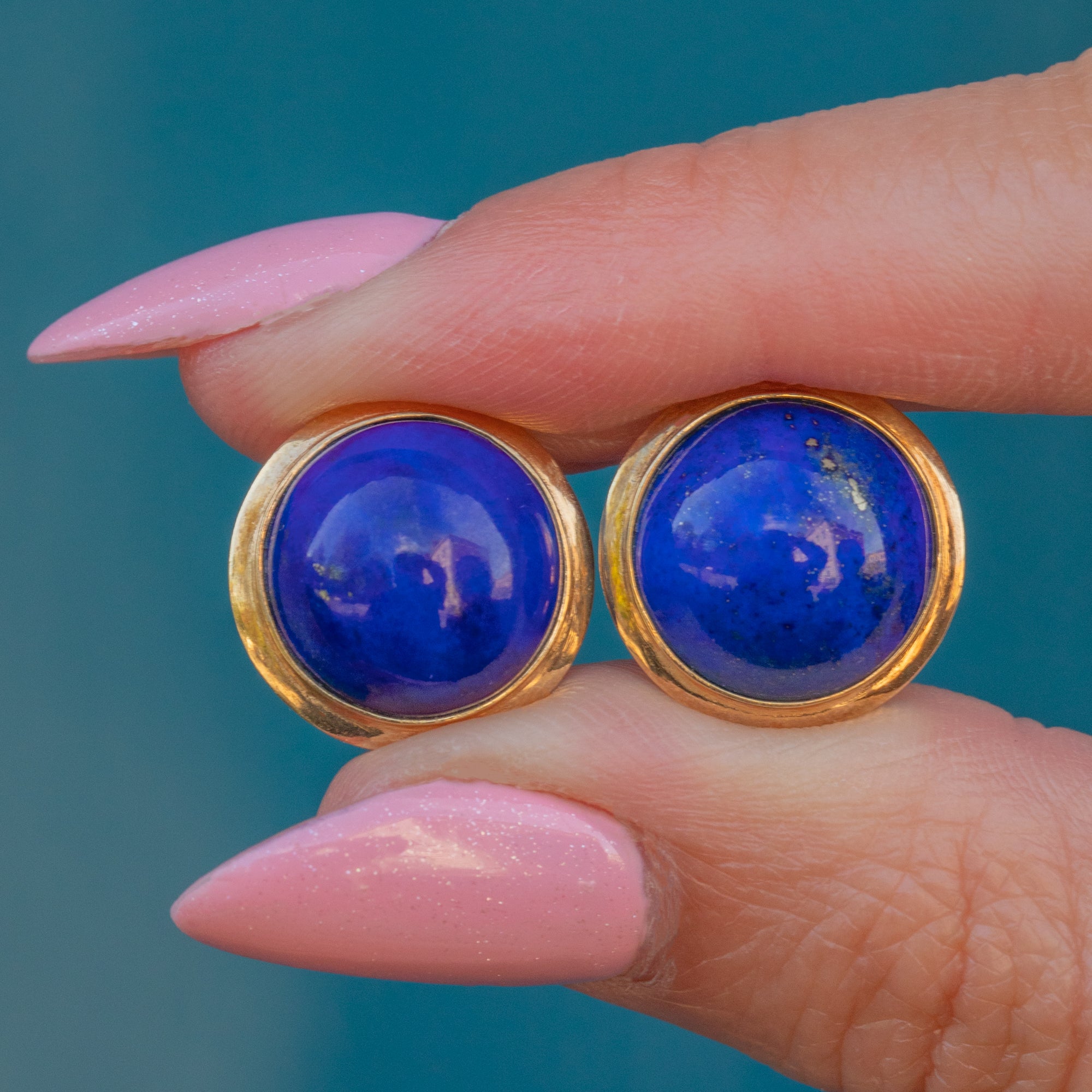 These 14ct Gold studs each boast a vibrant Lapis Lazuli cabochon, projecting a vibrant blue hue, complete with flecks of gold bursting through the surface.