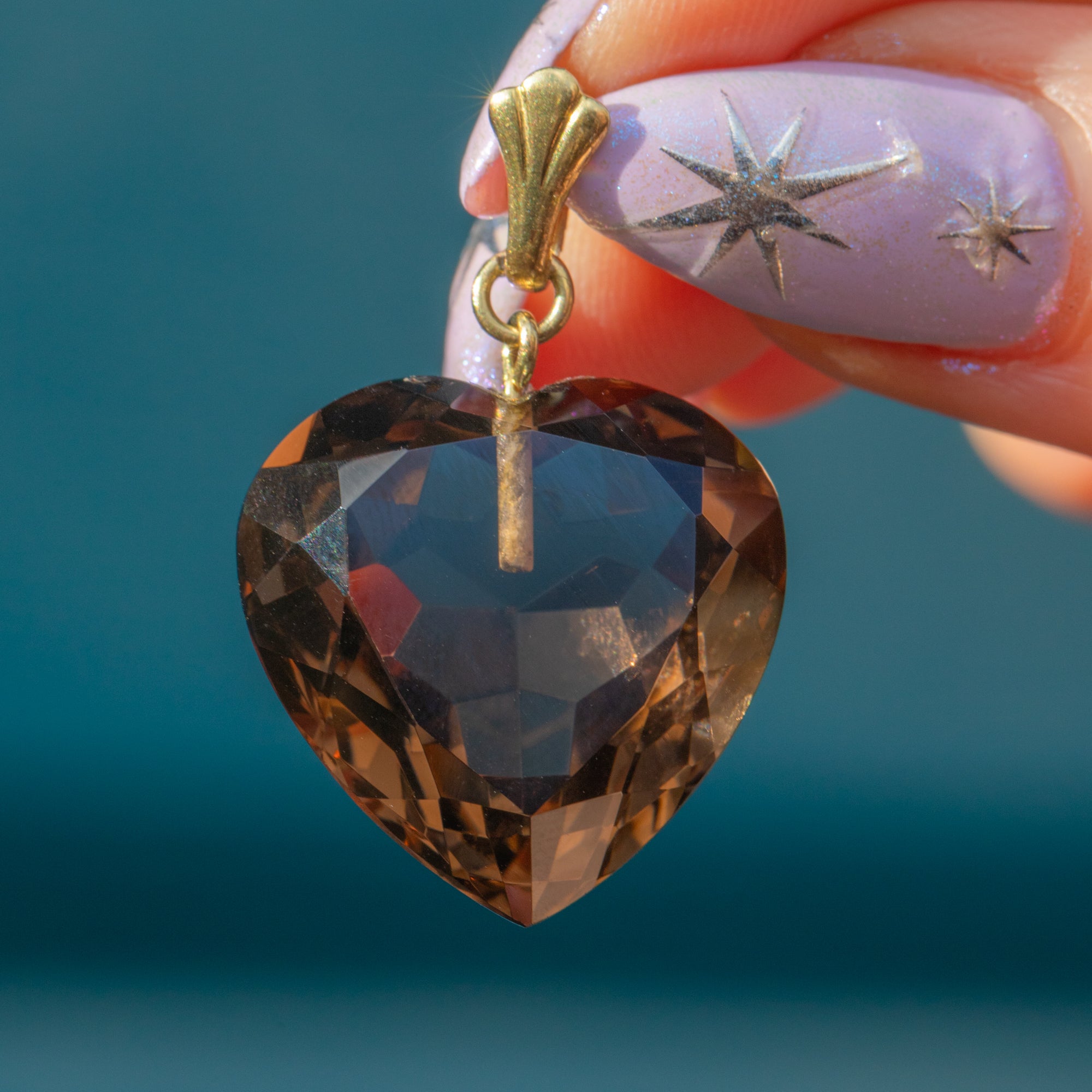 VERY GOOD. This 14ct Gold Smokey Quartz heart pendant is in very good condition. The Smokey Quartz has a magnificent hue and crisp factes that dance in the light. There are a couple of minor nibbles near the culet of the Quartz, which are not visible from the front. The bale is firmly affixed allowing you to wear and enjoy this lovely vintage Smokey Quartz pendant with absolute confidence!