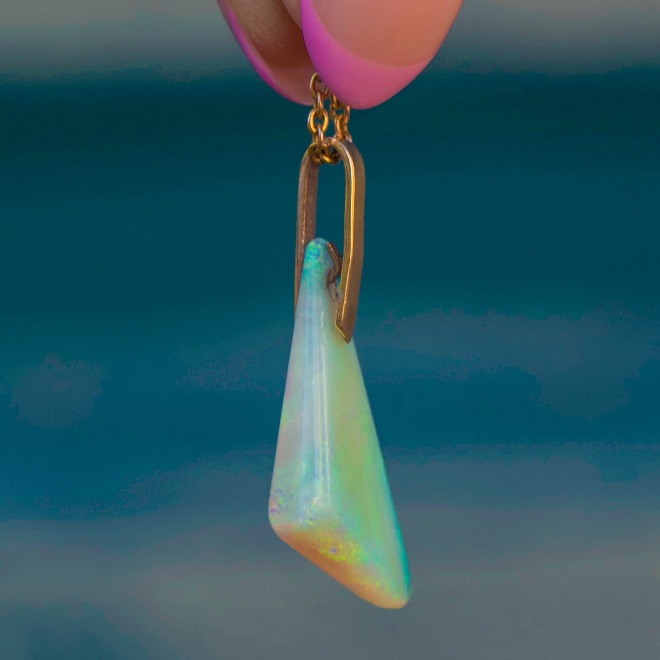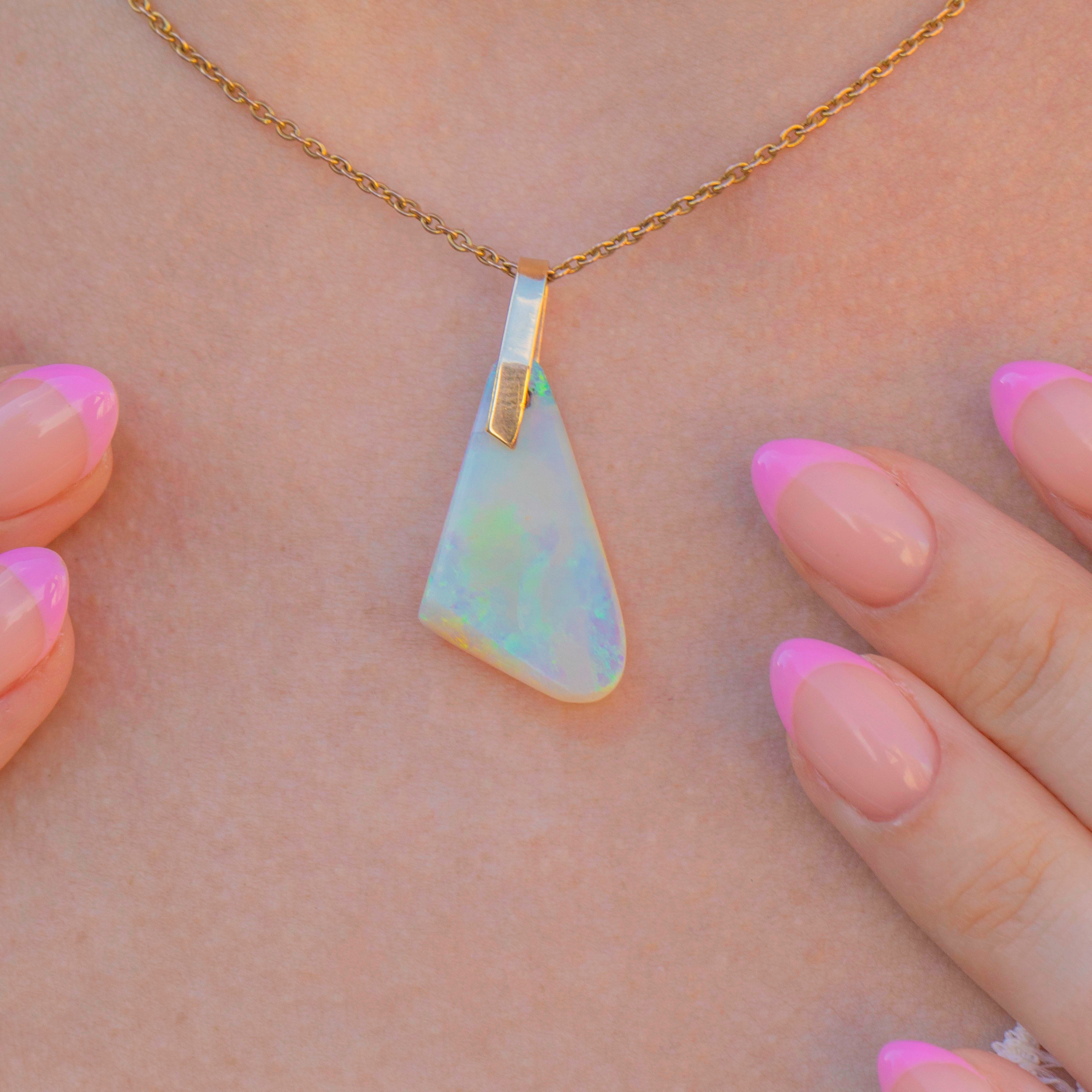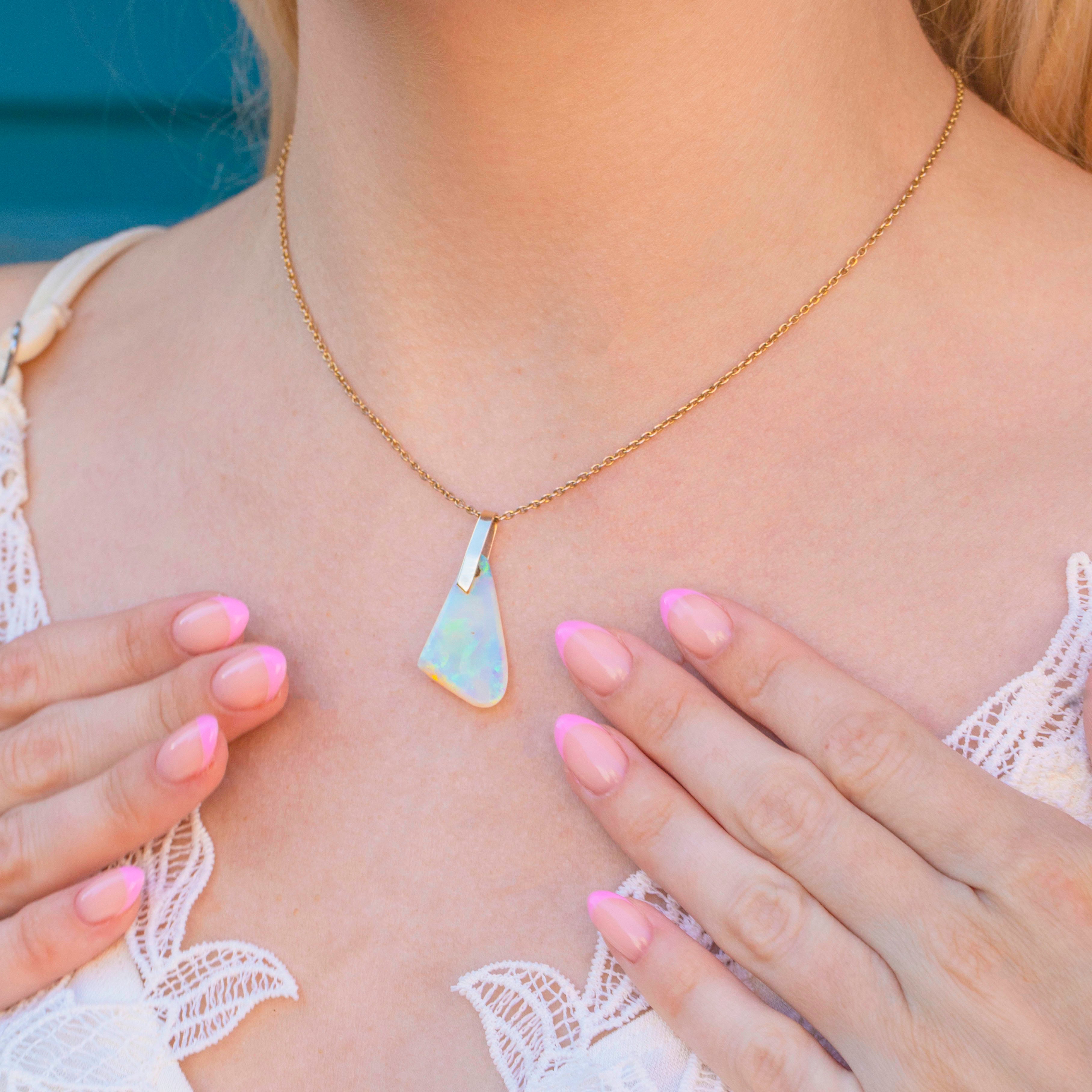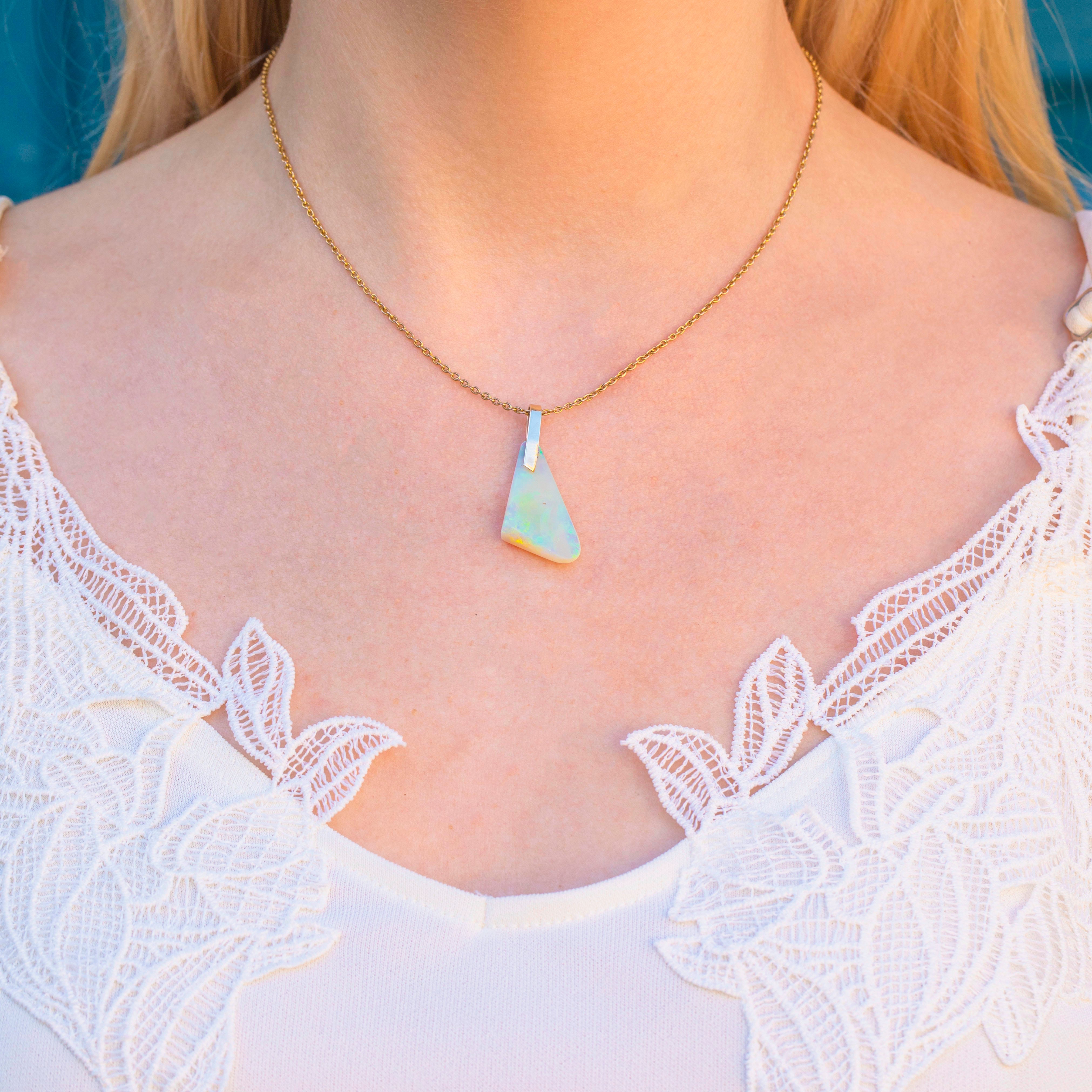 This 14ct Gold Solid Opal Pendant is simply incredible. This rare beauty boasts an impressive Opal displaying an iridescent cascade of colours within, from vivid blues to fiery orange, this piece is an eye-catching treasure!