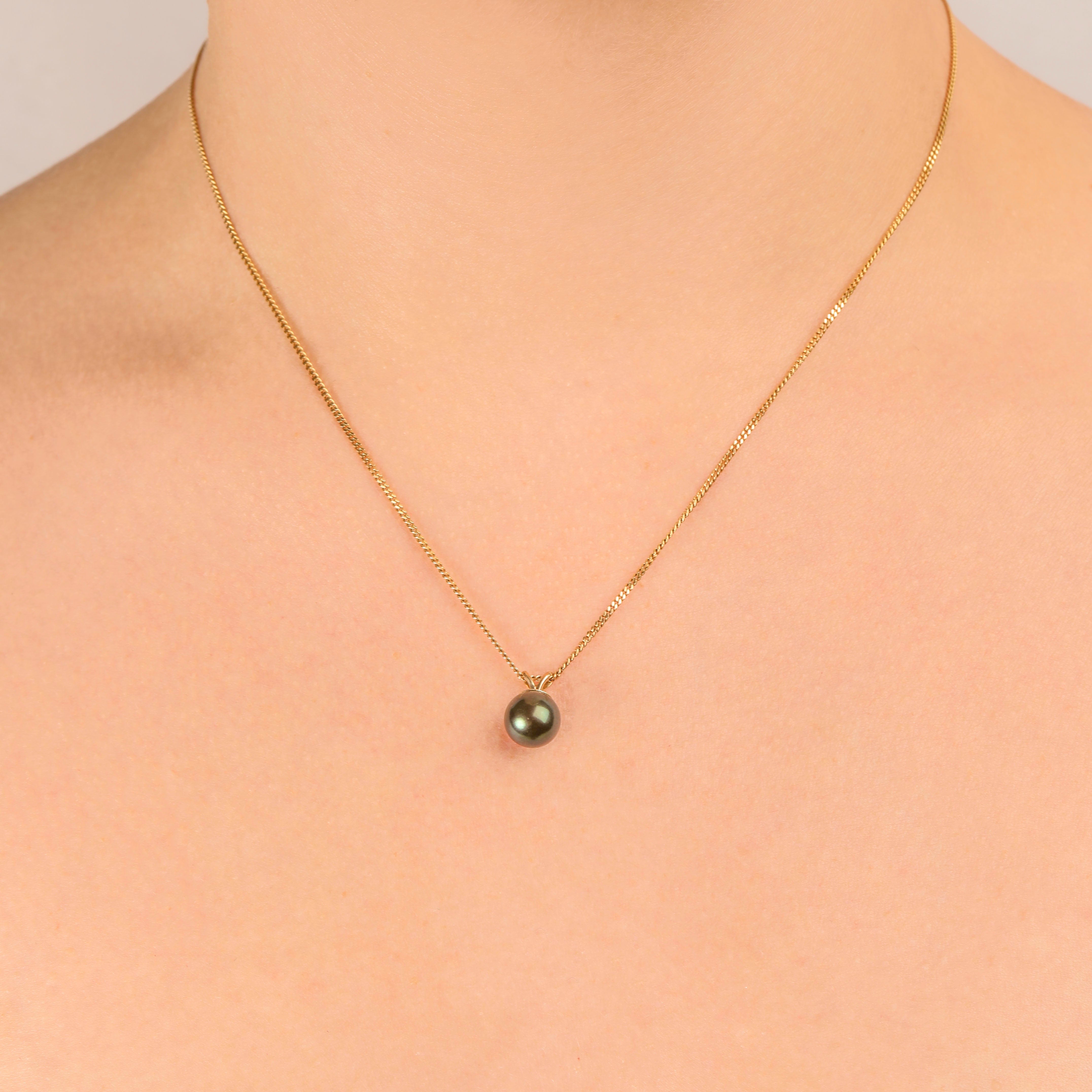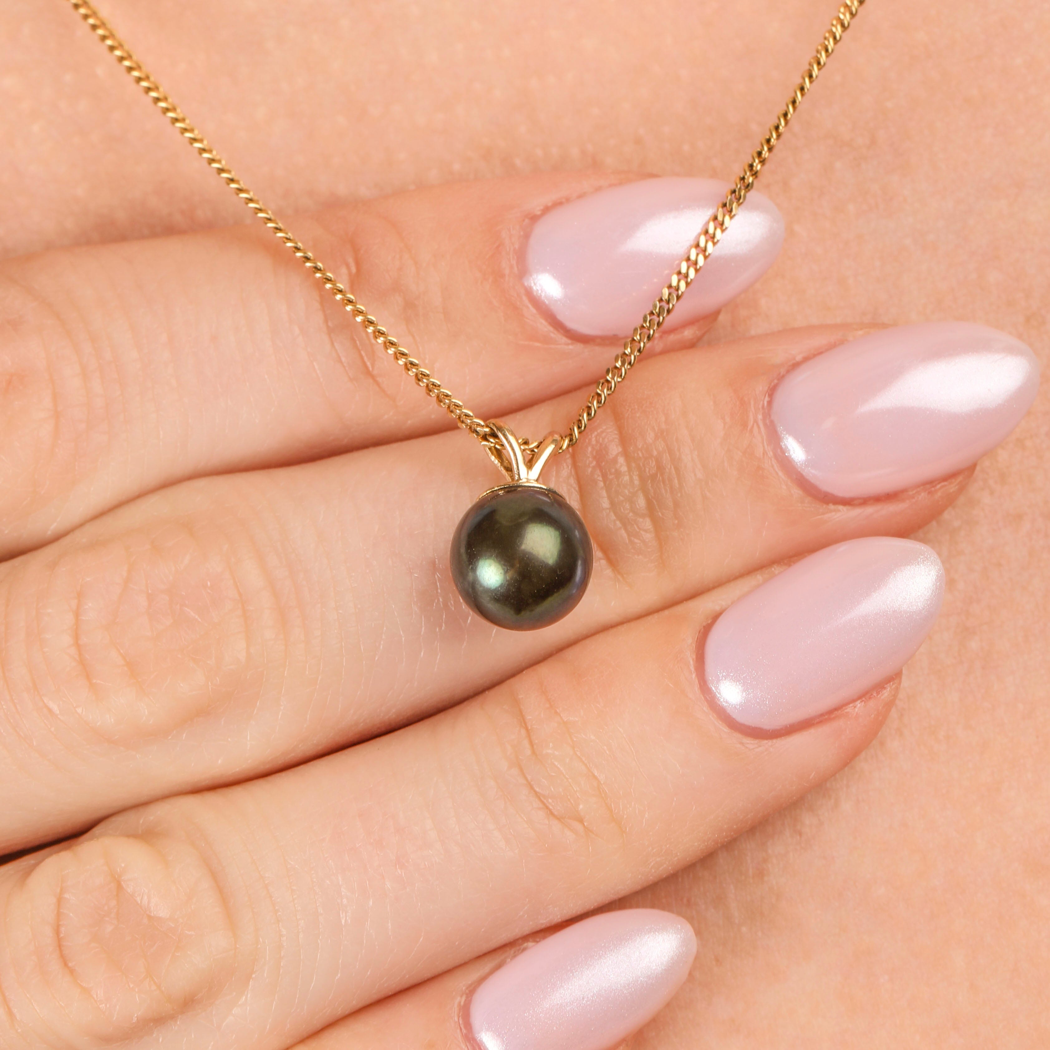 This 14ct Gold Tahitian Pearl charm pendant will make a stunning addition to your collection! Her deep blue and green hues have an ethereal quality, and the warm yellow Gold of the bale perfectly compliments the iridescence of the black Tahitian Pearl.