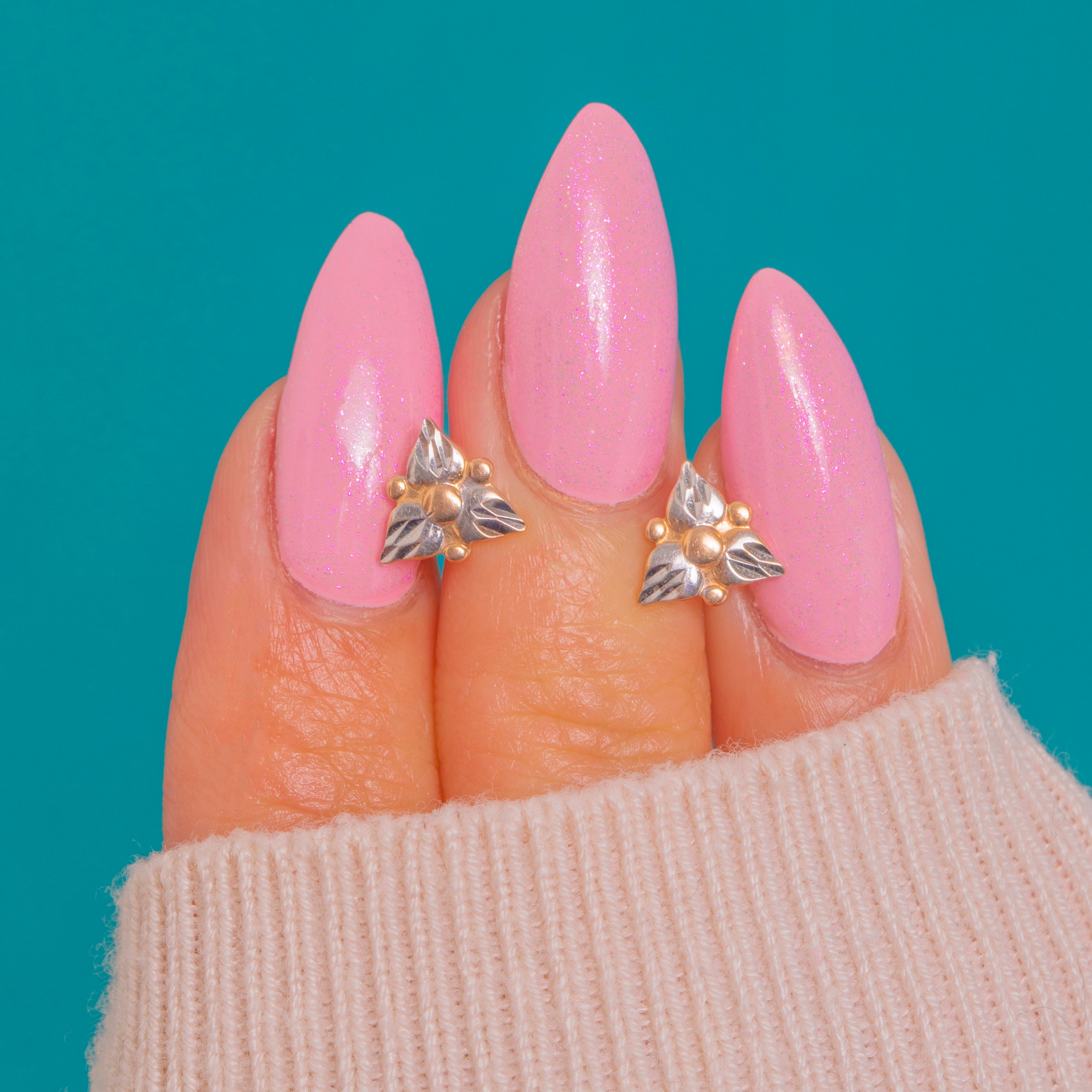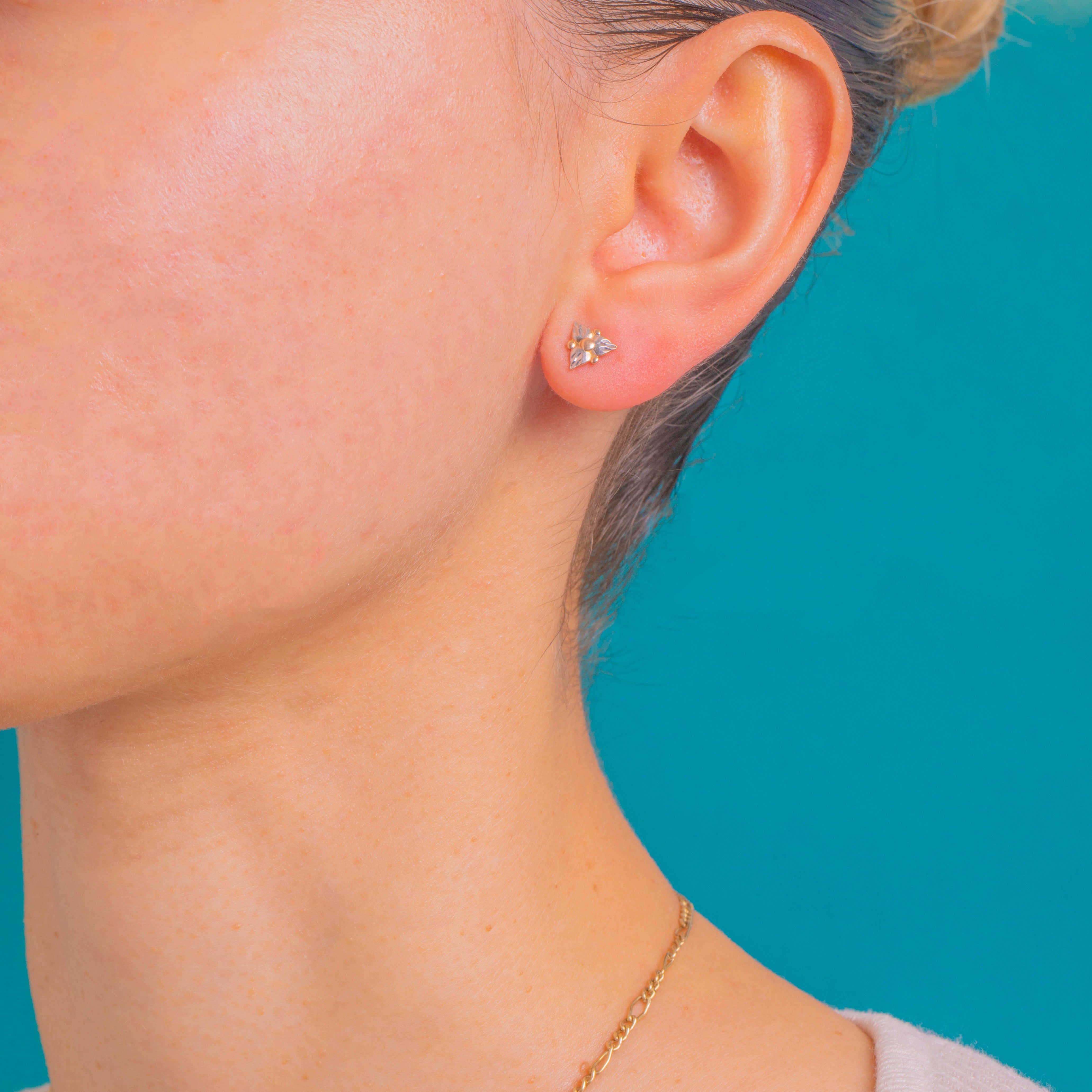 The contrasting tones of Rose and White Gold lend subtle depth and a timeless elegance, perfect for elevating everyday wear. Finished with secure screw-in backs for added peace of mind, they offer a charming dose of vintage craftsmanship in a compact silhouette.