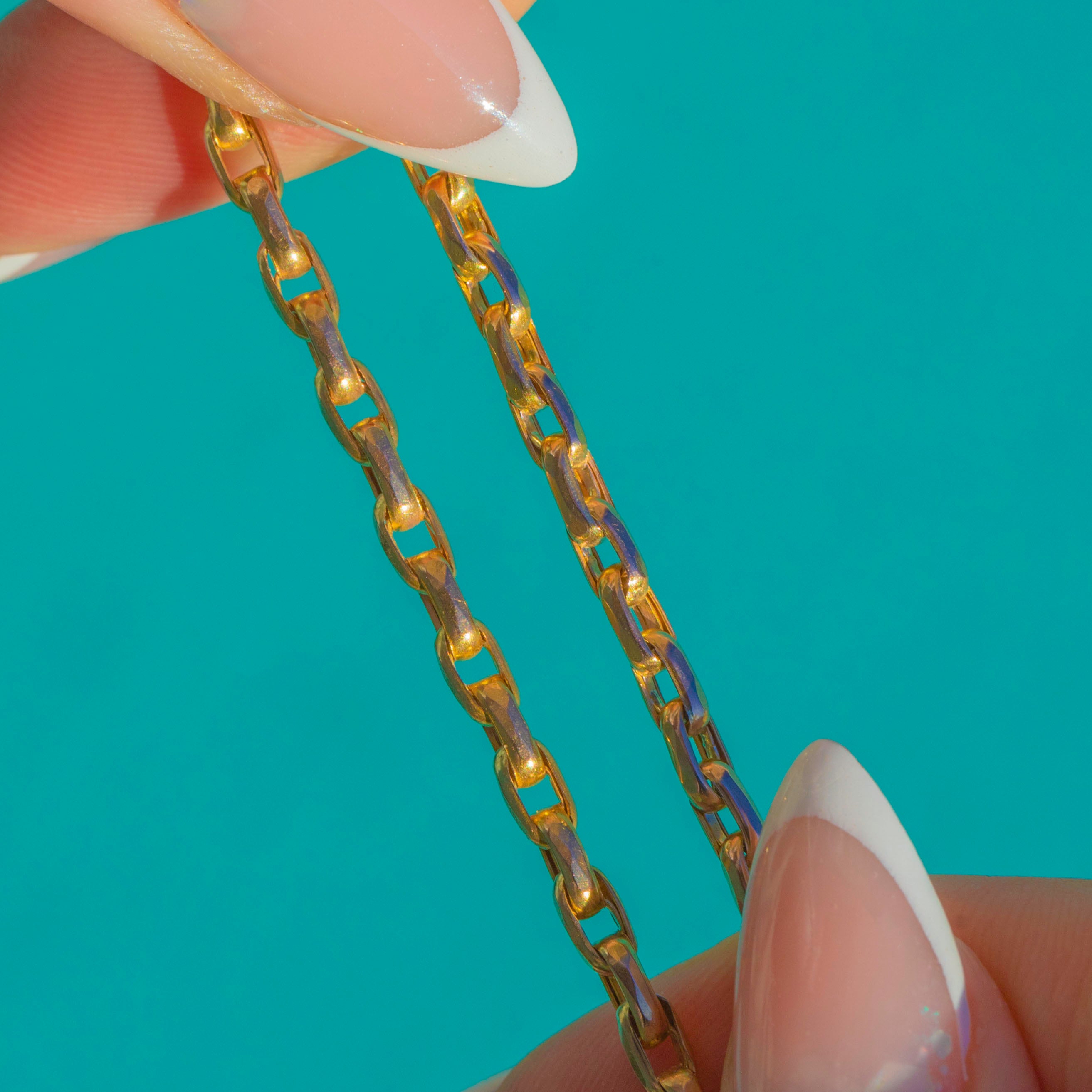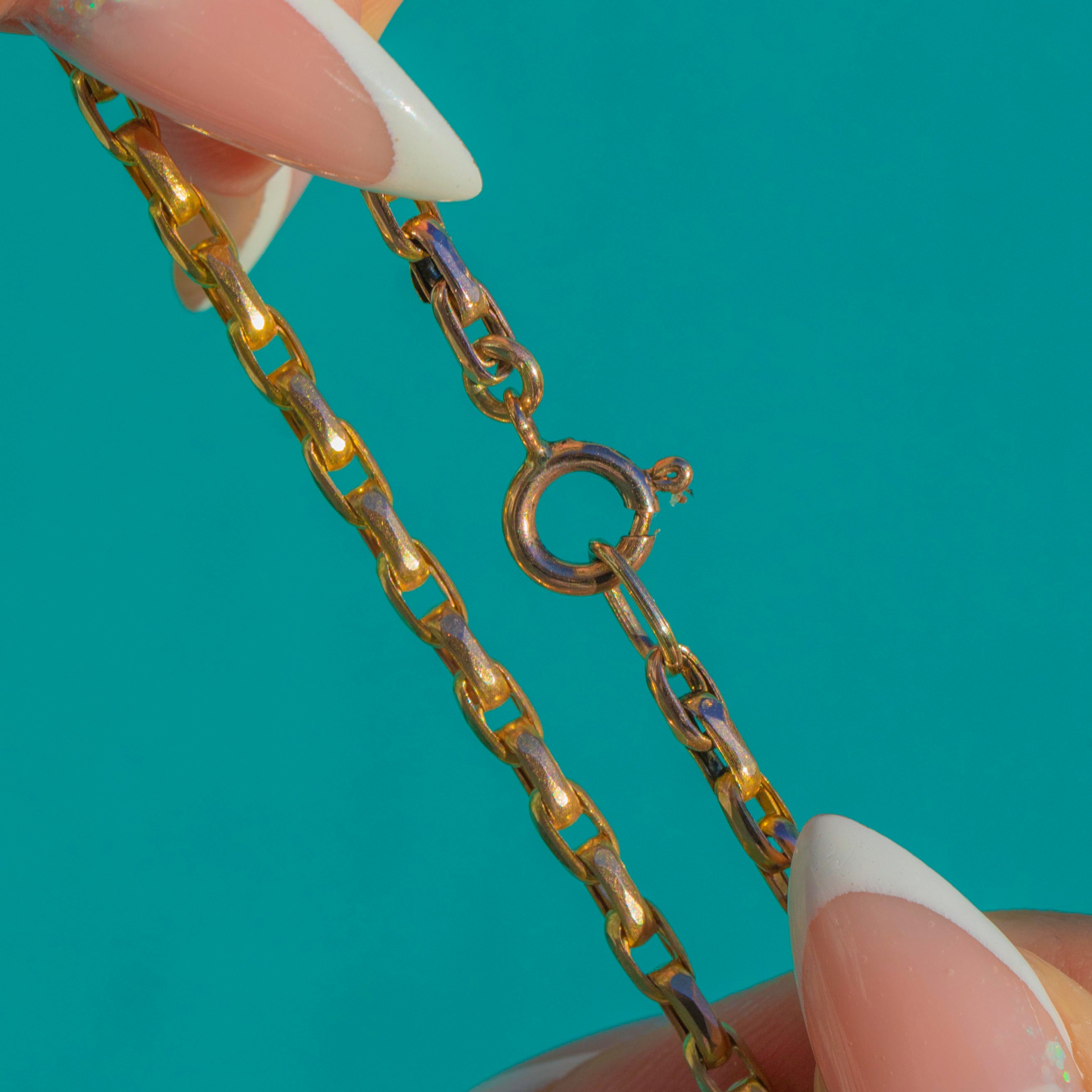 A timeless Victorian 9ct Gold chain with sleek, rectangular belcher links. Each softly faceted link glitters subtly in the light, creating an elegant drape across the décolletage.