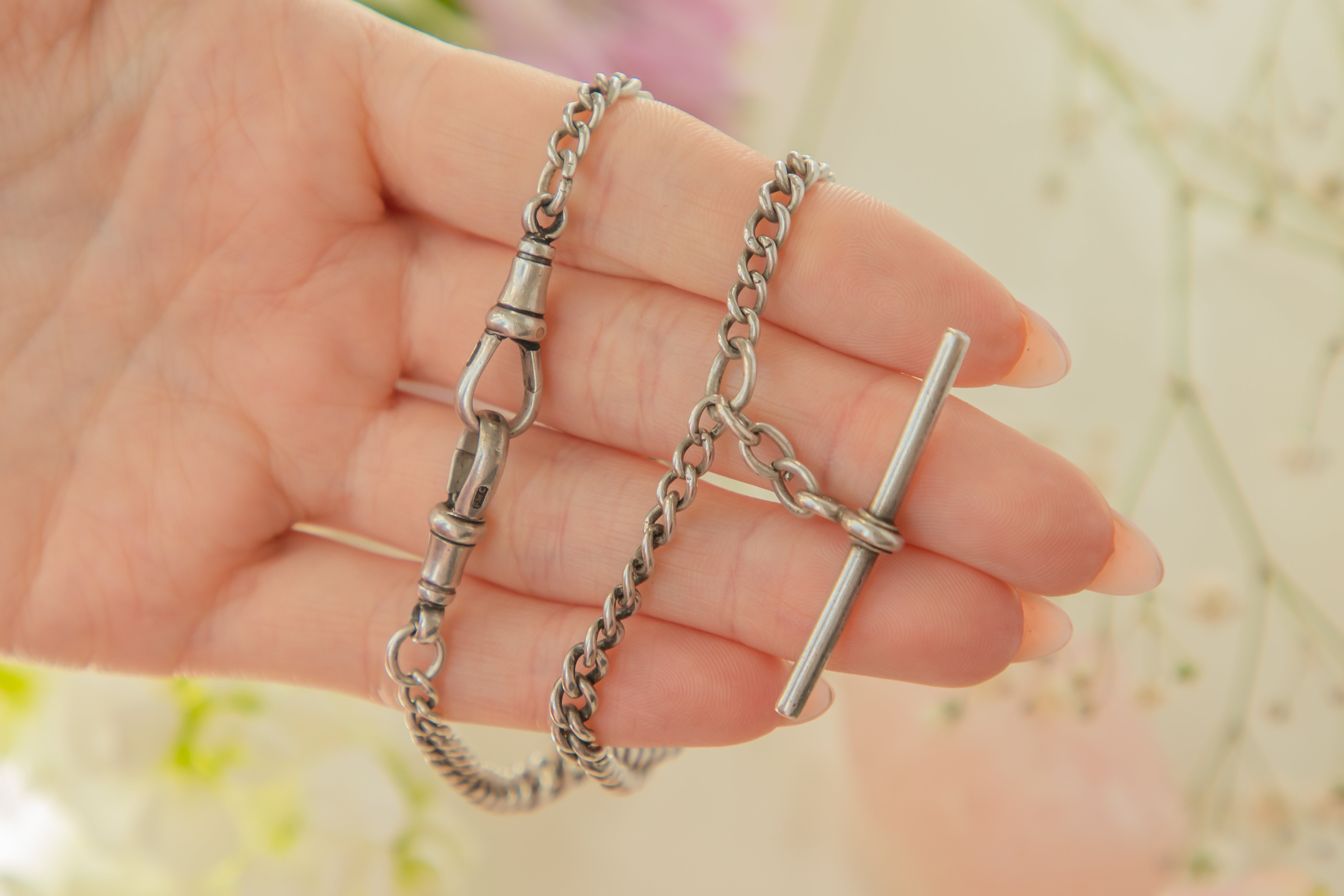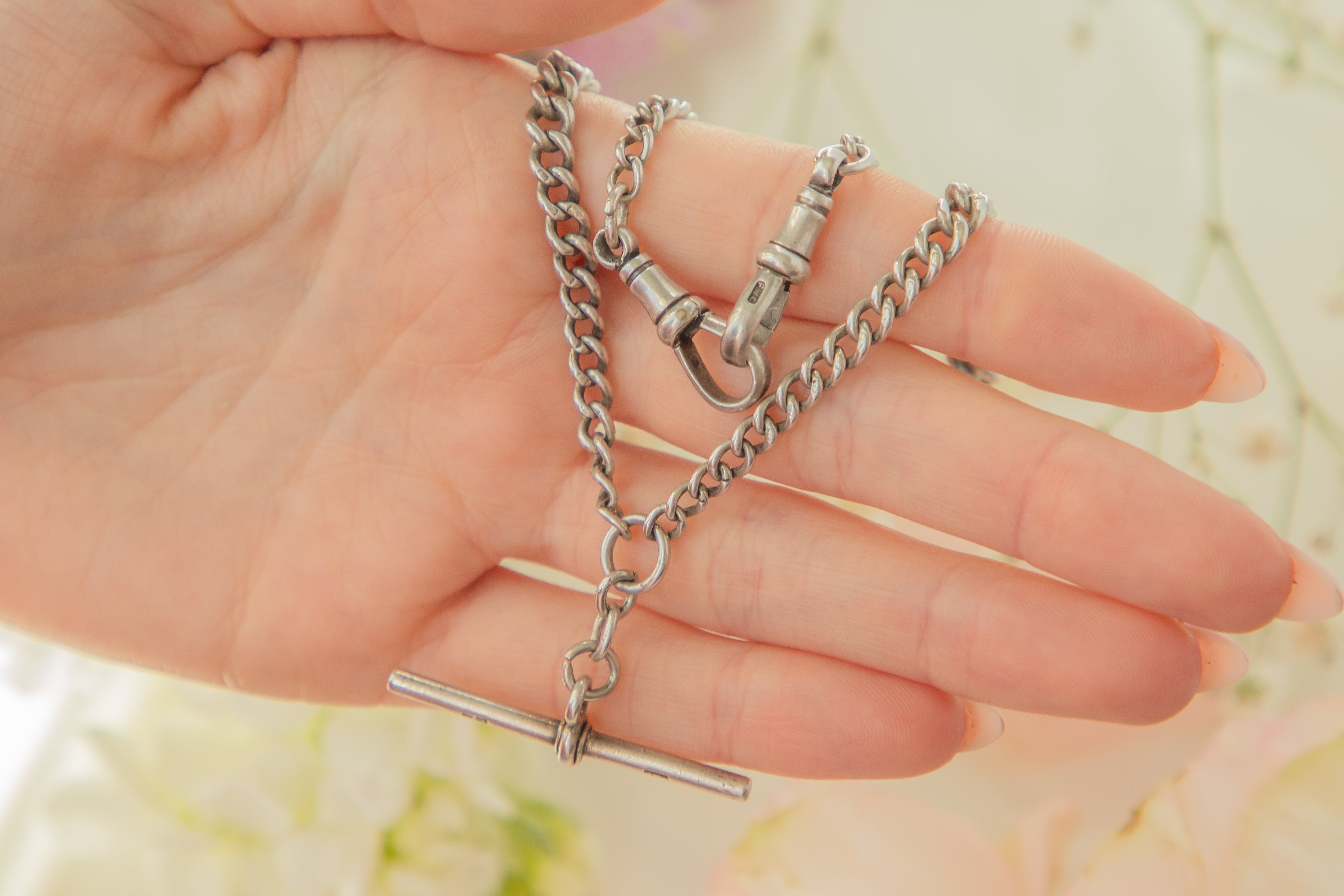 VERY GOOD. This 15.5" Sterling Silver graduating curb link Albert chain is in very good condition! The Silver is gorgeous and has accrued a desirable patina throughout. The links are robust and securely connected, each one stamped with a Lion Passant. The matching dog clips have great spring-back allowing you to wear this Edwardian Silver chain with confidence.