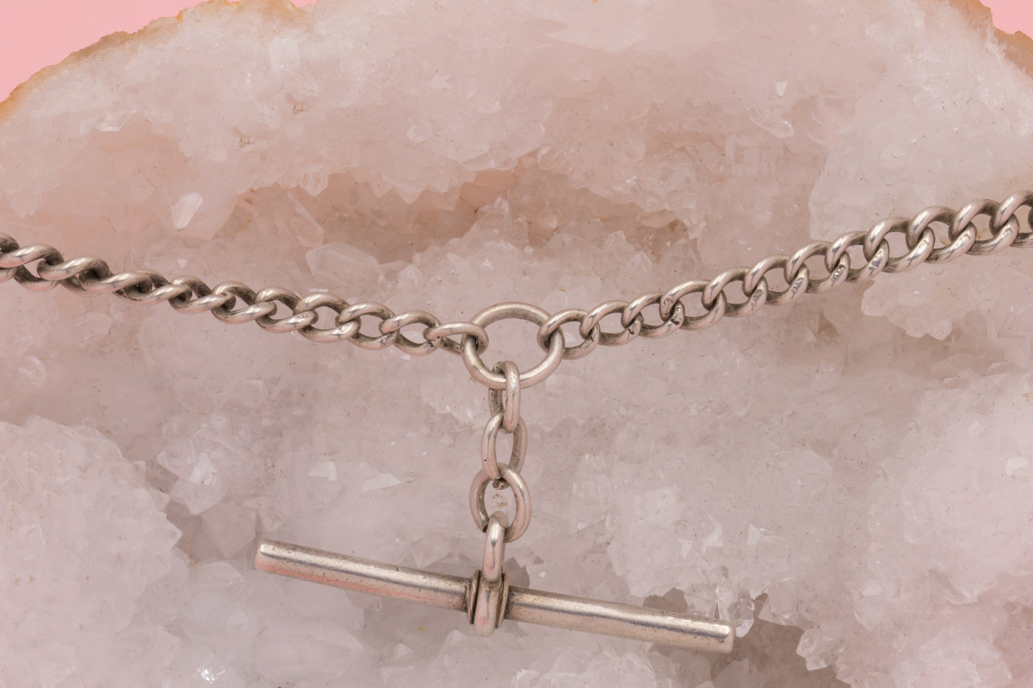We adore this 15.5" Sterling Silver graduating curb link Albert chain. This treasure would originally have been used to secure a pocket watch and fob, but now makes for a great necklace!