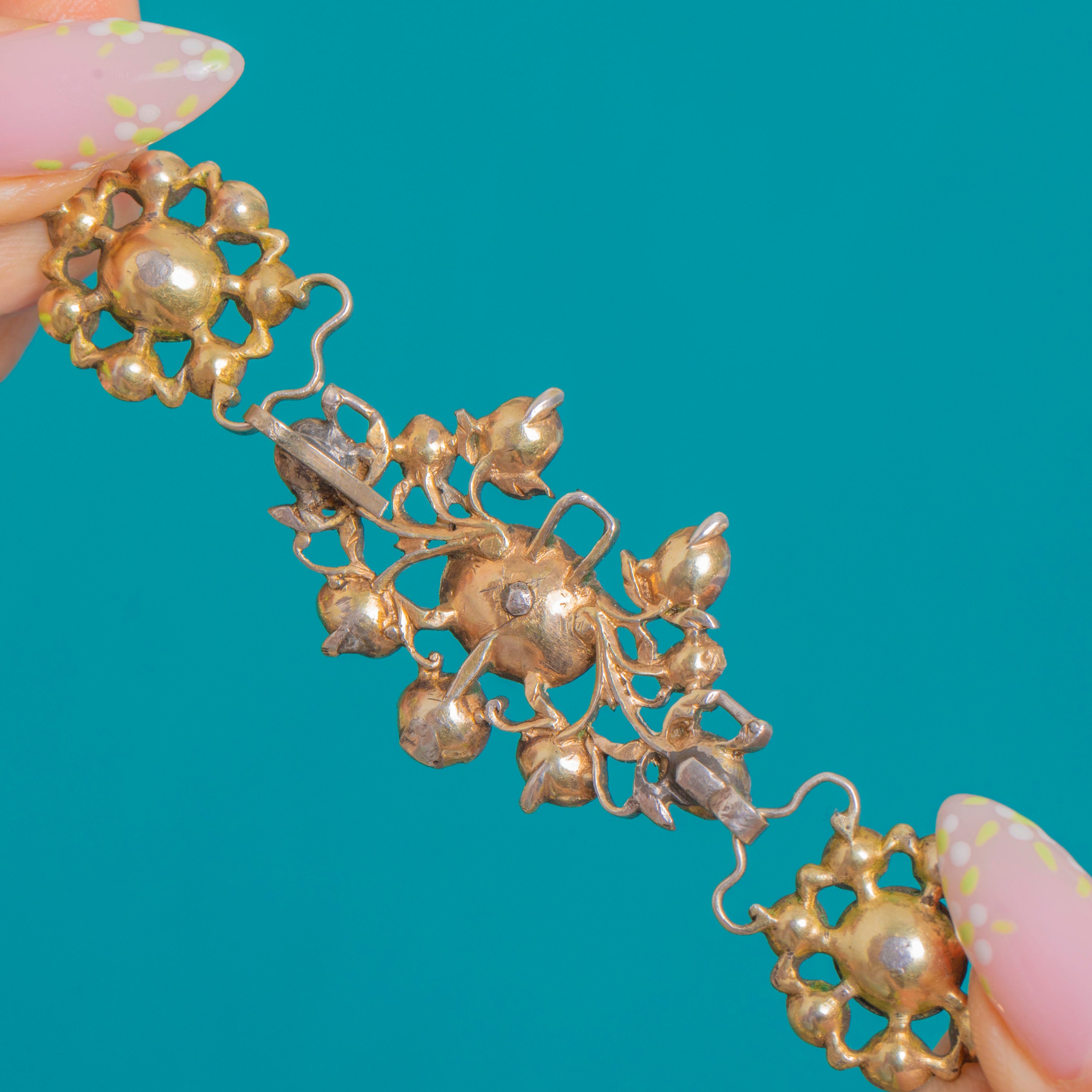 Each stone is closed-back and securely collet-set in Silver with 9ct Gold backing, the multi-part articulation allowing the necklace to drape and move beautifully. Foliate scrolls, floral rosettes and the classic girandole silhouette epitomise refined Georgian grandeur and timeless evening elegance.