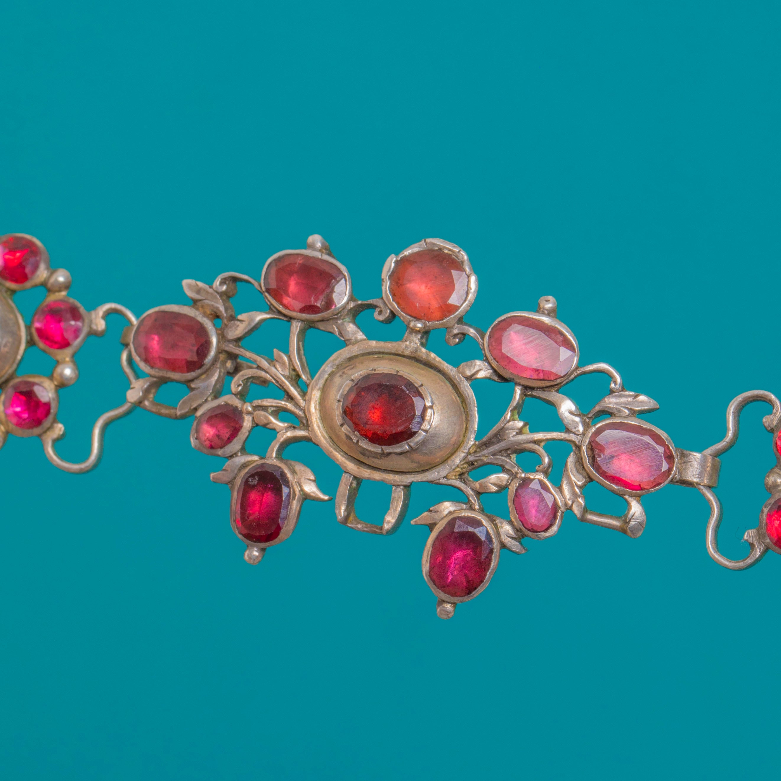 VERY GOOD: Garnets are bright with light surface abrasions; one or two display small edge chips visible under magnification. The closed-back collet settings are secure with age-related surface wear and attractive patina to the metal. Articulation and connectors are sound, with minor evidence of historic connector work; wear commensurate with age.