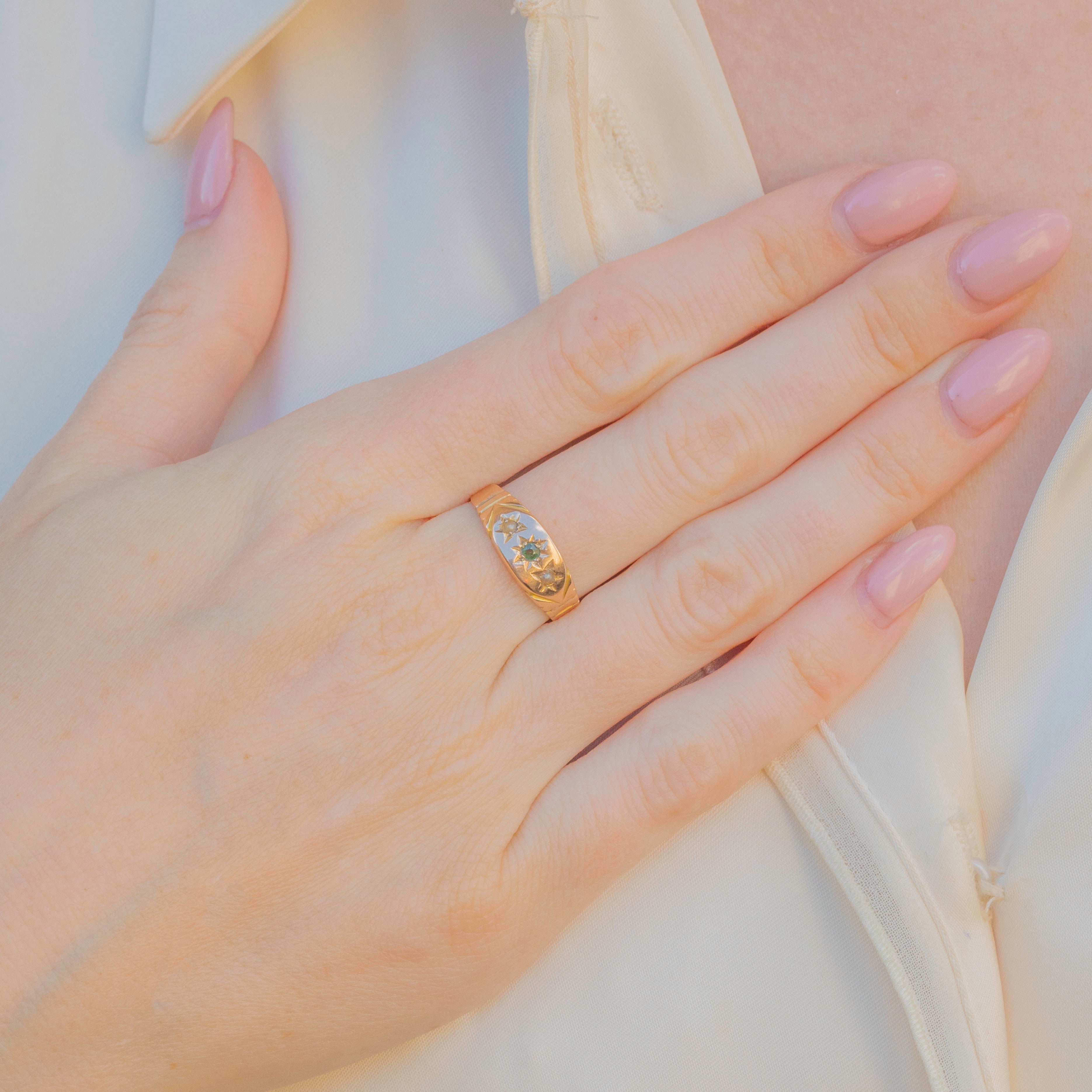 The trio of delectable gemstones sit prettily in star settings, lending this Victorian gypsy ring a celestial charm. Emeralds are rare in rings like this, making her stand out from the rest, flanked by shimmering Pearls.