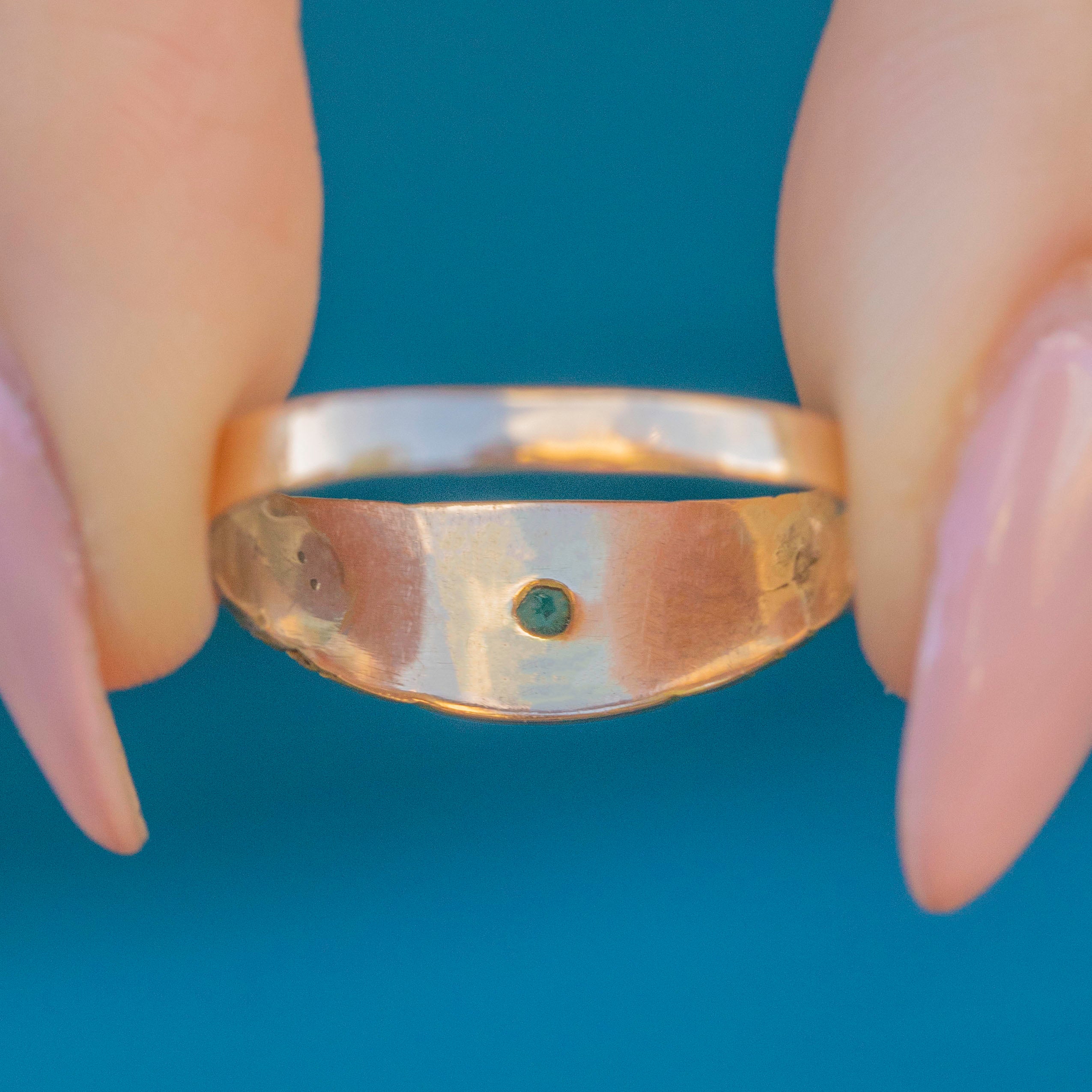 This highly wearable 15ct Gold Emerald and Pearl gypsy ring will make a resplendent addition to your curated ring stack!