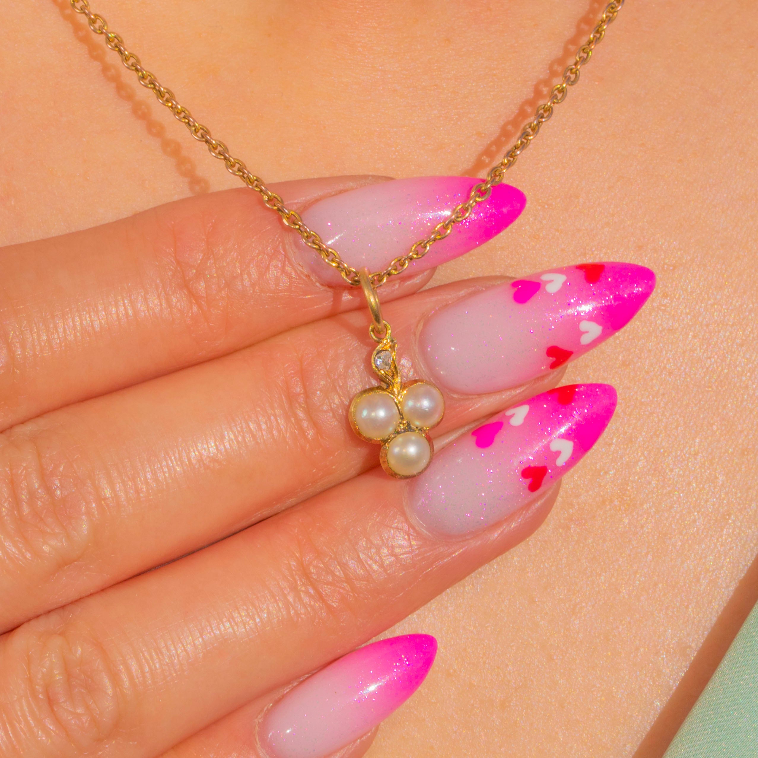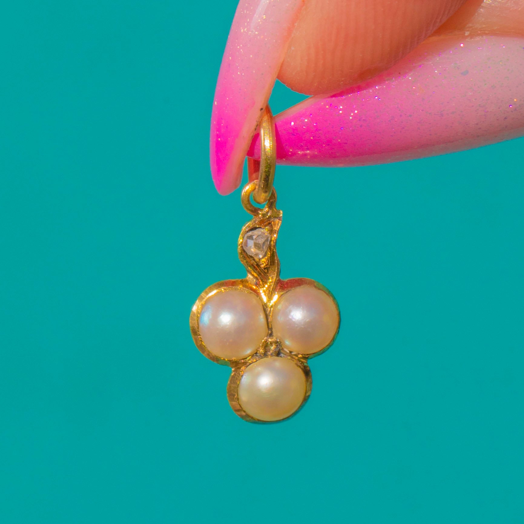 A delicate Victorian shamrock charm crafted in glowing 15ct Gold, set with three creamy Natural Pearls that form a graceful trefoil. Poised just above is a tiny rose-cut Diamond, lending a subtle sparkle that beautifully complements the Pearls’ soft lustre. Finished with an 18ct Gold jump ring, it’s a sweet token of luck with timeless elegance.
