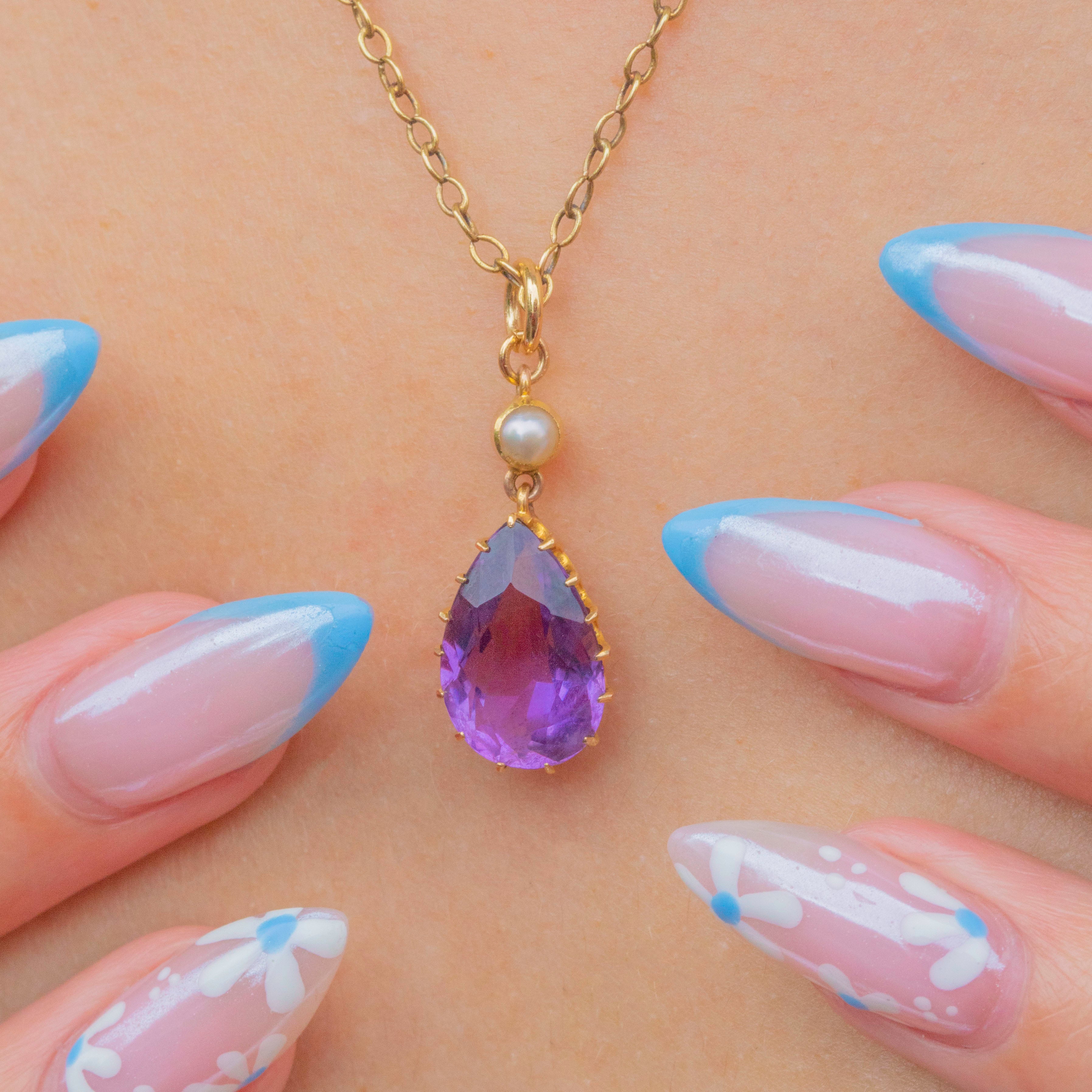 The Amethyst is adorned by a lustrous Pearl, dancing with movement as it suspends elegantly from a chain. This antique drop pendant will look gorgeous resting against your décolletage.
