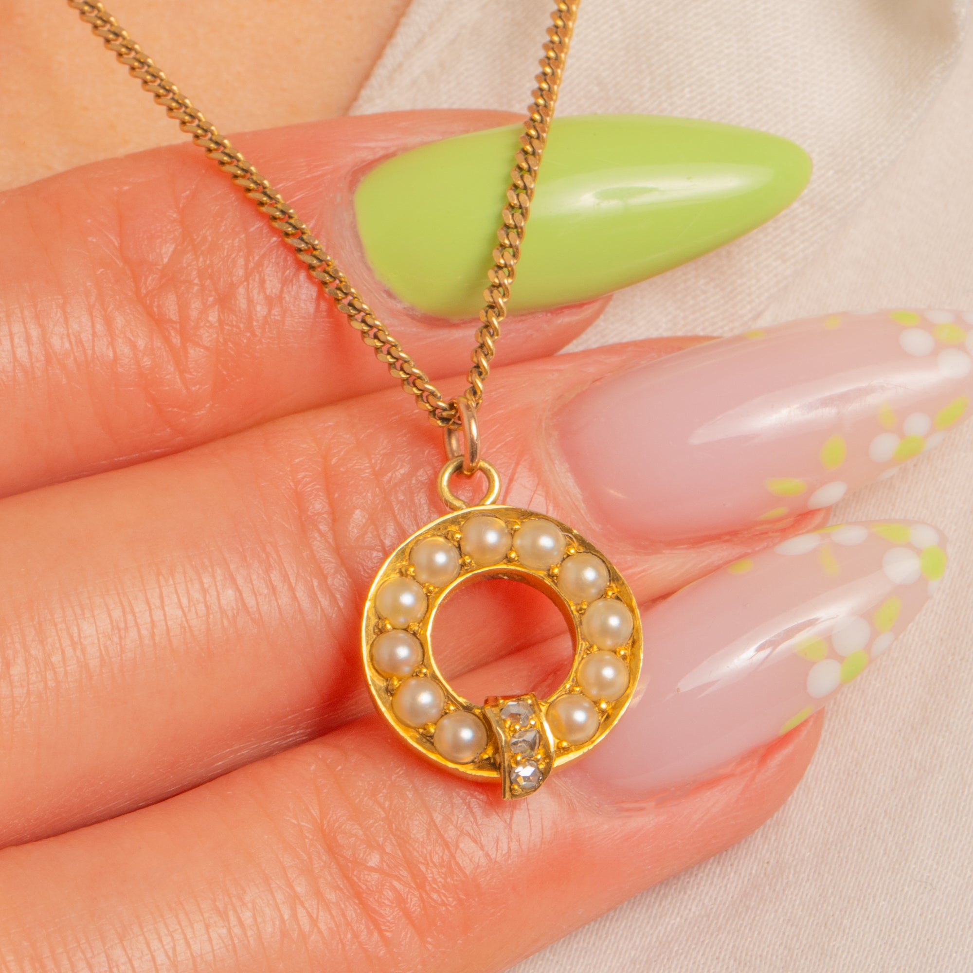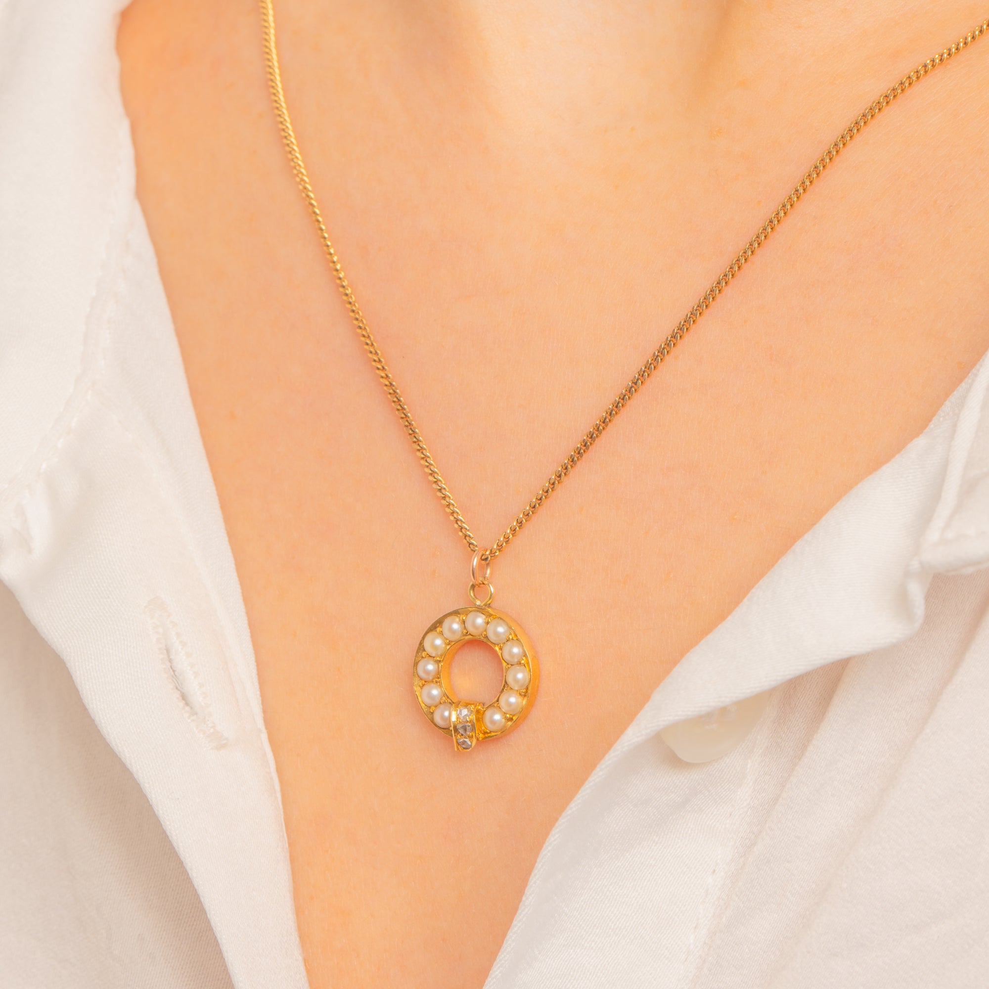 Petite and beautifully refined, this Victorian 15ct Gold charm forms a delicate open wreath of creamy Seed Pearls, finished with a tiny tab set with a trio of twinkling Rose-Cut Diamonds. The warm glow of antique Gold pairs perfectly with the soft lustre of the Pearls, while the Diamonds add a subtle, romantic sparkle.