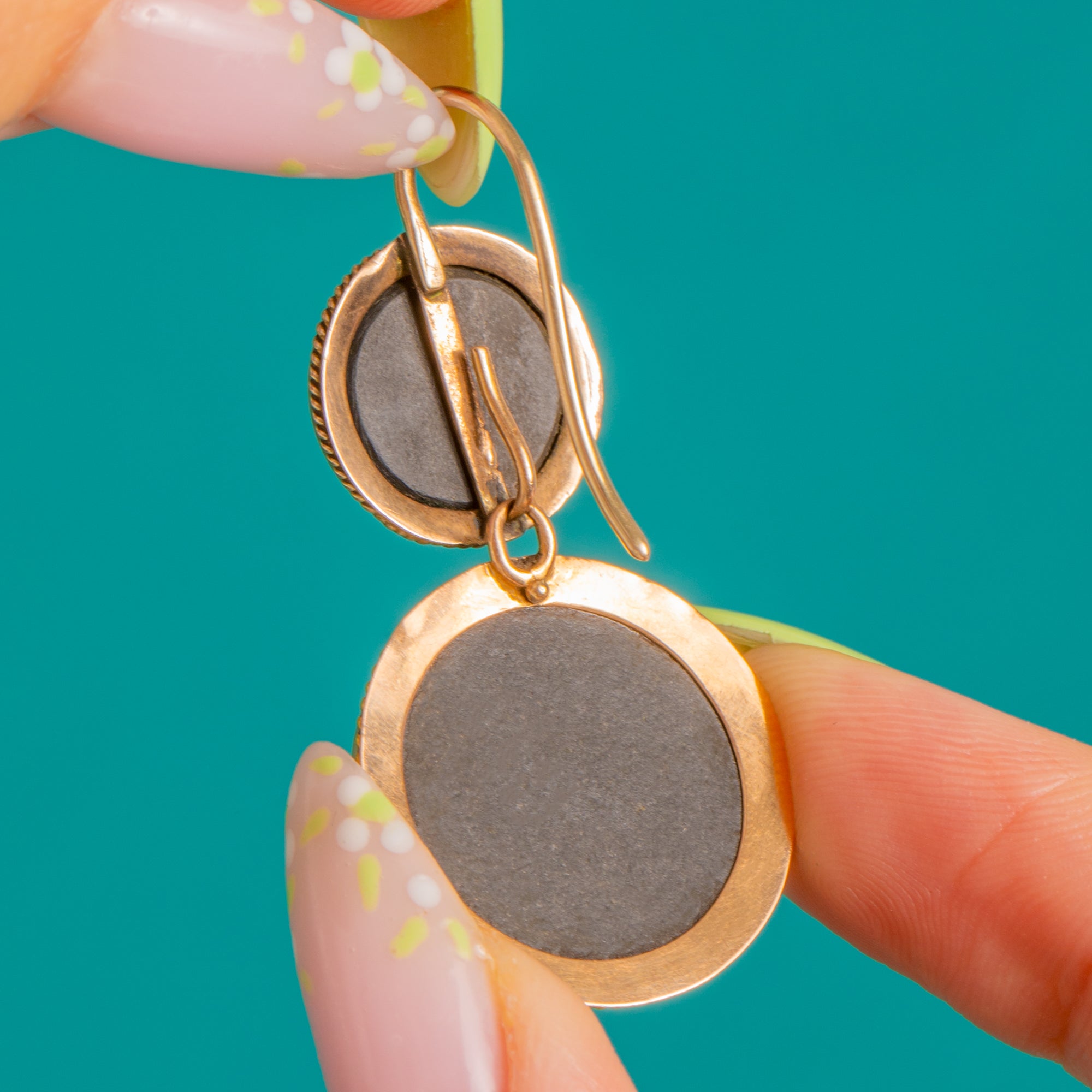 Romance and refinement abound in these Victorian 15ct Gold pietra dura double-drop earrings. Each articulated tier showcases a velvety black roundel inlaid with a delicate floral—soft blush-white petals, olive-green leaves and a tiny turquoise accent—framed by ornate twisted-rope bezels for a beautifully finished silhouette.