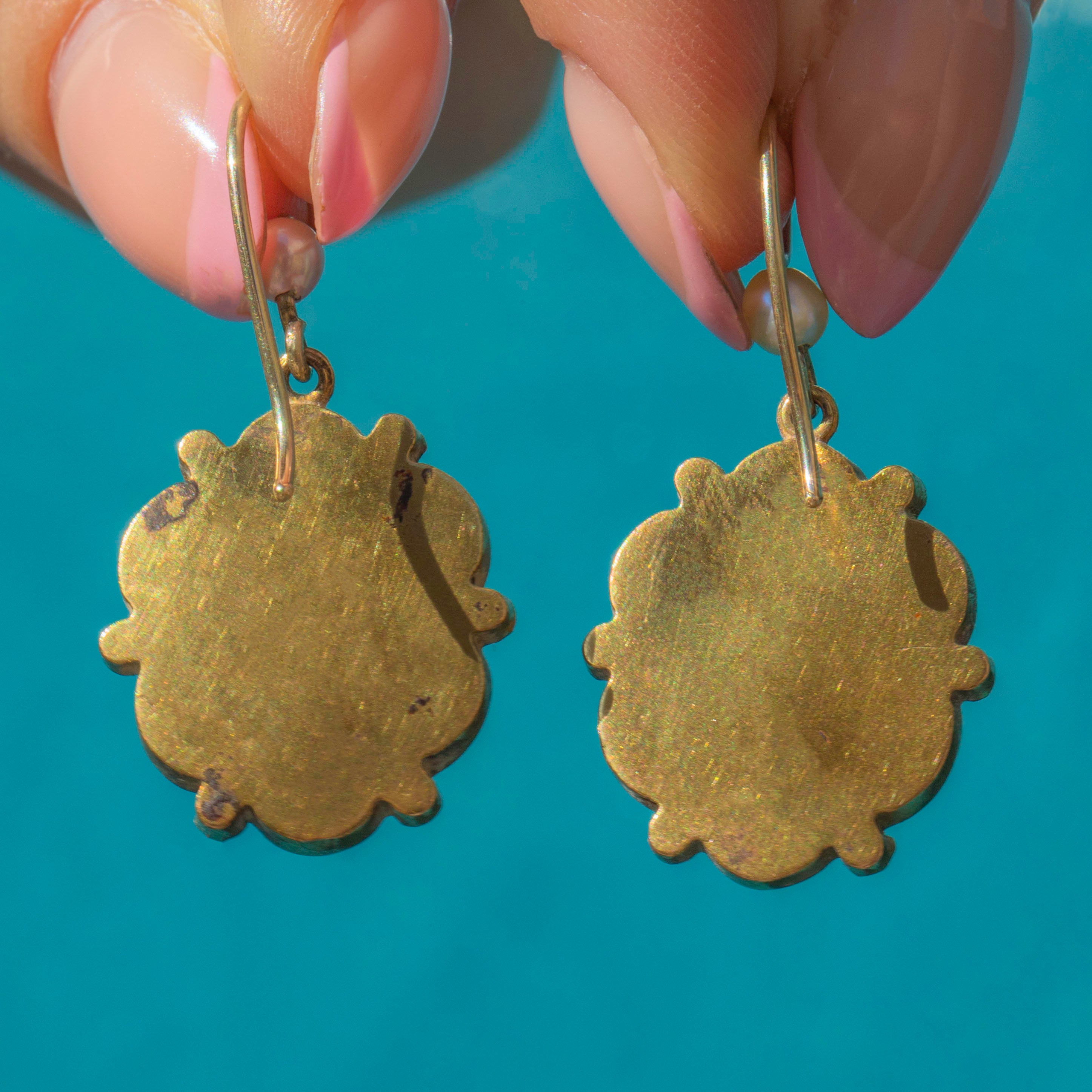 GOOD TO VERY GOOD. These Victorian 15ct Gold pink foiled Amethyst & Pearl earrings are in great antique condition. The earrings have lovely and secure Amethysts, the Pearls are all present and correct and the engravings on the outside are divine. On the back of the earrings, there are some signs of wear, commensurate with age, and discolouration accrued over the years, but this won't be noticeable while the earrings are worn. With slender and generously sized earring hooks, these fabulous antique Amethyst earrings can be worn comfortably and with confidence!