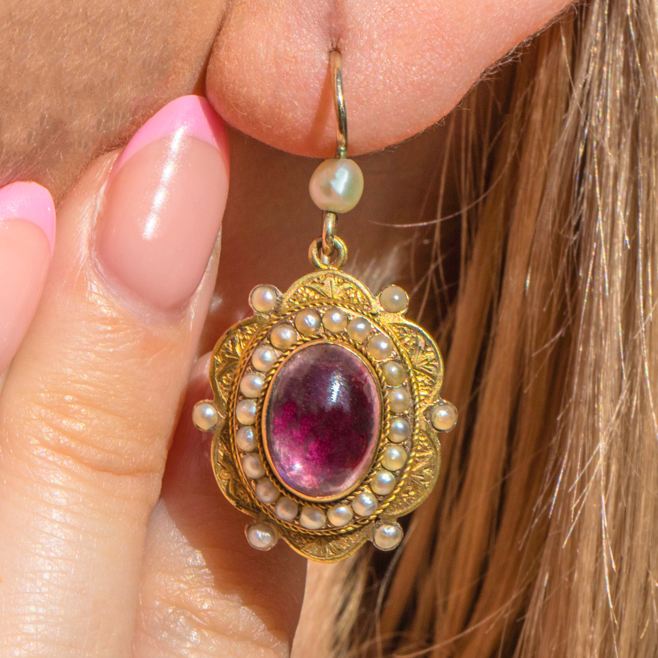 We love everything about these Victorian 15ct Gold pink foiled Amethyst & Pearl earrings! The earrings have so much beauty to absorb with engraved borders, plump Pearls and pink foiled Amethysts!