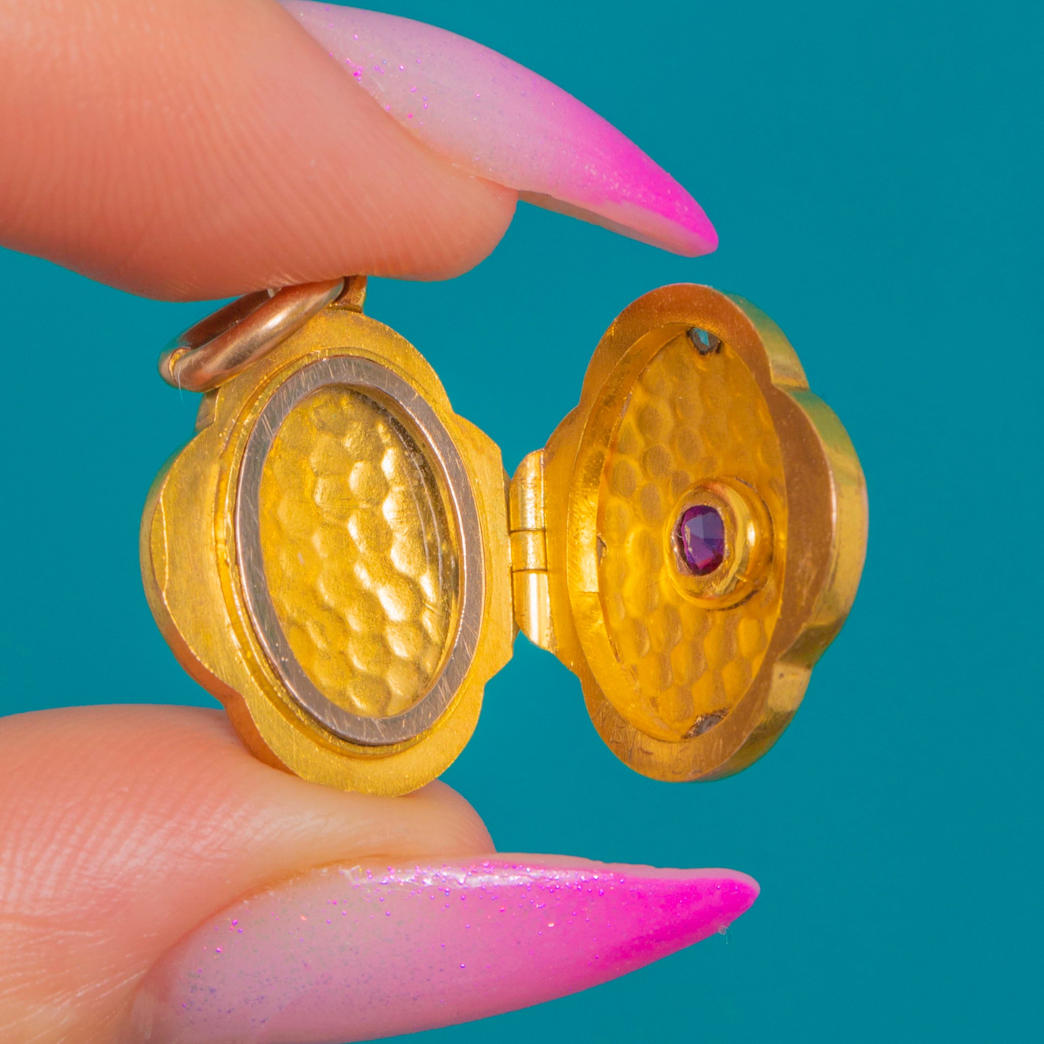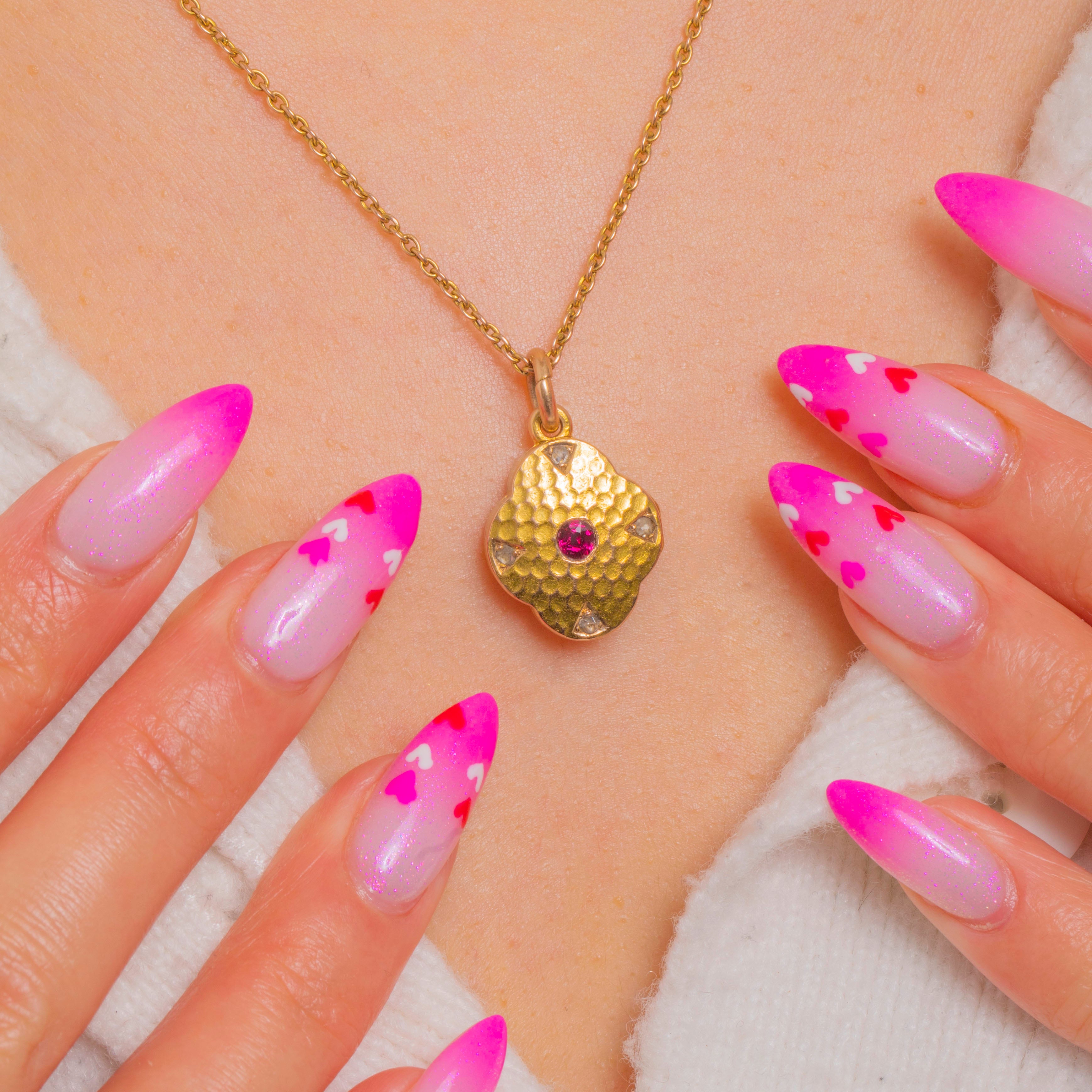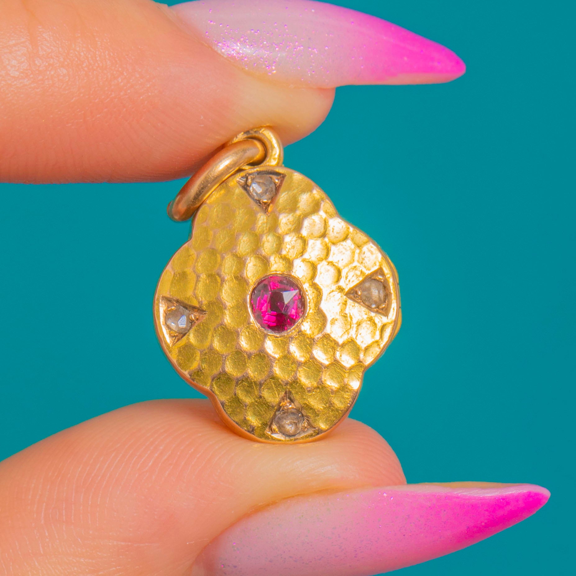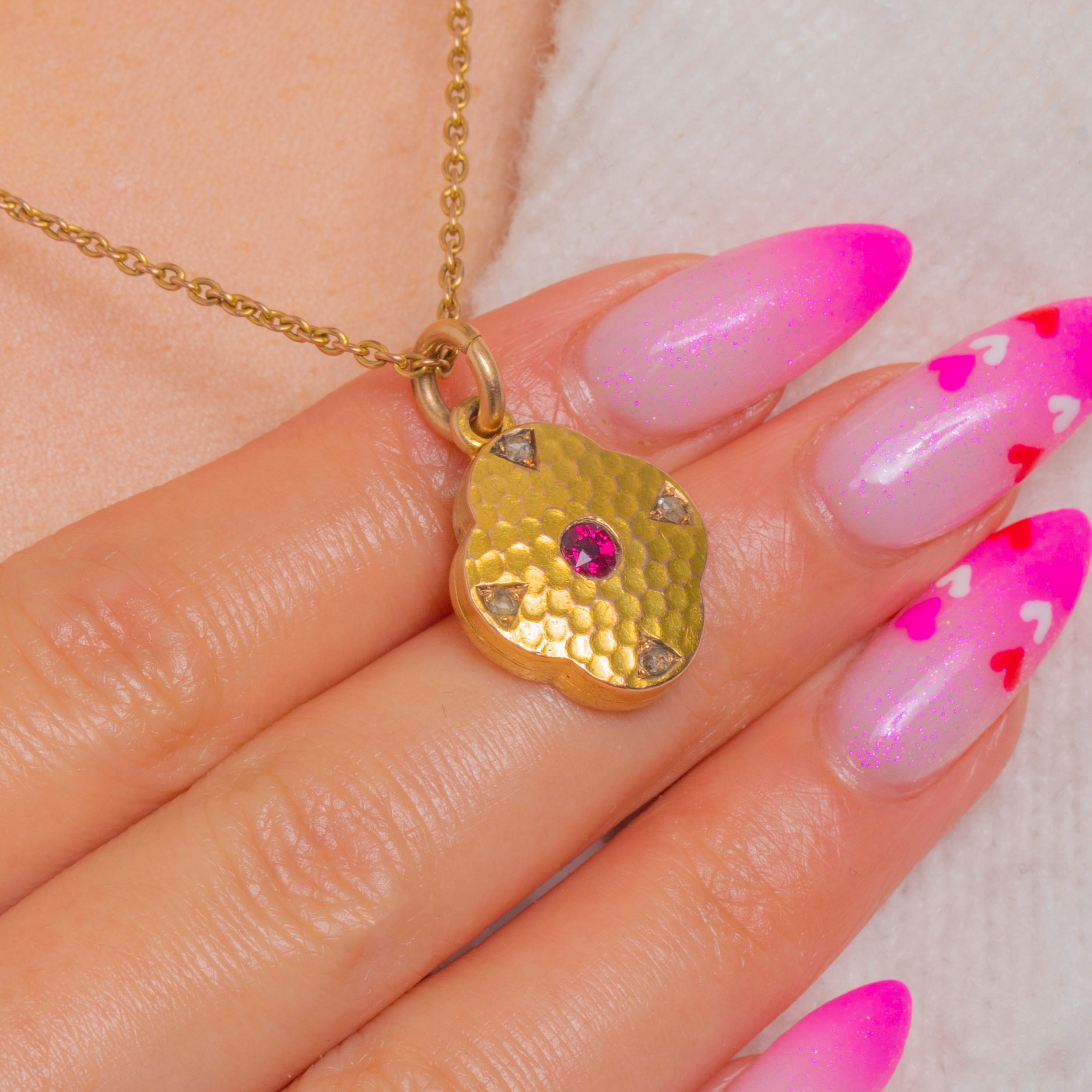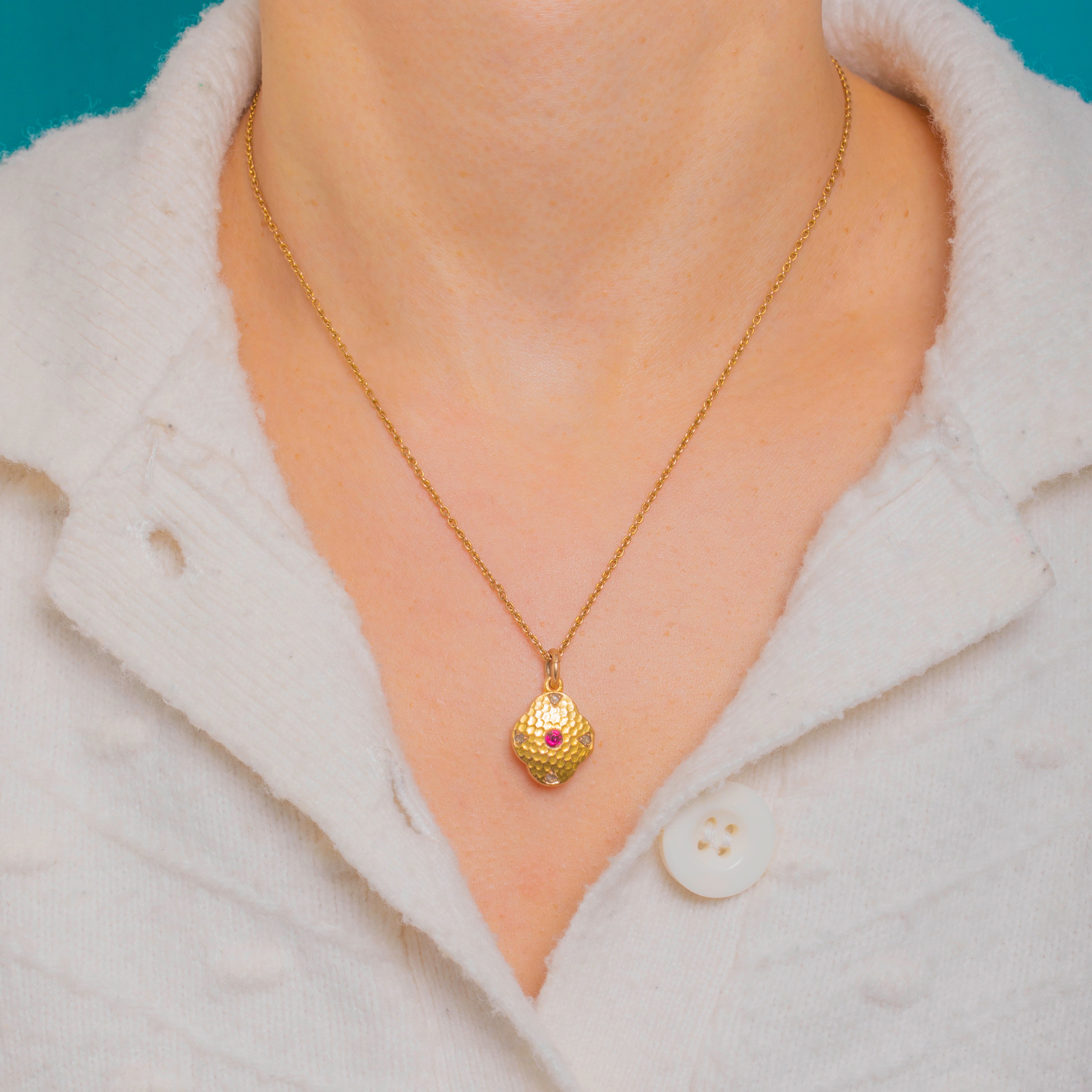 A darling Victorian quatrefoil locket, richly crafted in buttery 15ct Gold with a softly hammered texture that catches the light beautifully. At its heart glows a vivid Ruby, complemented by tiny Diamond accents that add a flash of sparkle. The four-lobed silhouette feels romantic and refined, with hand-finished character throughout.