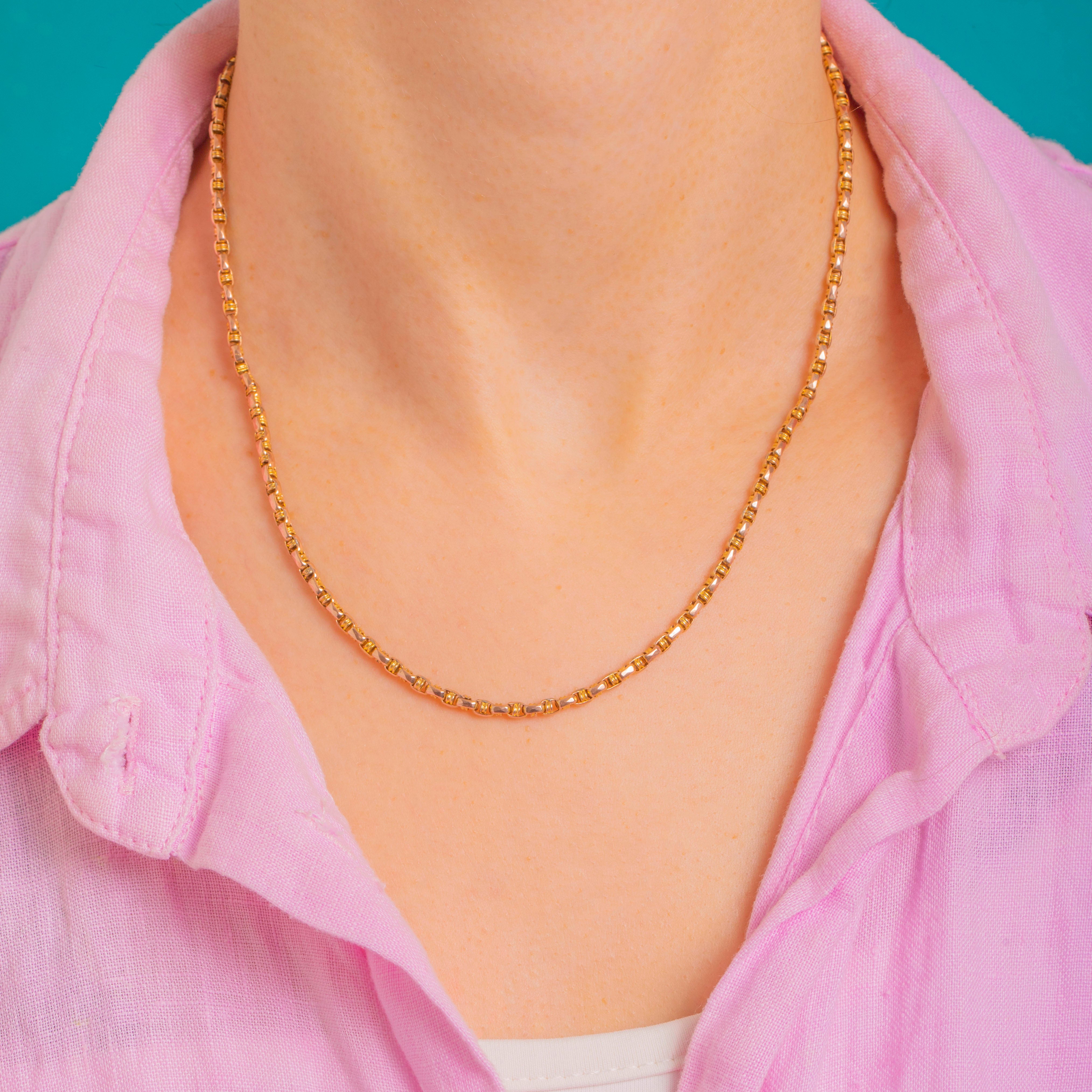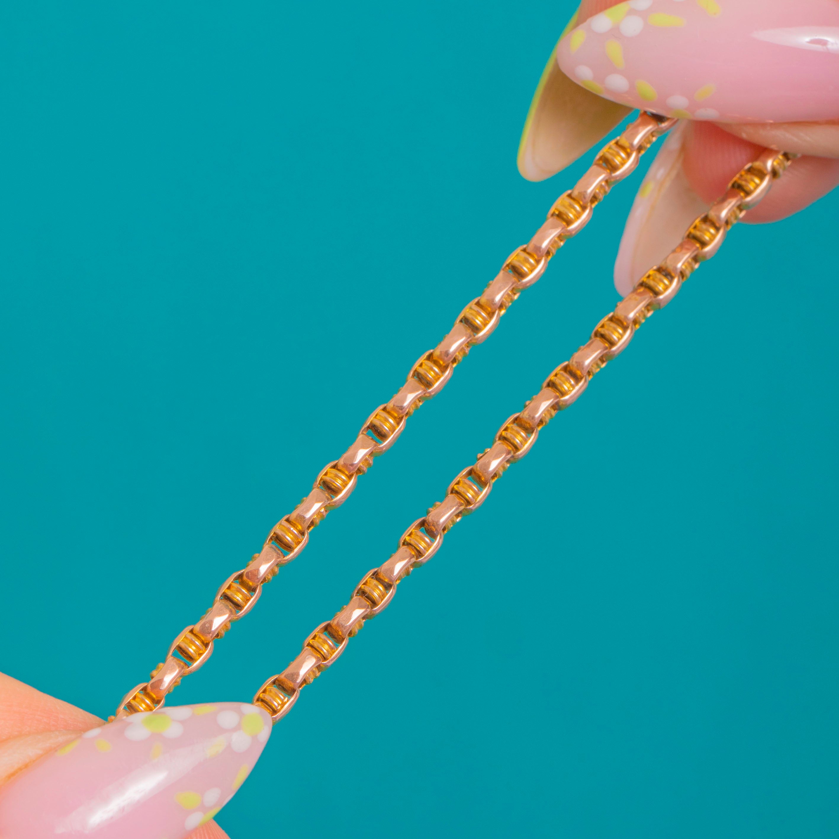 Elegant and architectural, this Victorian 9ct Gold fancy link chain has a beautifully crisp, rectilinear profile. The repeating faceted links catch the light with every move, creating a refined shimmer that sits neatly at the collarbone for effortless, everyday luxury.