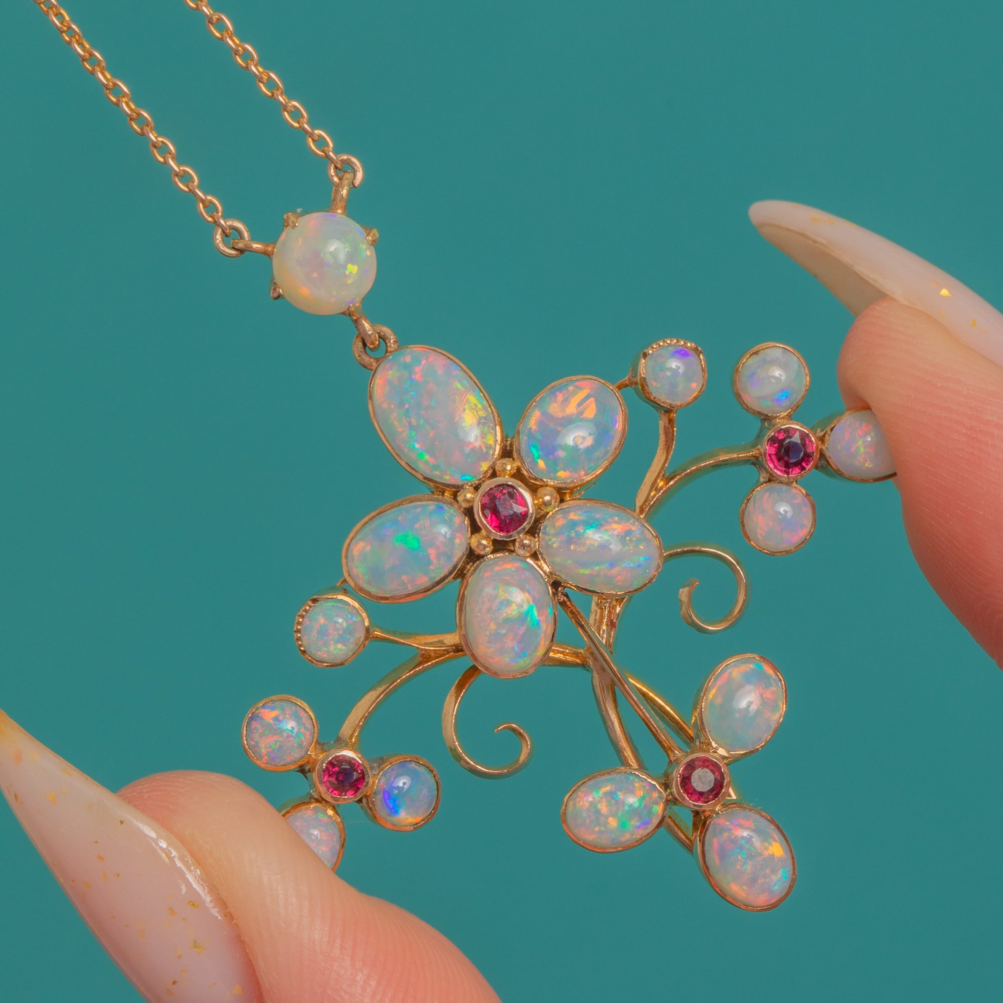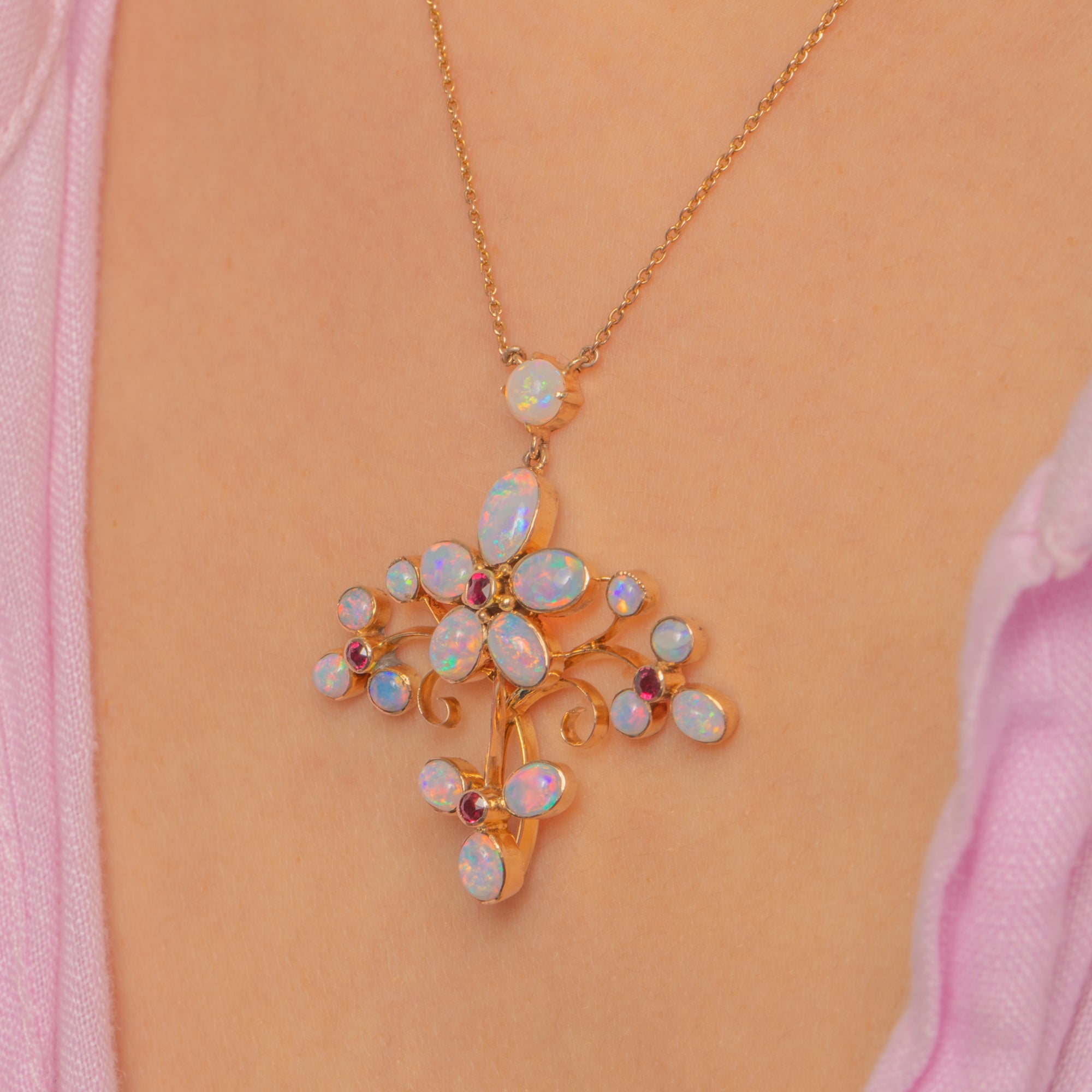 Set in warm 9ct Gold and suspended from a fine 15ct Gold chain, the Opals display lively blue, green and orange flashes, while the Rubies lend a delicate pop of pinkish-red sparkle. Elegant, feminine and endlessly wearable, it’s a timeless jewel from the golden age of Art Nouveau.