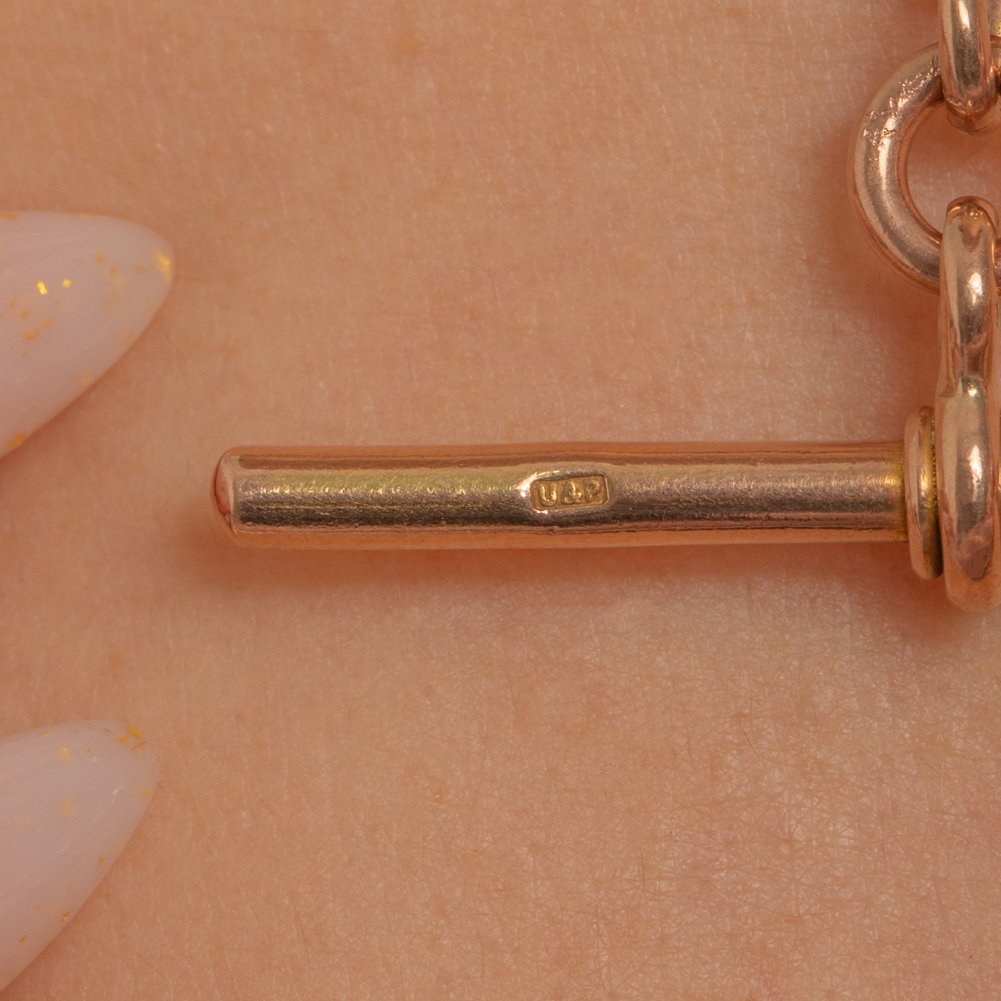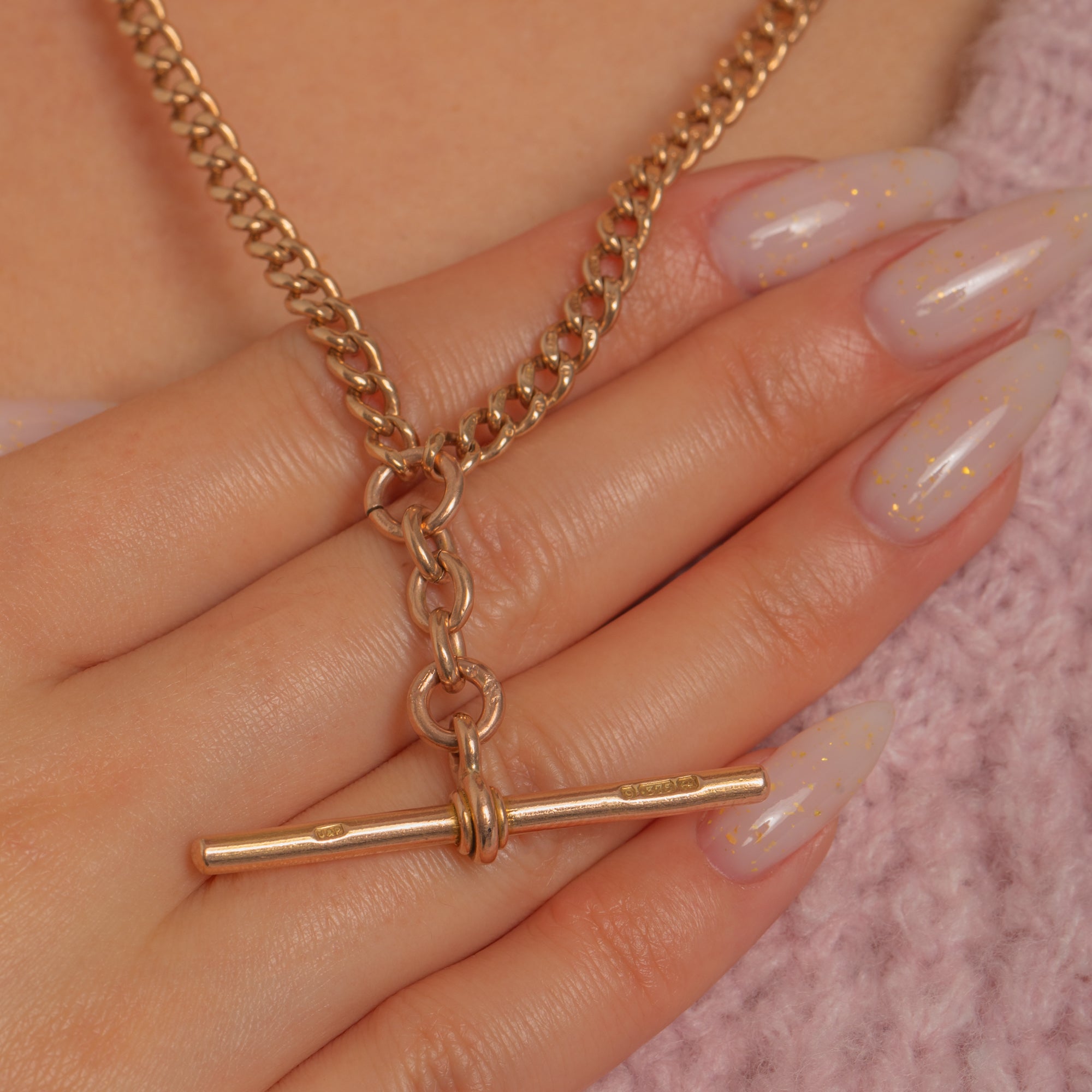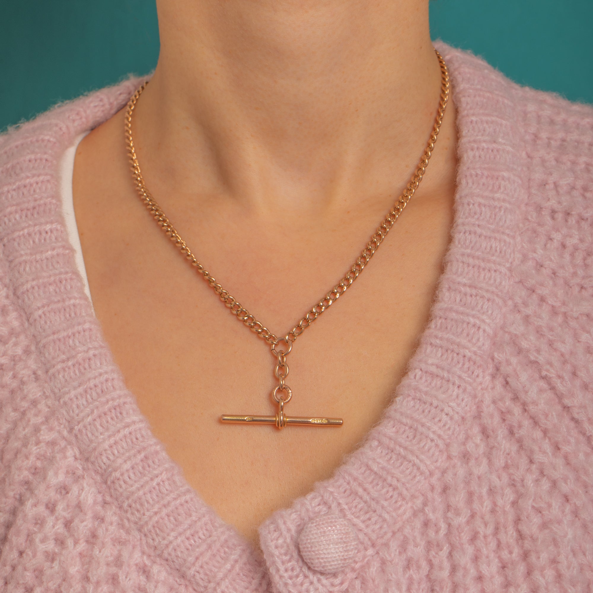 Immensely satisfying in both look and feel, this Victorian 9ct Gold Albert chain pairs polished curb links with a stationary T-bar drop and twin dog-clips for that timeless watch-chain allure. The Gold has a warm, rosy-yellow hue and the chain carries a reassuring heft, offering a luxurious drape and a robust, unisex presence.