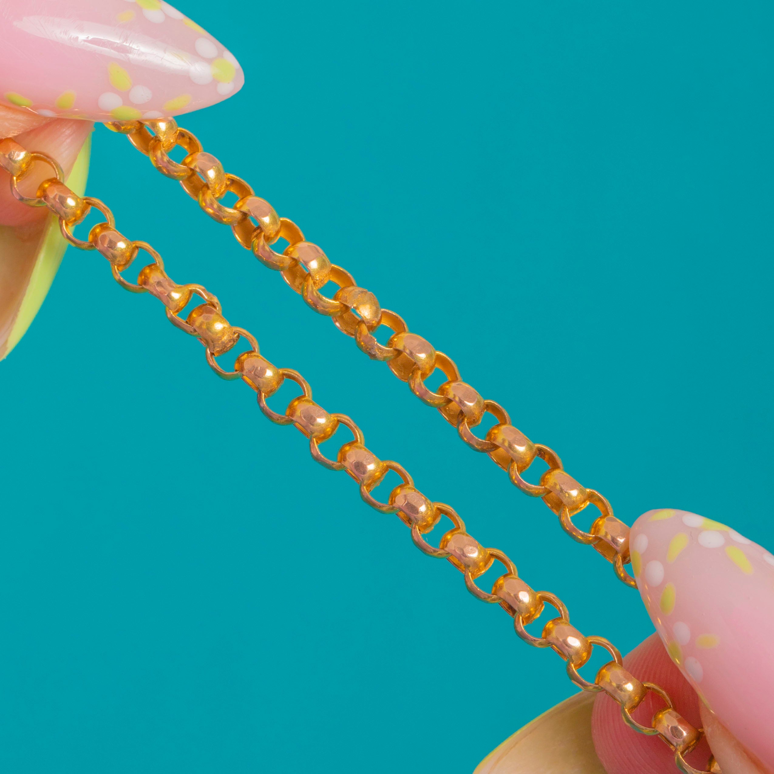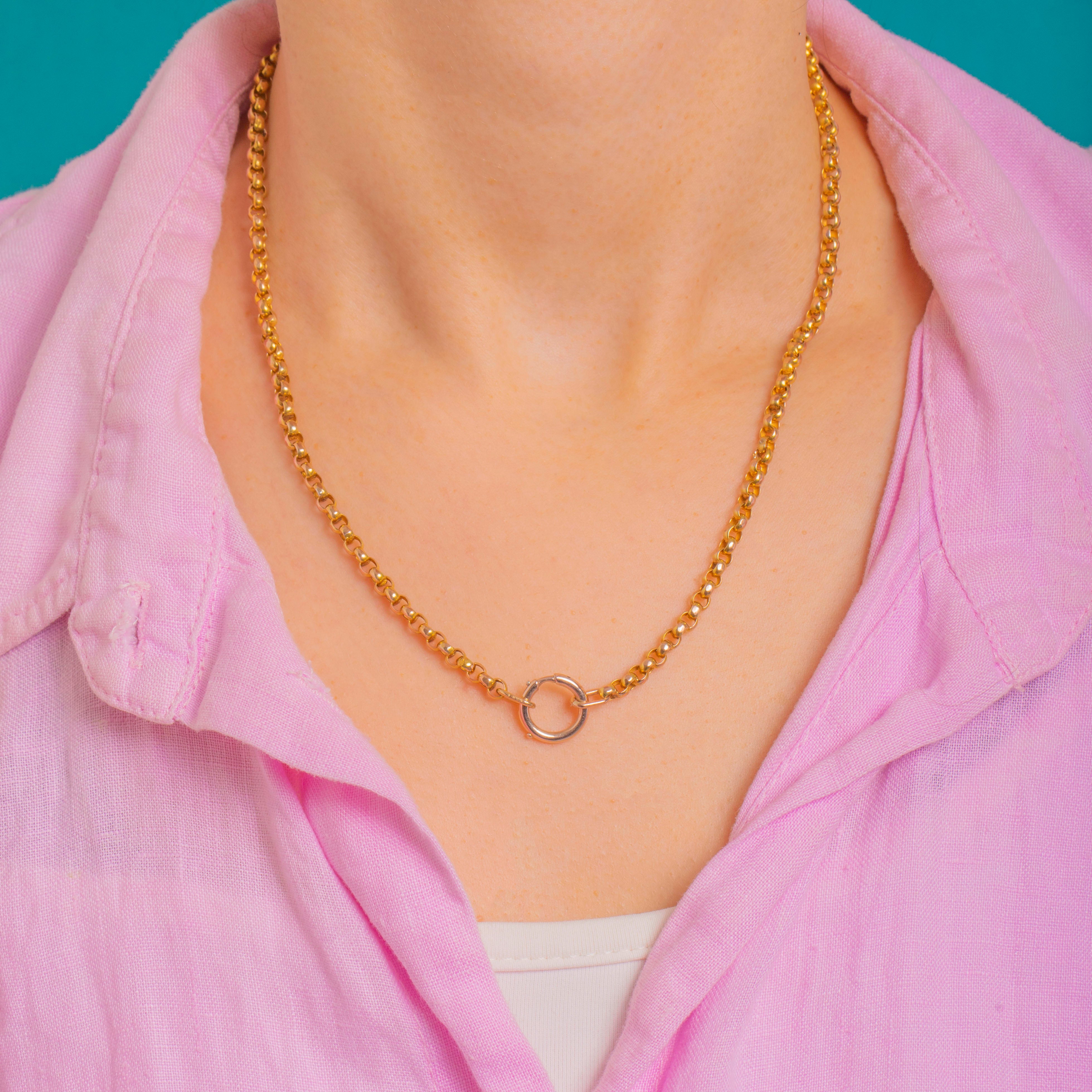 A timeless Victorian 9ct Gold belcher chain, elevated with a chunky bolt ring charm holder at the fore. The rounded, open belcher links catch the light beautifully, while the bold circular bolt ring doubles as clasp and focal point—perfect styled solo, layered, or as a versatile holder for your favourite charm or pendant.