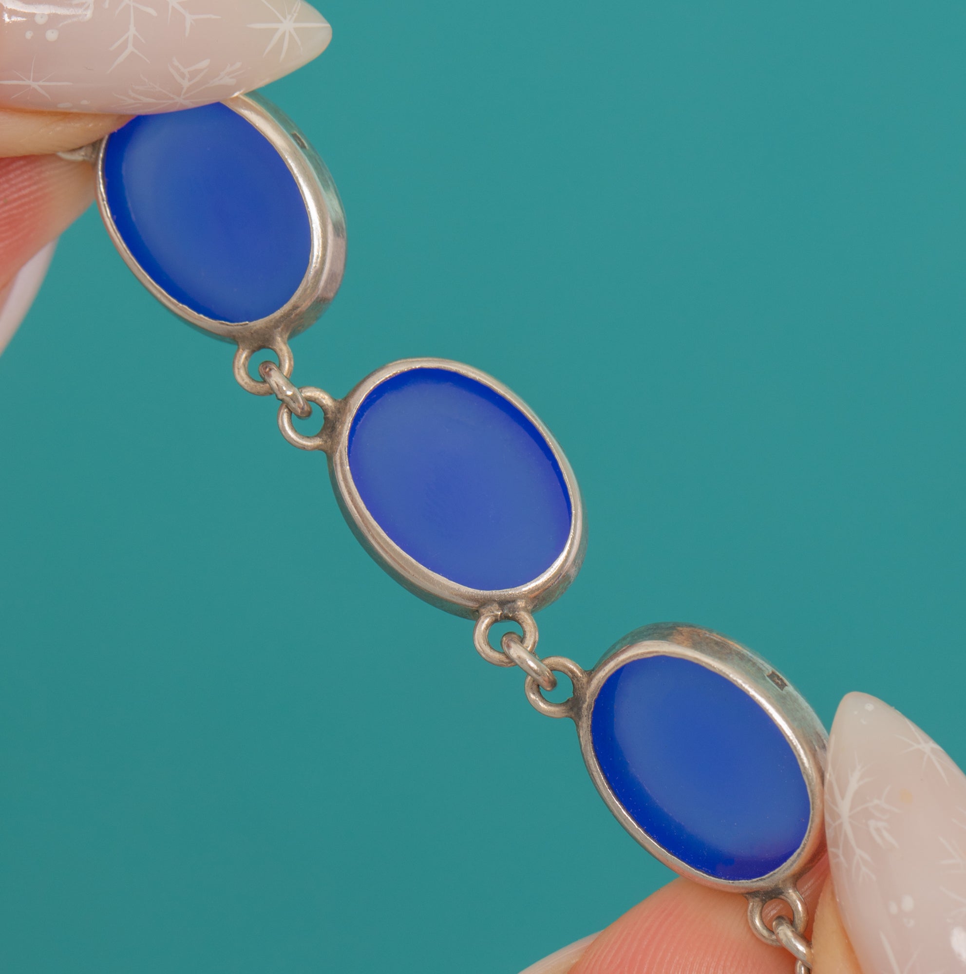 EXCELLENT: The Blue Chalcedony cabochons are smooth and glossy with no chips, scuffs or wear. The Sterling Silver rubover settings and articulated links are secure and neatly finished, with a bolt-ring clasp that closes firmly. Hallmarks are crisp and legible.