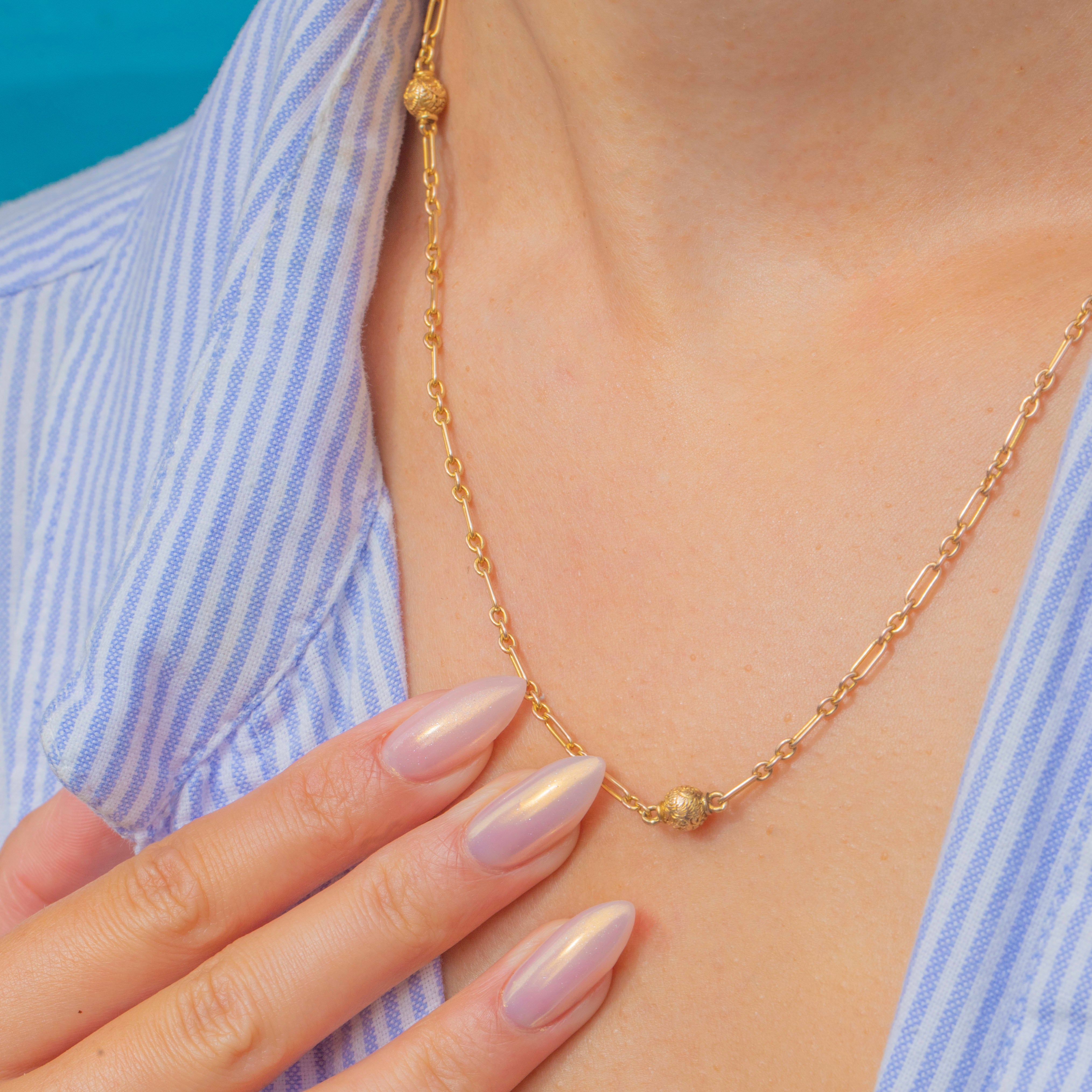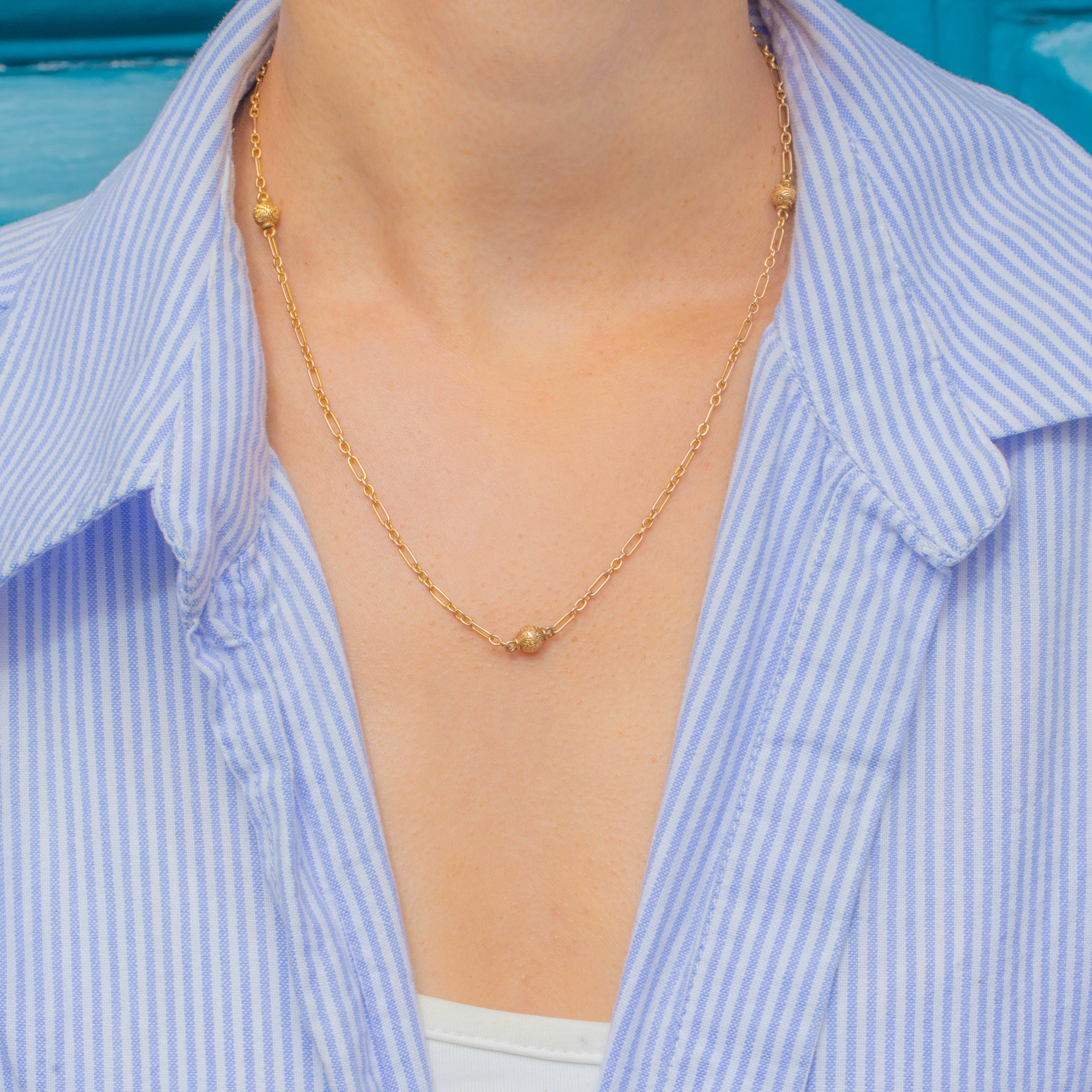 At 17" in length and stationed with engraved orbs, this chain has a lovely texture and rests on your décolletage delicately. It is complete with an antique bolt ring and can be used to suspend your favourite charms or pendants.