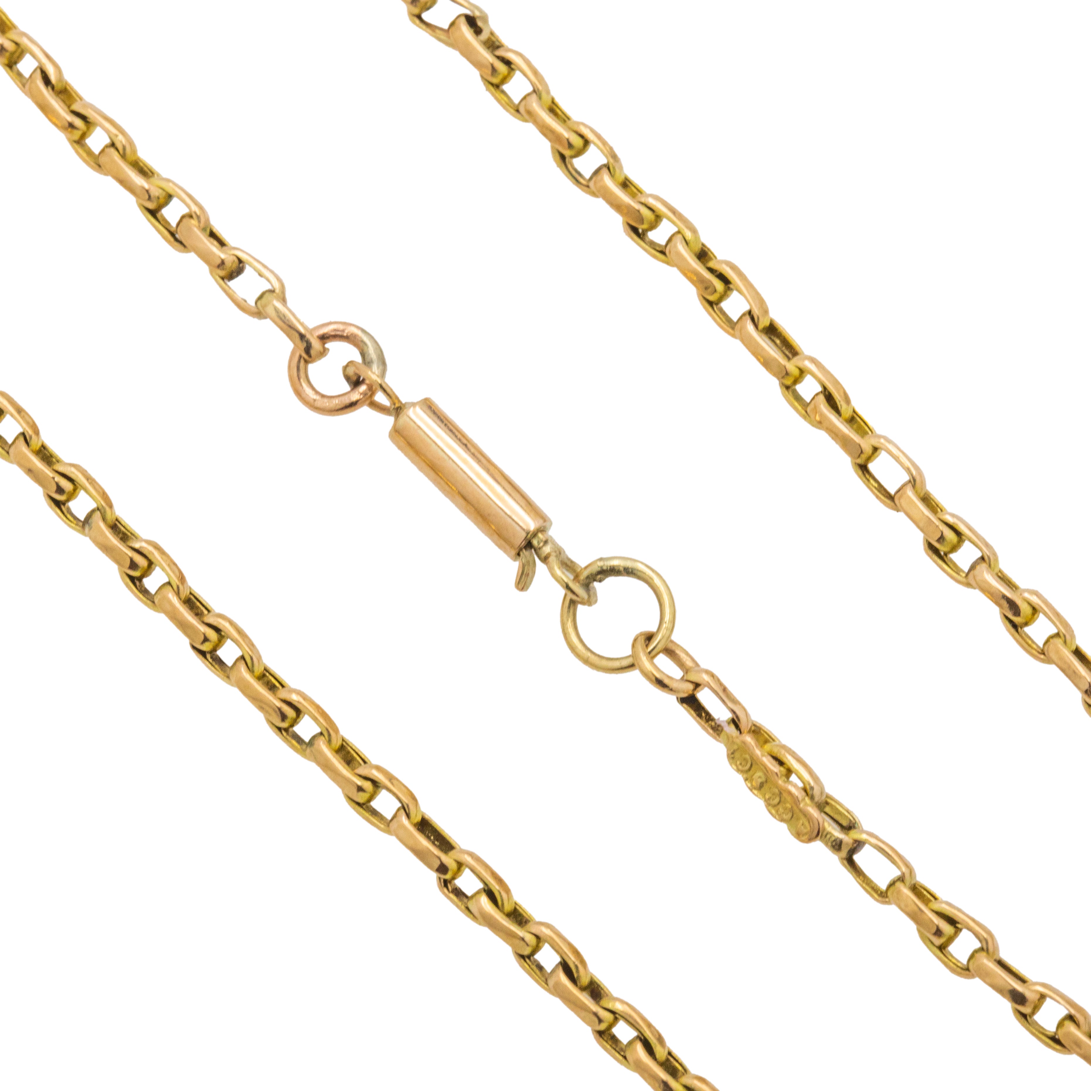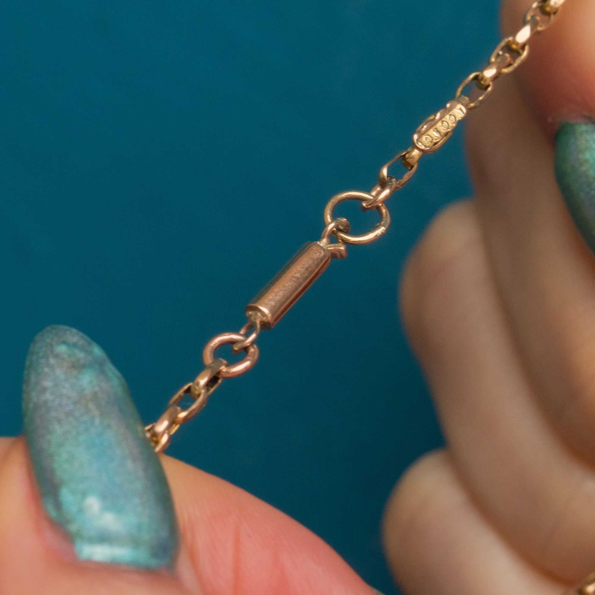 EXCELLENT. This 17" antique 9ct Gold belcher chain is in superb condition. The links are all securely affixed with an even rosy hue throughout, and the barrel clasp is in perfect working condition allowing you to wear this Victorian Gold chain with utmost confidence!