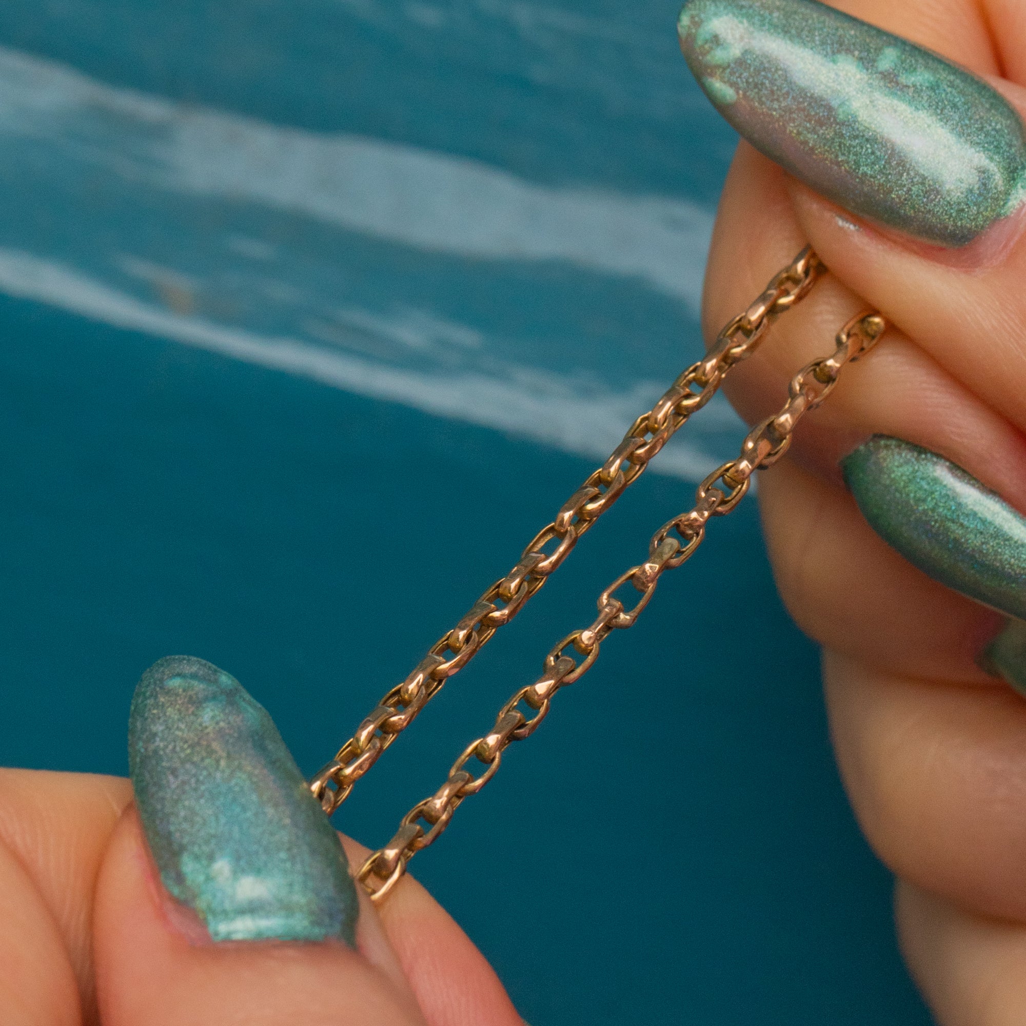 Crafted from solid 9ct Gold, this Victorian chain boasts 17" of elegant rectangular belcher links with softly faceted edges that catch the light beautifully. The 9ct Gold has gracefully aged and accrued a buttery blush finish, complementing both your antique yellow Gold and rosy Gold charms with ease.