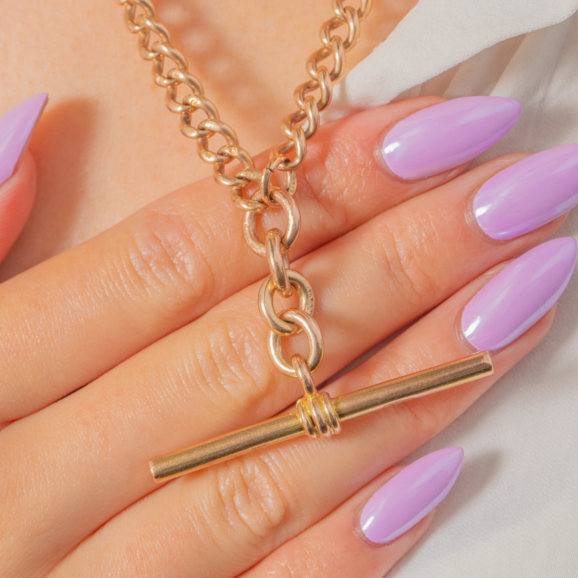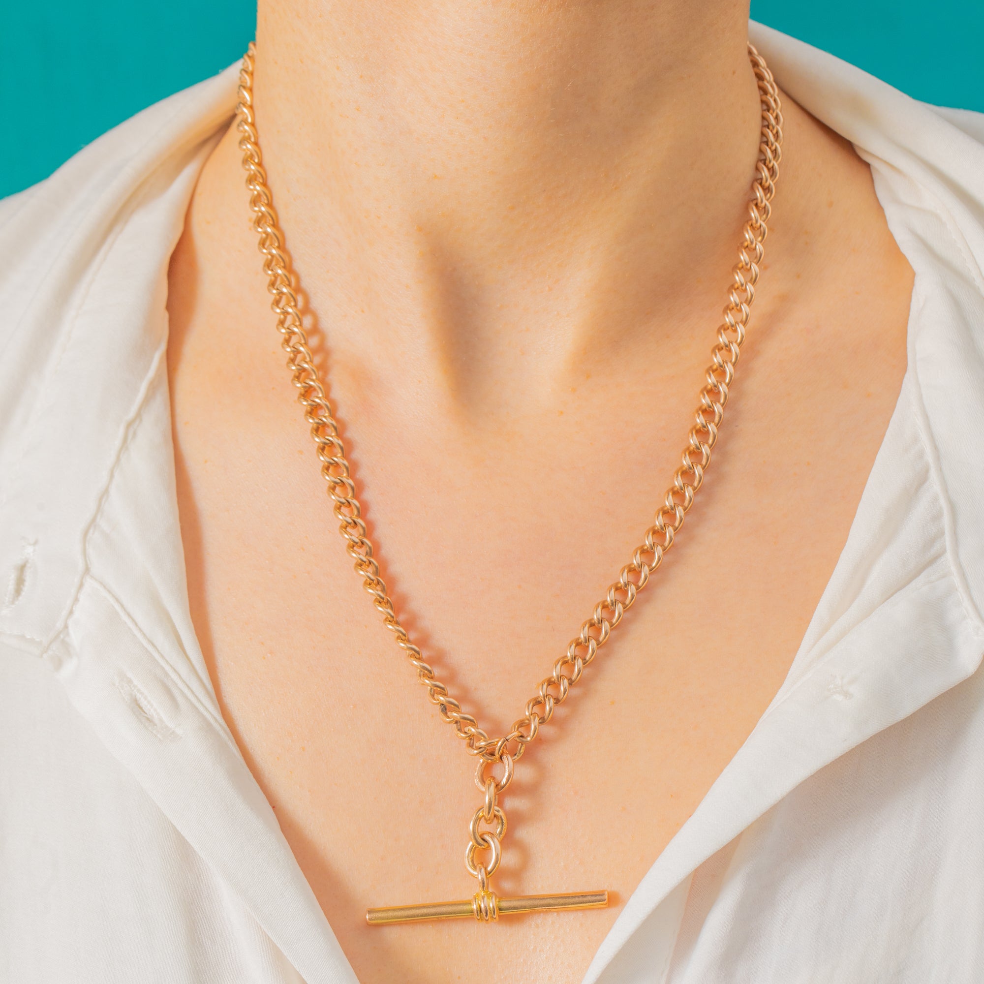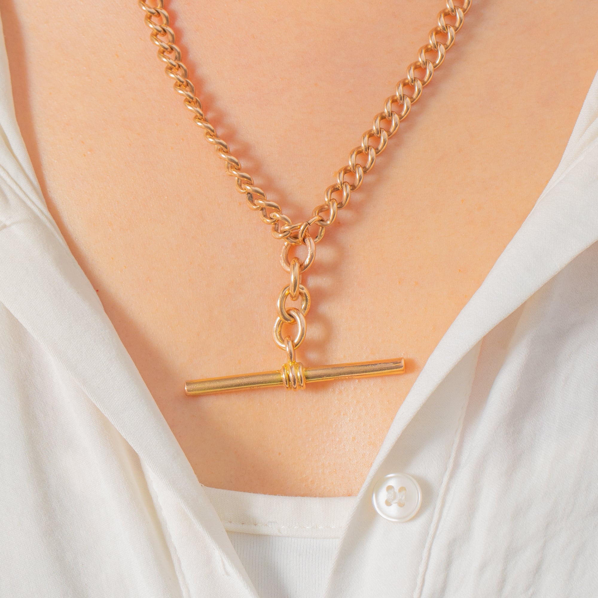 A quintessential Victorian 9ct Gold Albert chain with glorious presence, this piece is all about sleek proportion and rich golden glow. The rounded curb links flow beautifully and culminate in a classic T-bar drop, with sturdy dog clips completing the traditional silhouette. At 17", it sits elegantly at the collarbone for a timeless, tailored look.