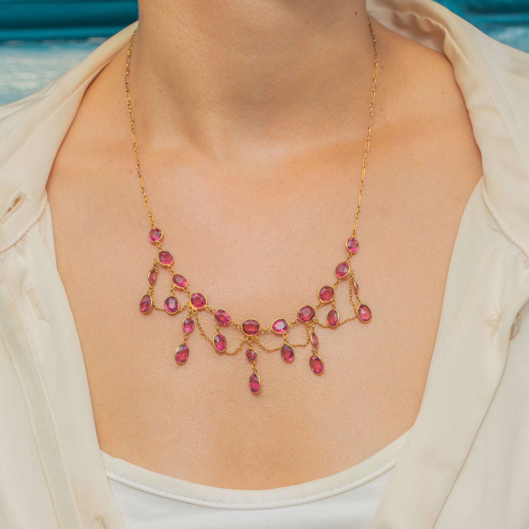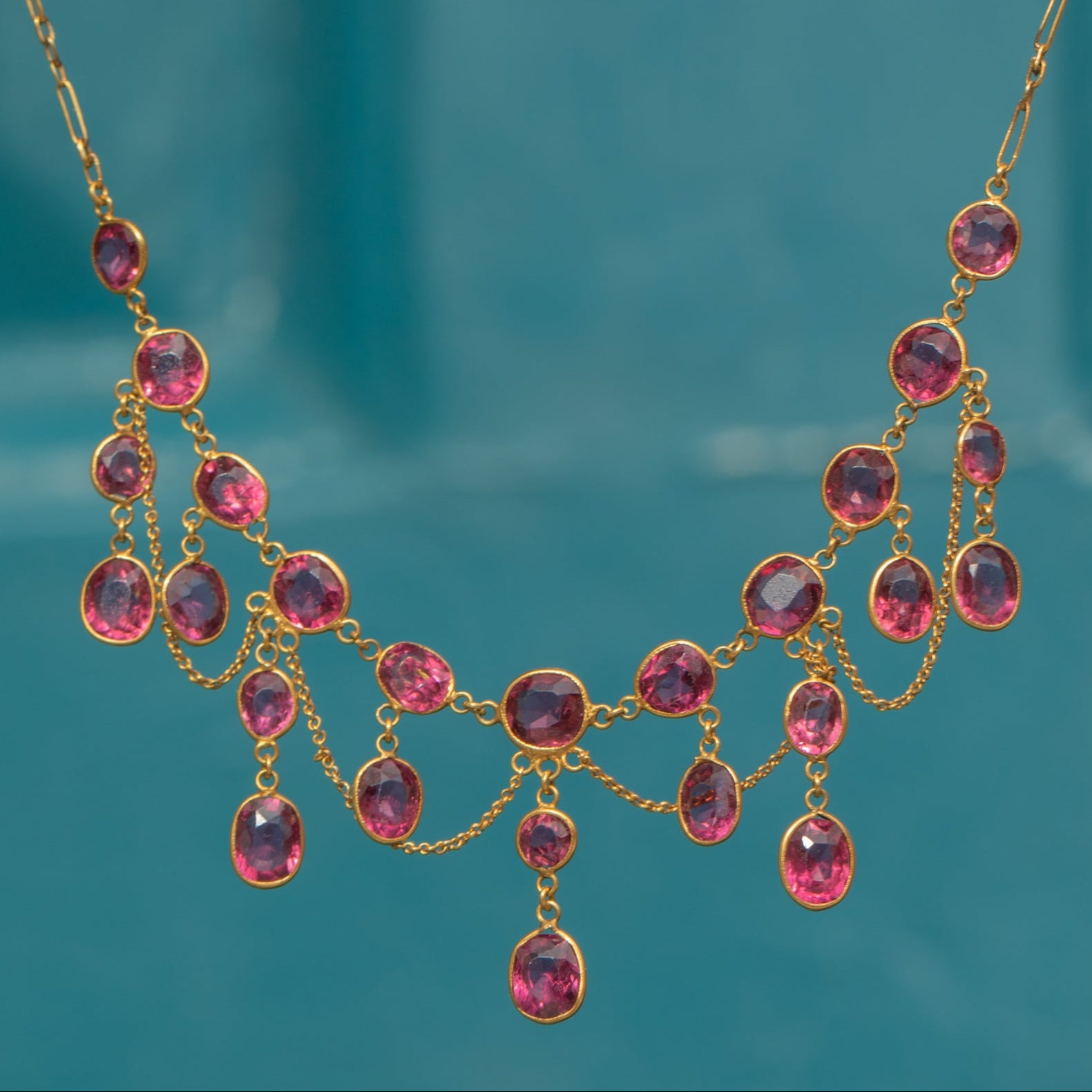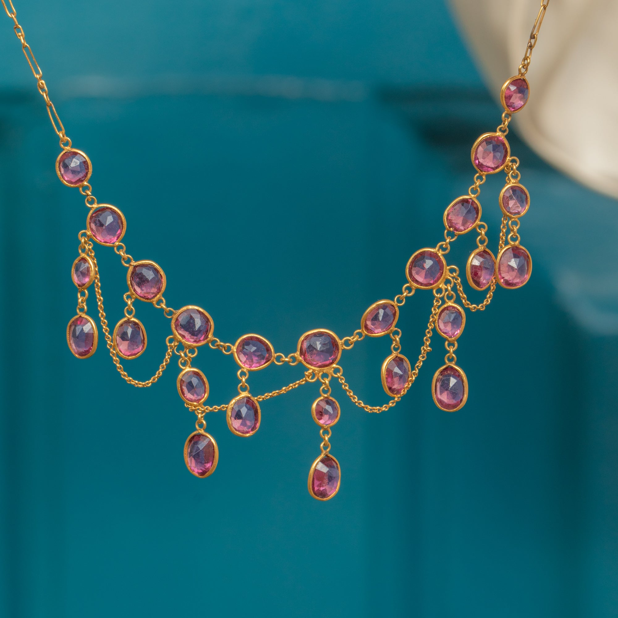 This Edwardian festoon necklace is a graceful cascade of rich, pink-red Rhodolite Garnets totalling approximately 5.0cts. The gemstones are arranged in articulated drops, their warm hue glowing against the sumptuous 18ct Gold, with delicate chains linking each section for a fluid, romantic drape.