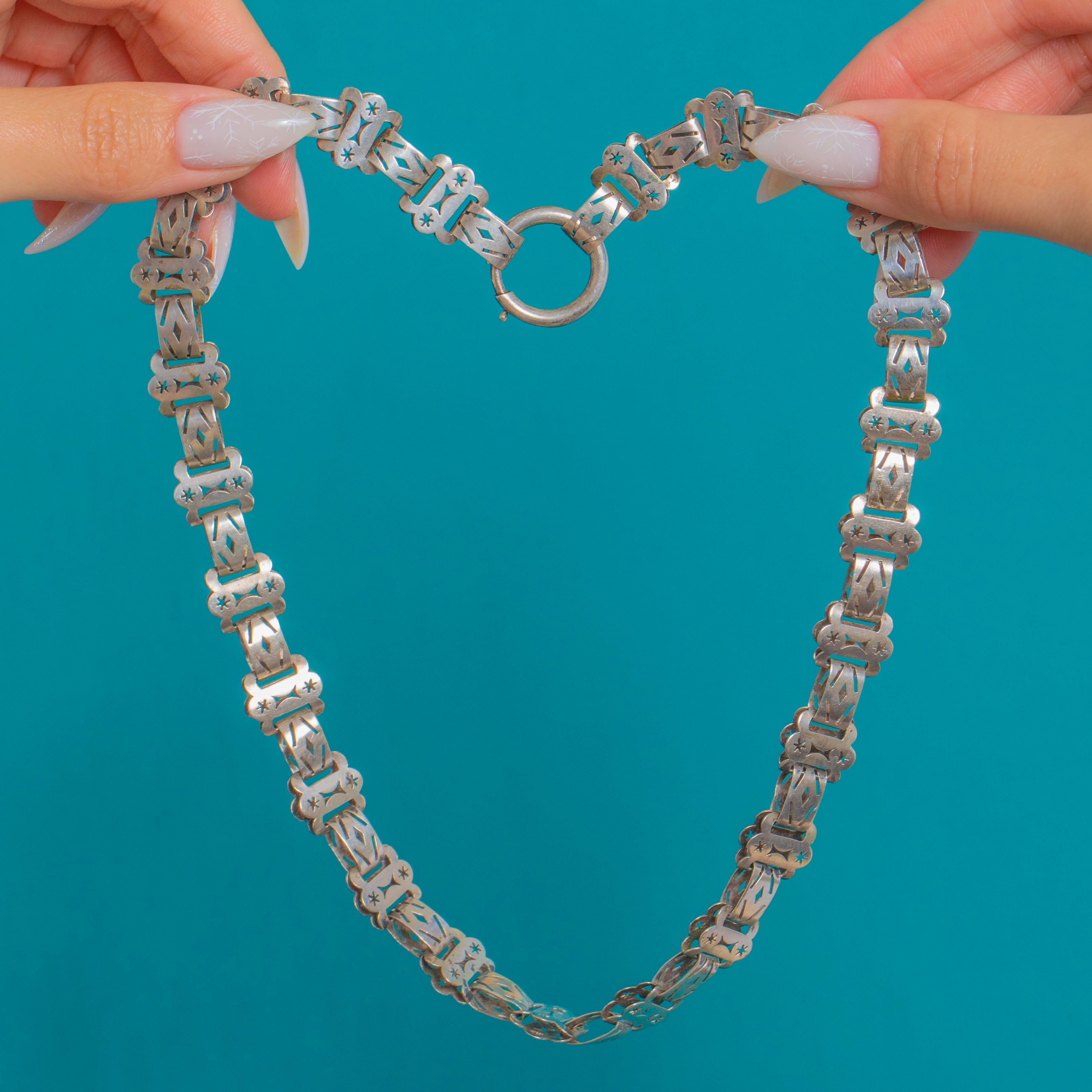 This Victorian book-chain collar is a striking study in geometry and craftsmanship. Formed from articulated links with scalloped ends, it’s intricately pierced with eight-point stars and detailed with crisp chevrons and lozenges, creating that bold, structured “book chain” look we adore.