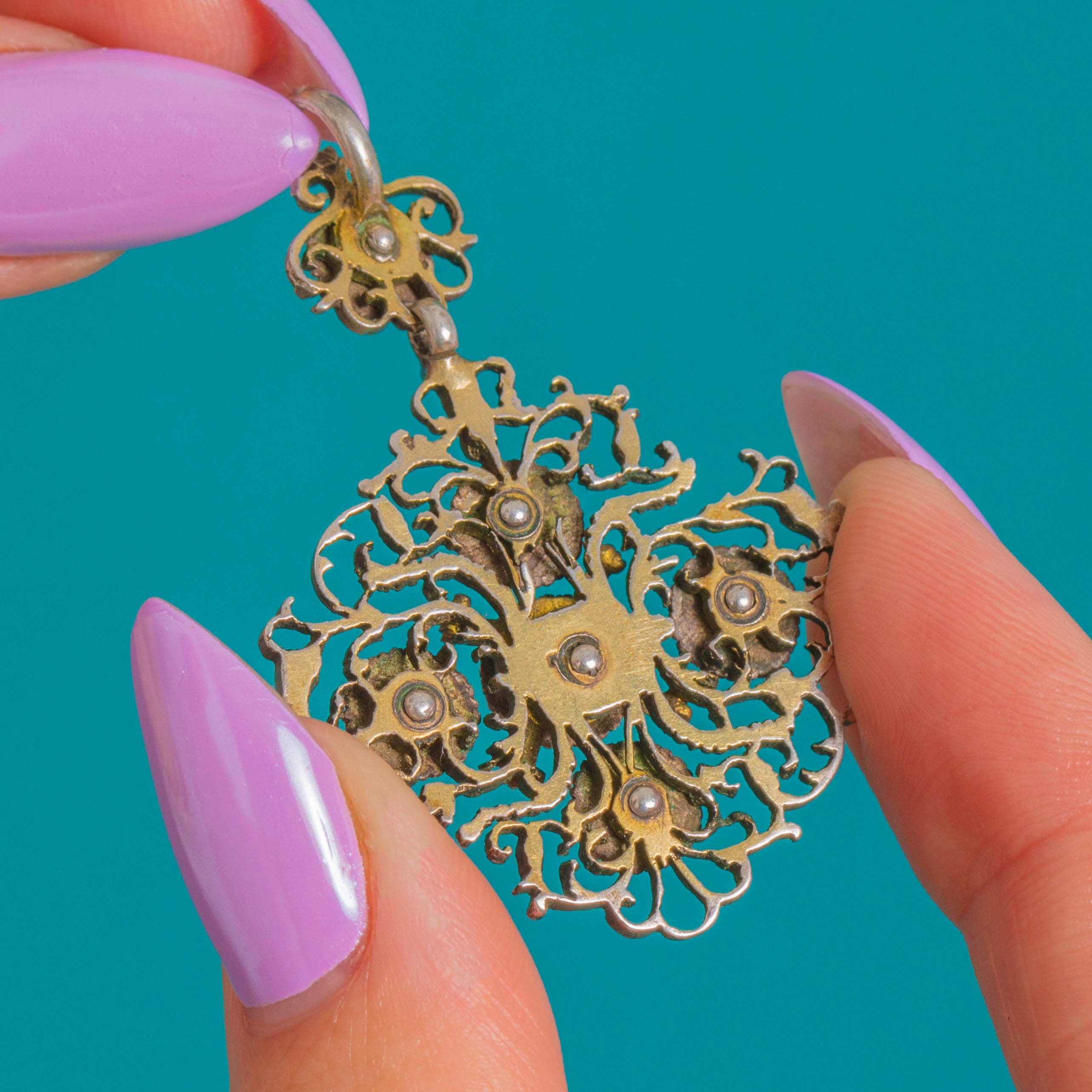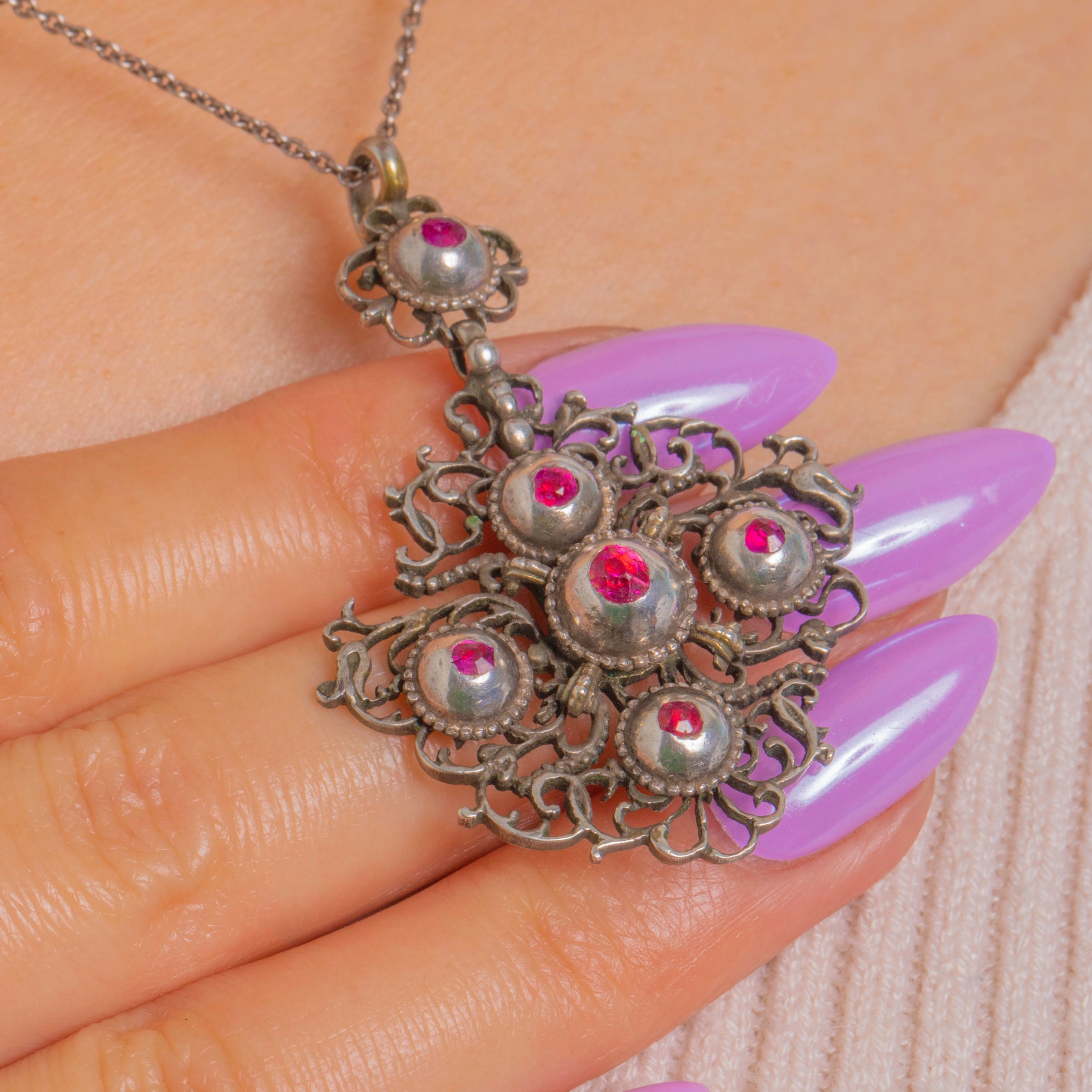 The articulated construction gives subtle movement, while the darkened patina in the recesses beautifully offsets the bright pink-red sparkle of the Rubies. An ornate yet wearable treasure, it hangs from a fixed top bail—ready to grace your favourite chain with centuries-old elegance.