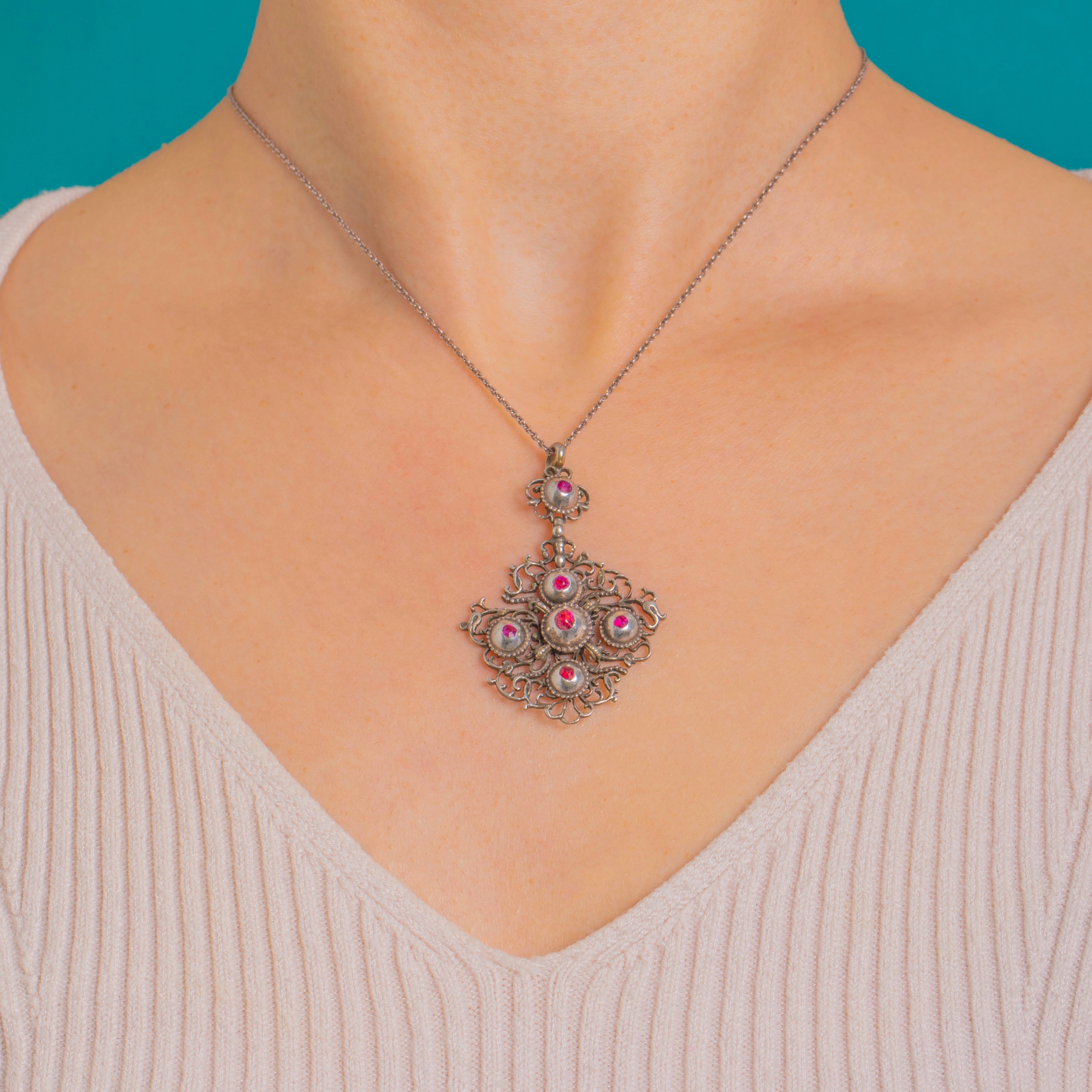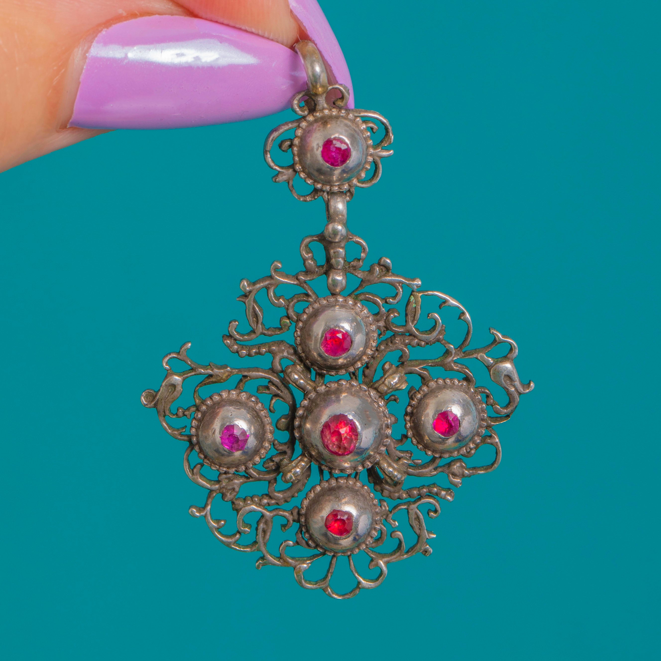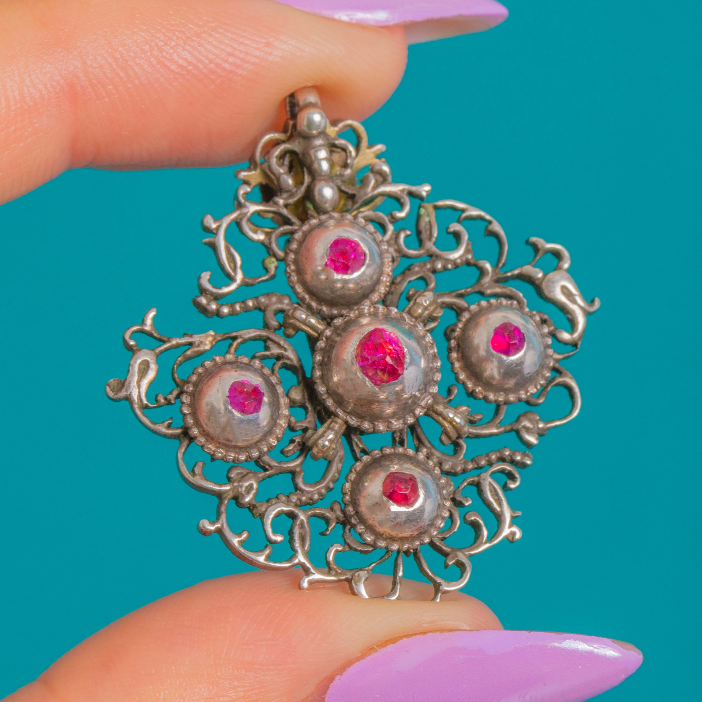 Rich with 18th-century romance, this Silver Ruby pendant is a jewel of the late 17th Century. A luminous central Ruby sits proudly within a domed closed-back collet, encircled by five smaller Rubies to form a lush rosette. The openwork backplate and scrolling filigree are embellished with delicate beading along the raised collets, creating depth, texture and that captivating play of light that Stuart jewels are loved for.