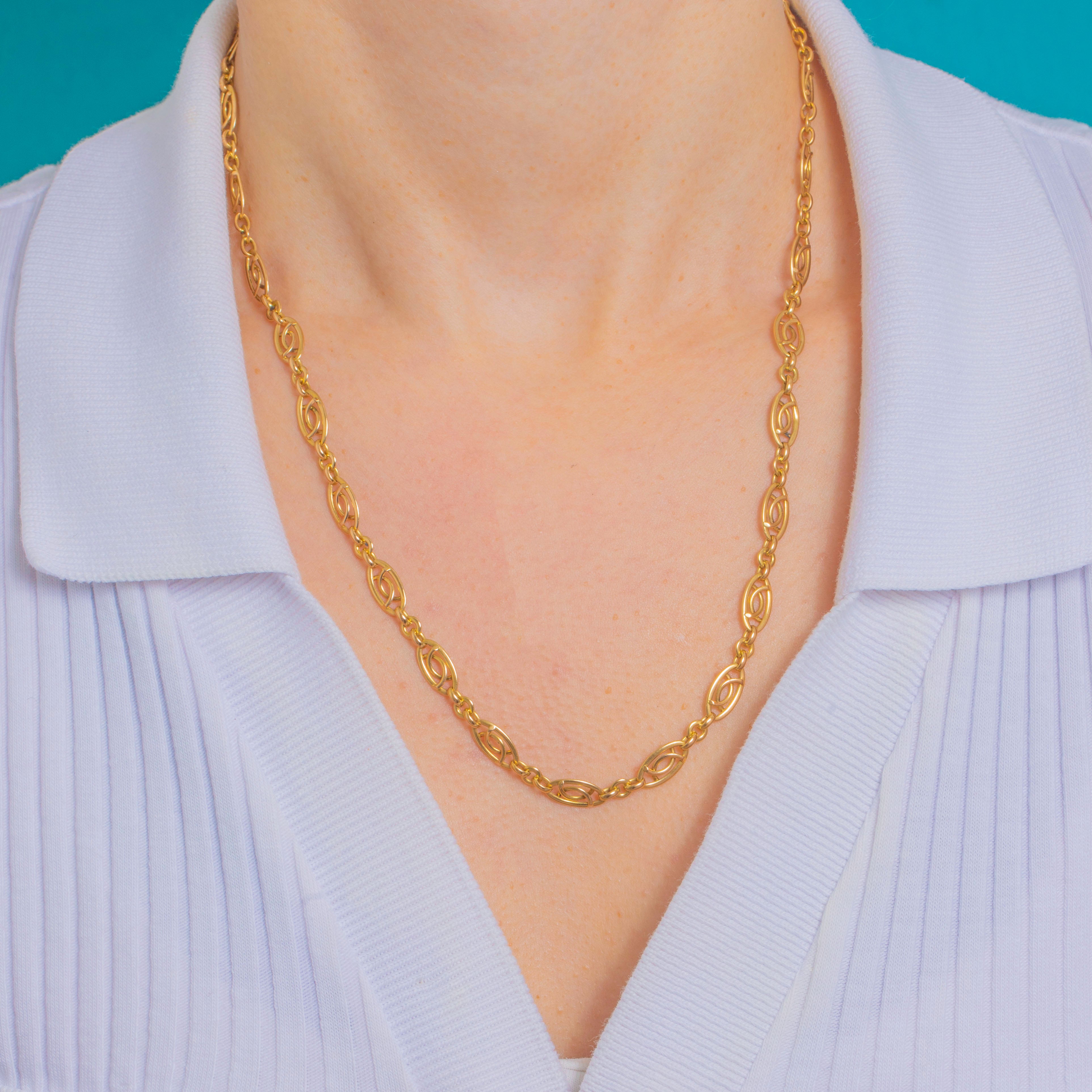 A beautiful Late Victorian fancy-link chain, crafted in rich 18ct Gold with an elegant French sensibility. Each openwork navette link is adorned with delicate soldered S-scrolls, joined by petite jump rings for a refined, articulate drape. The warm, bright glow of the Gold flatters the intricate wire-formed design, offering texture and movement in every link.