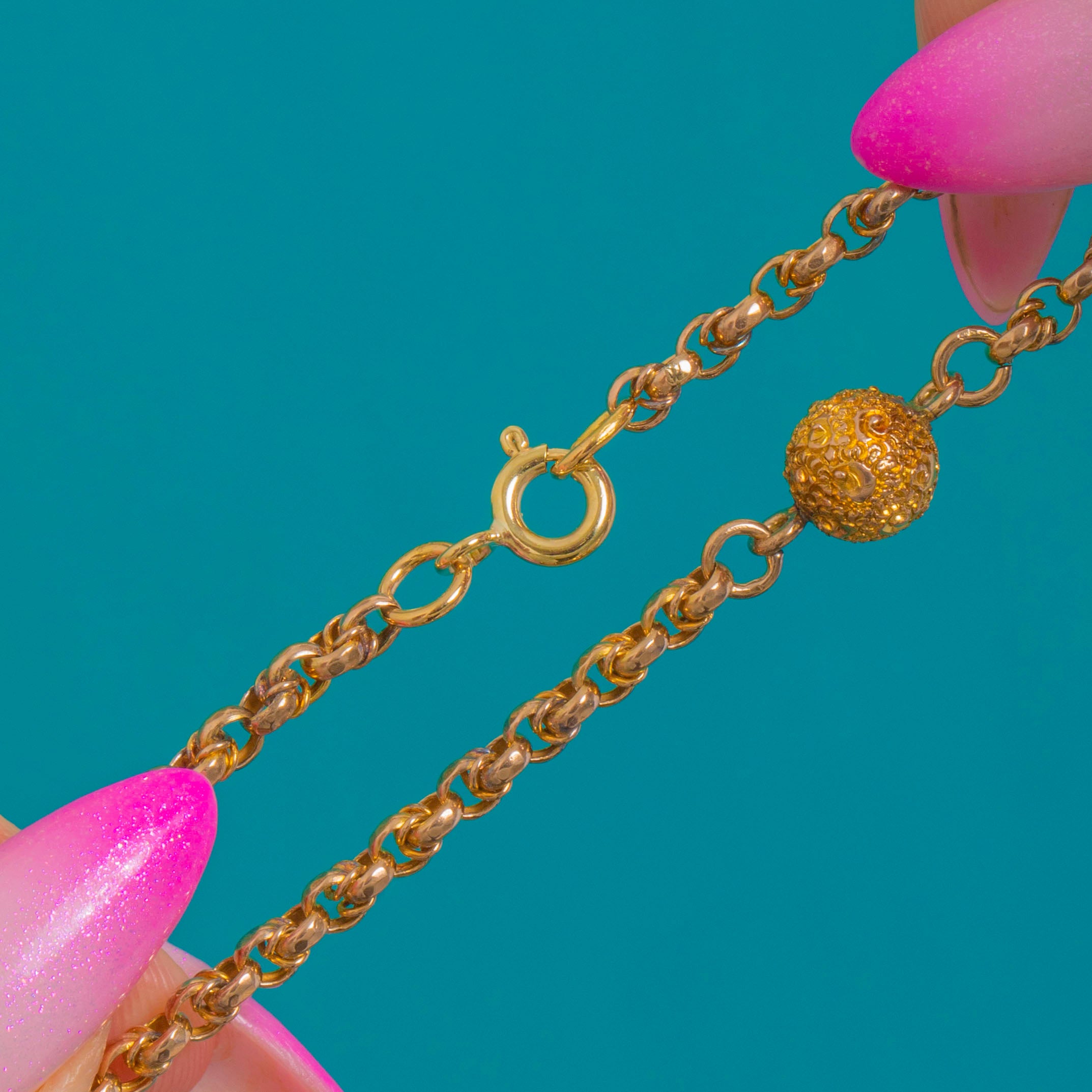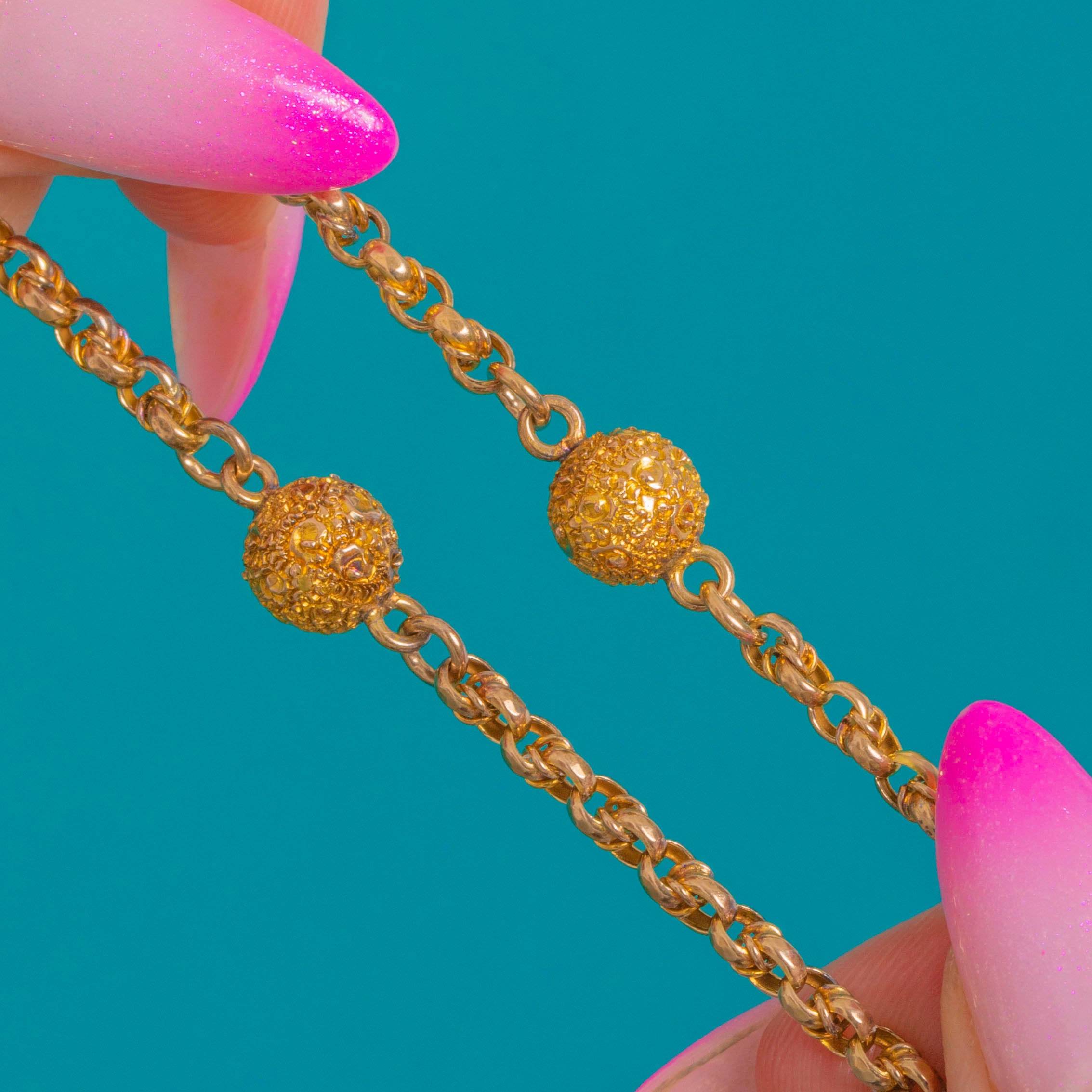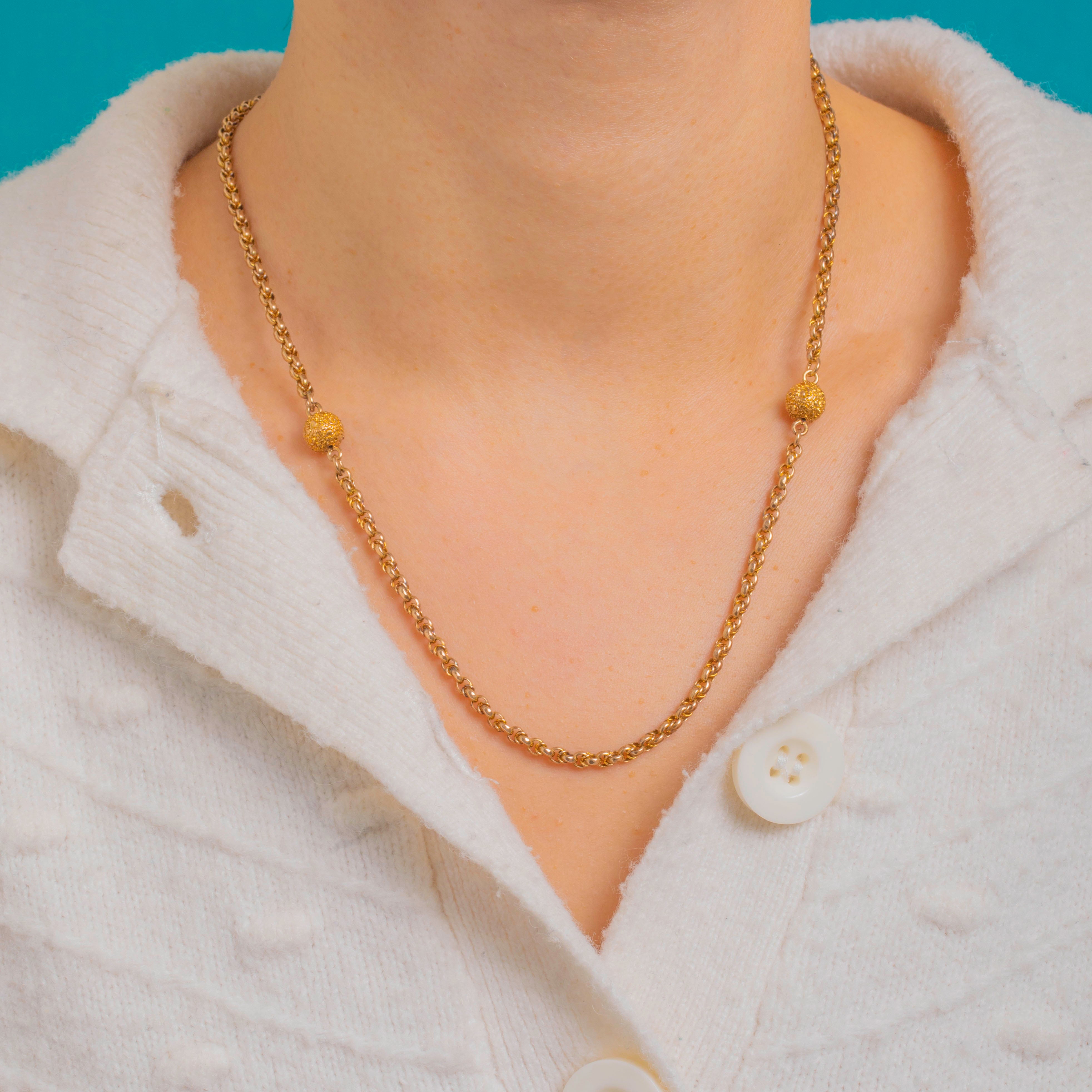 Sleek, tactile and unmistakably refined, this Victorian 9ct Gold fancy chain is punctuated with ornate ball links that add a whisper of texture and light. The softly granulated orbs lend subtle dimension to the classic smooth round links, creating a timeless look that feels both elegant and effortless.