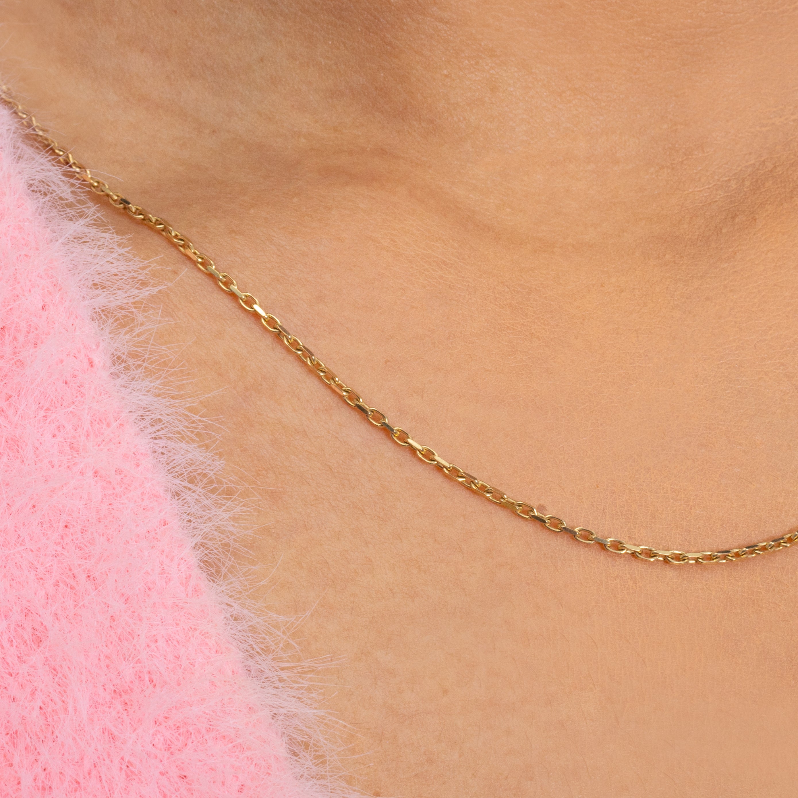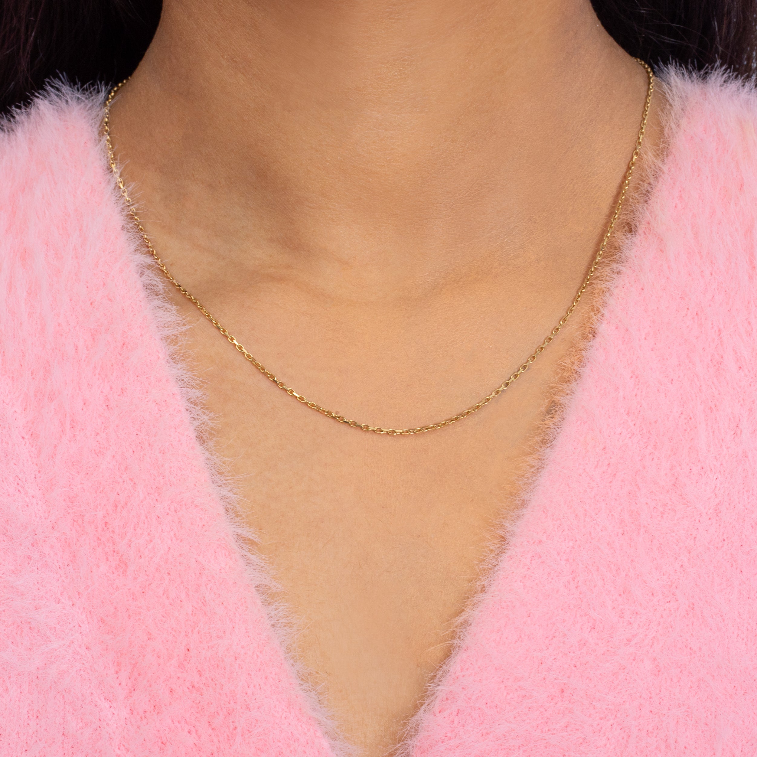 This 18" 9ct Gold skinny chain is perfect for everyday wear and would make a fantastic addition to your collection! Dainty rectangular belcher links make up the 18" length, with their angular forms sending glimmers of Gold cascading across your collarbones as they catch the light.
