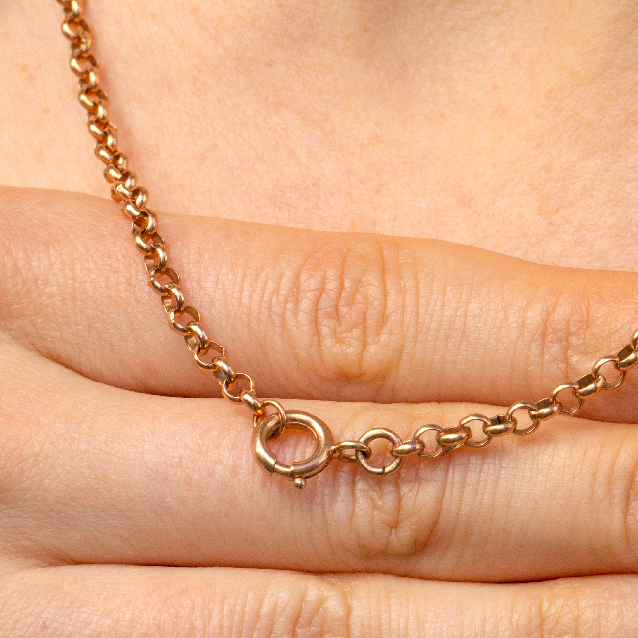 EXCELLENT. This 18" 9ct Rose Gold belcher chain is in excellent condition. The links are smooth and securely affixed with no dings or scuffs. There is a rare 9C tag and stamps on the jump ring near the clasp making this antique Gold chain a collectible piece. The rosy tone is divine and looks gorgeous on the skin! The bolt-ring allows you to wear this treasure securely, and you could even suspend a charm from it!