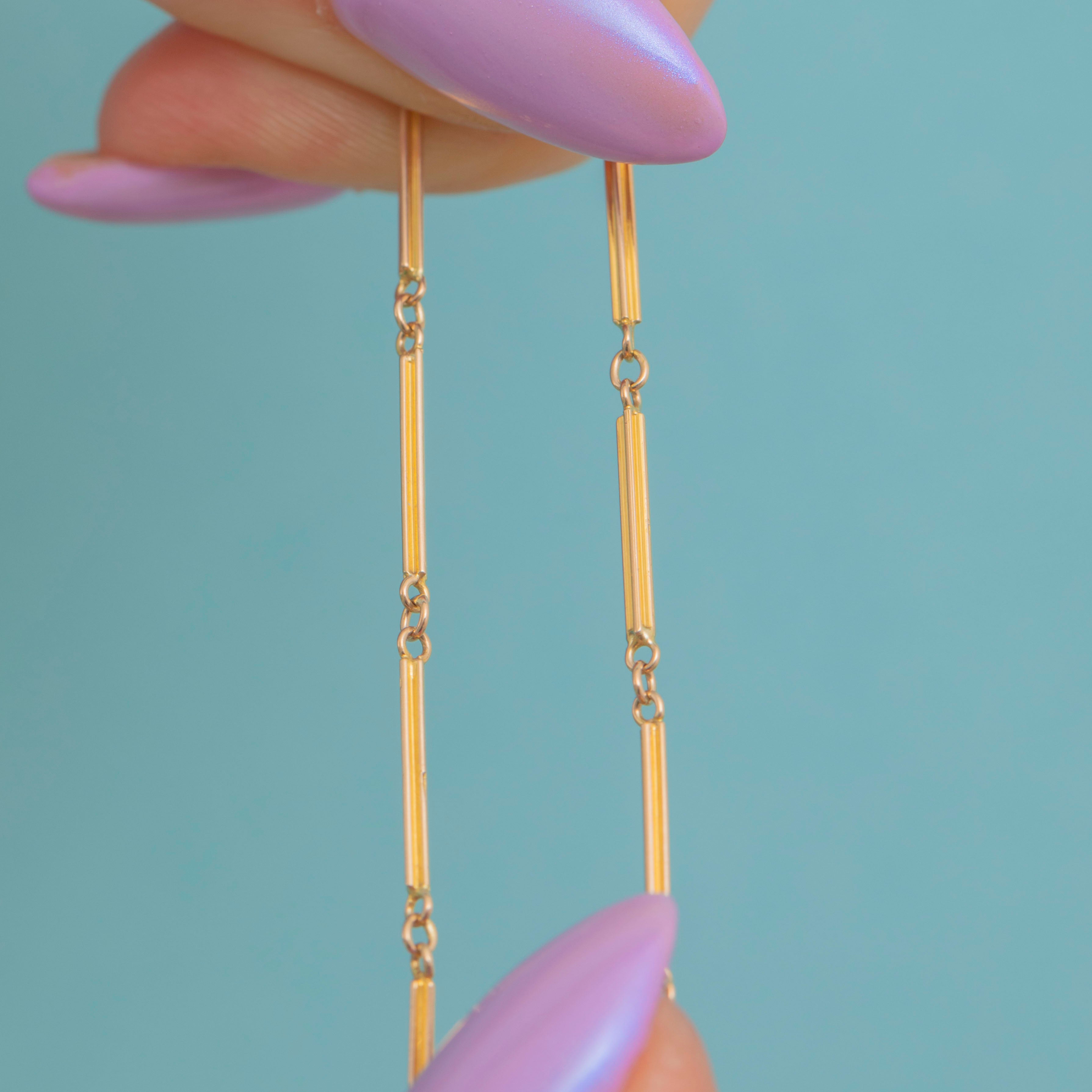VERY GOOD. This 18" antique 9ct Gold bar link chain is in very good condition! Every inch of this chain has a wonderful sheen and the links are secure, having kept their shape very well. She features one discreet replacement link that is metal, however this is not particularly noticeable. The bolt ring is in perfect working condition and will allow you to wear her confidently!