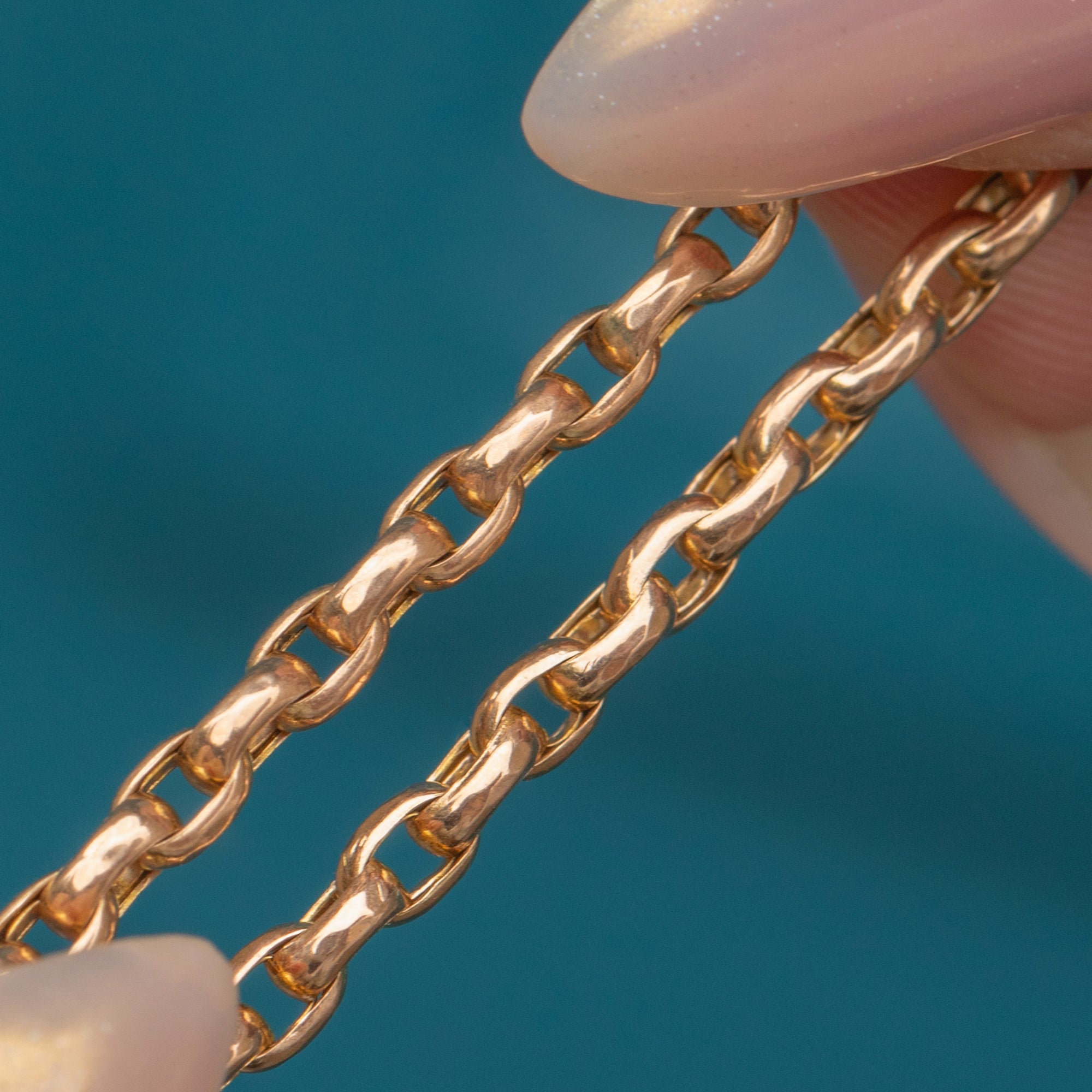 A superb Antique Victorian belcher chain crafted in solid 9ct Gold. Finished with a classic, authentic Victorian  dog-clip clasp, this chain is a fine example of Victorian craftsmanship. Its rich golden tone and substantial weight make it a staple piece for any antique jewellery lover.