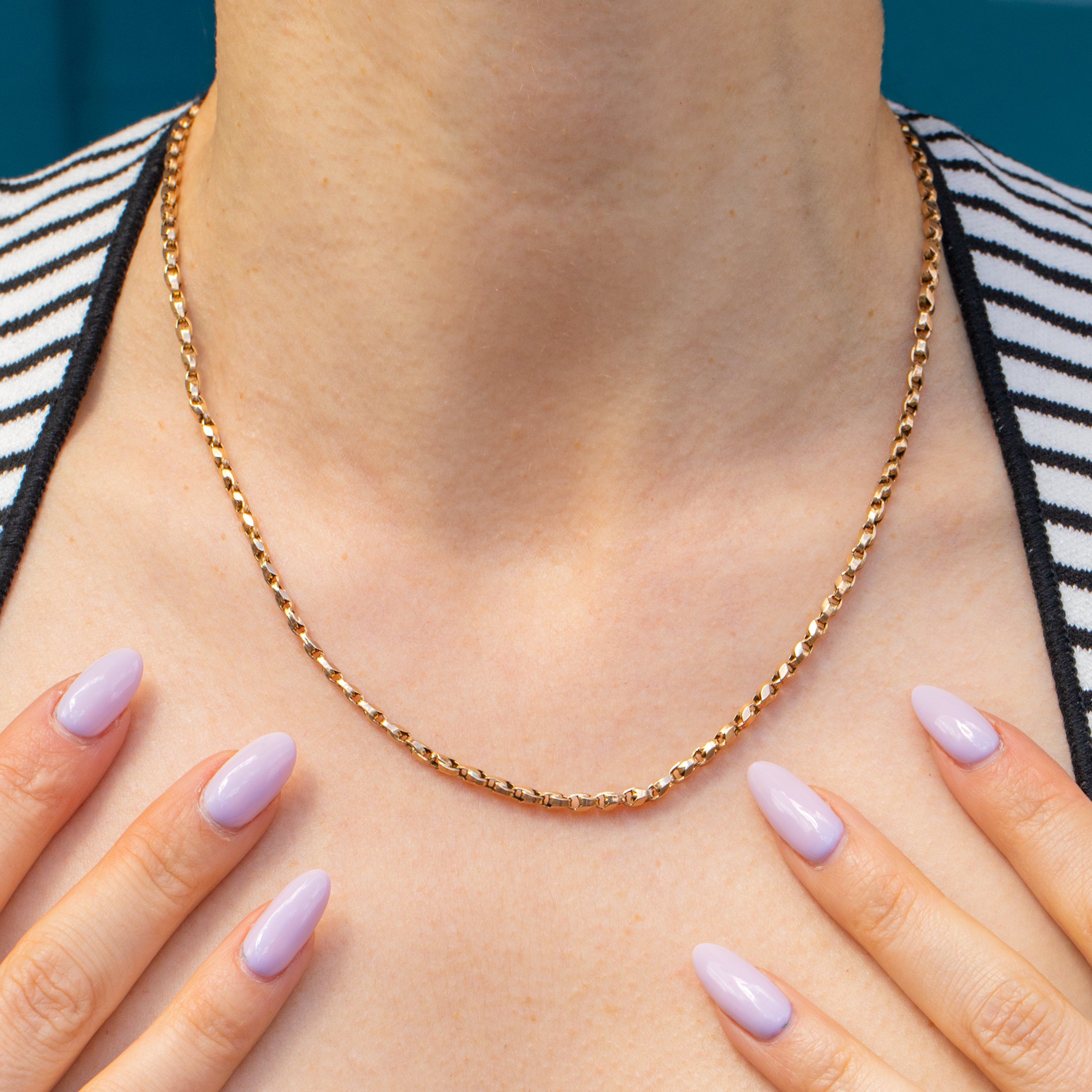 Hanging at a lovely length of 18", she will sit daintily across your collarbones. This Victorian Gold chain is also a wonderful thickness for stacking alongside other Gold treasures to create a gorgeous layered look!