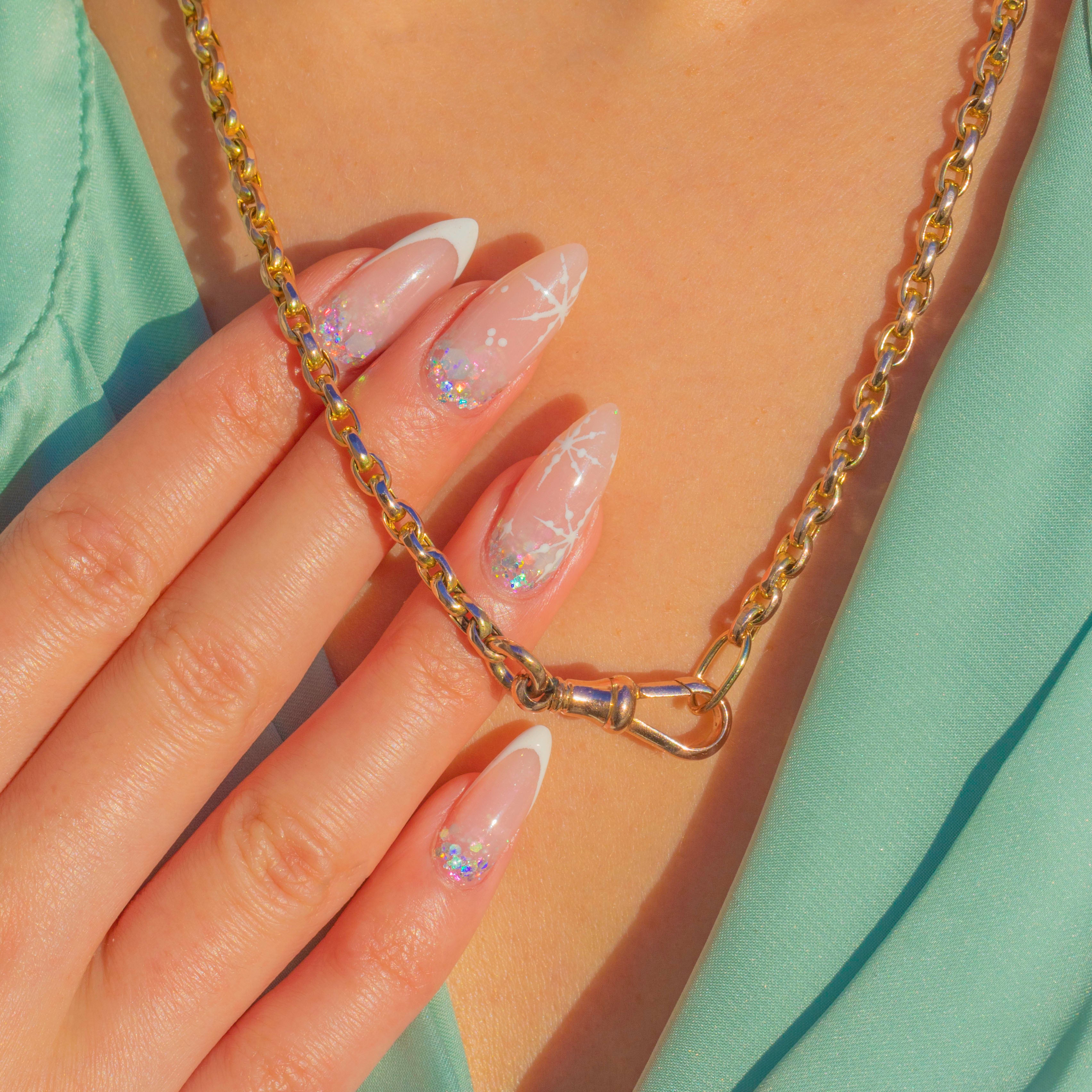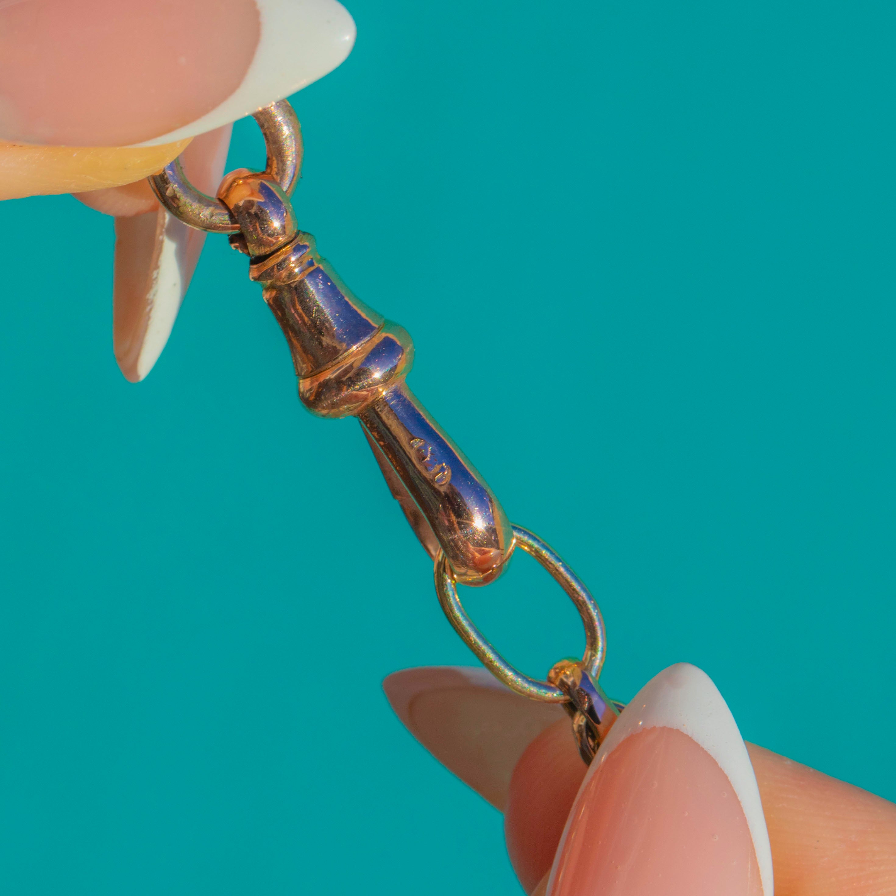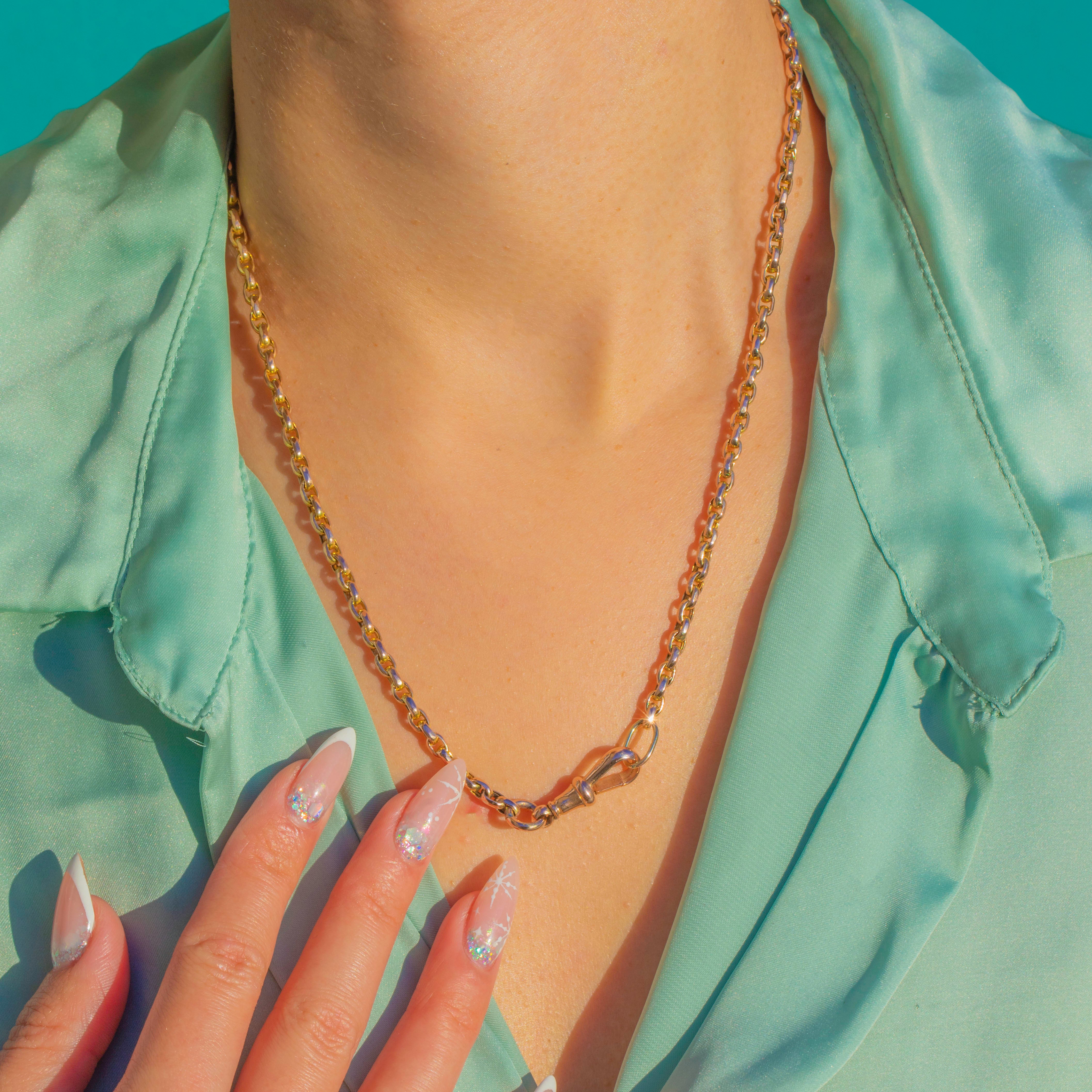 A classic Edwardian belcher chain in 9ct Gold, finished with an antique dog-clip for that coveted finishing touch. The rounded links have a refined elegance that feels timeless, and the dog clip can be worn at the front as a focal point or used to display a charm, locket or pendant.
