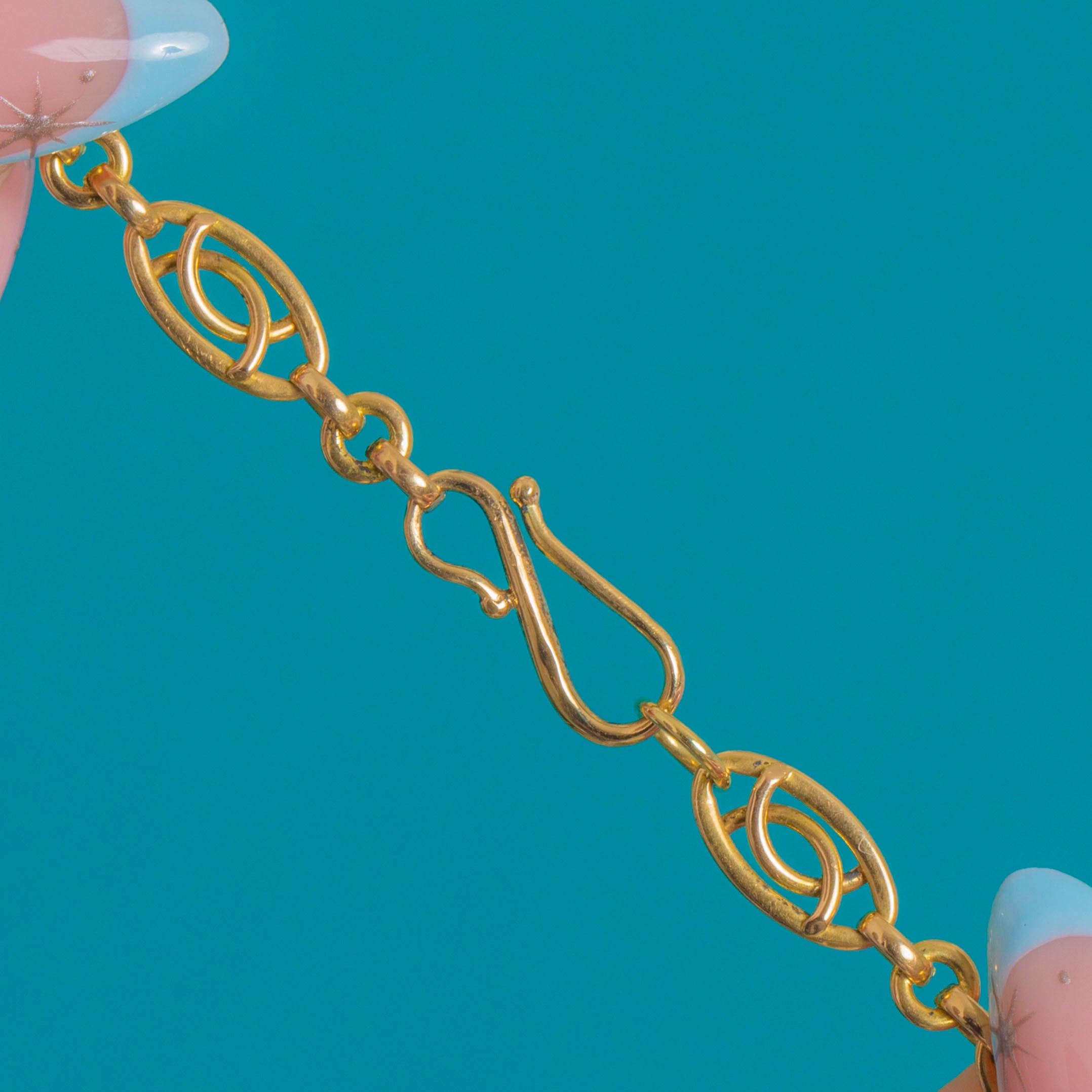 VERY GOOD: Bright Gold with light surface wear and small scratches commensurate with age. The articulated links and joins are secure and well-preserved, and the chain retains an attractive polish. The antique hand-made S-shaped clasp works smoothly and fastens securely, with no visible repairs.