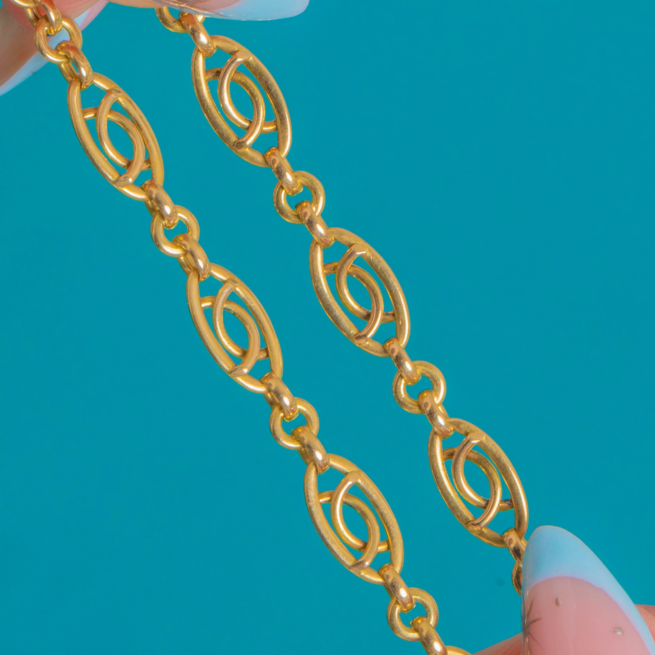 A refined French fancy-link chain from the late Victorian era, crafted in glowing 18ct Gold. The articulated design repeats elegant openwork navette links, each interlaced with a delicate figure-eight “love-knot” motif for a beautifully balanced, geometric rhythm. The polished finish enhances the fluid movement and gentle shimmer as it sits at the collarbone.