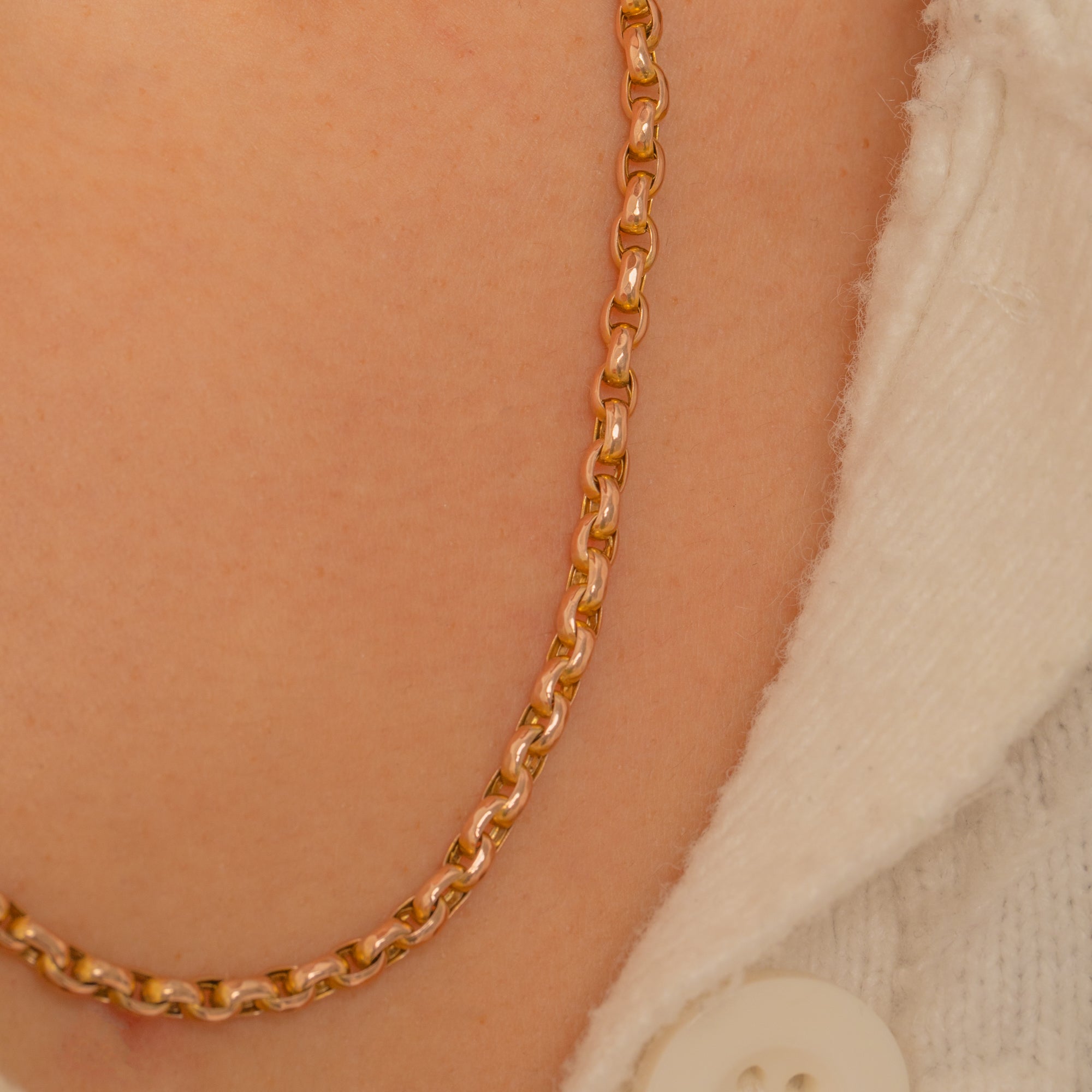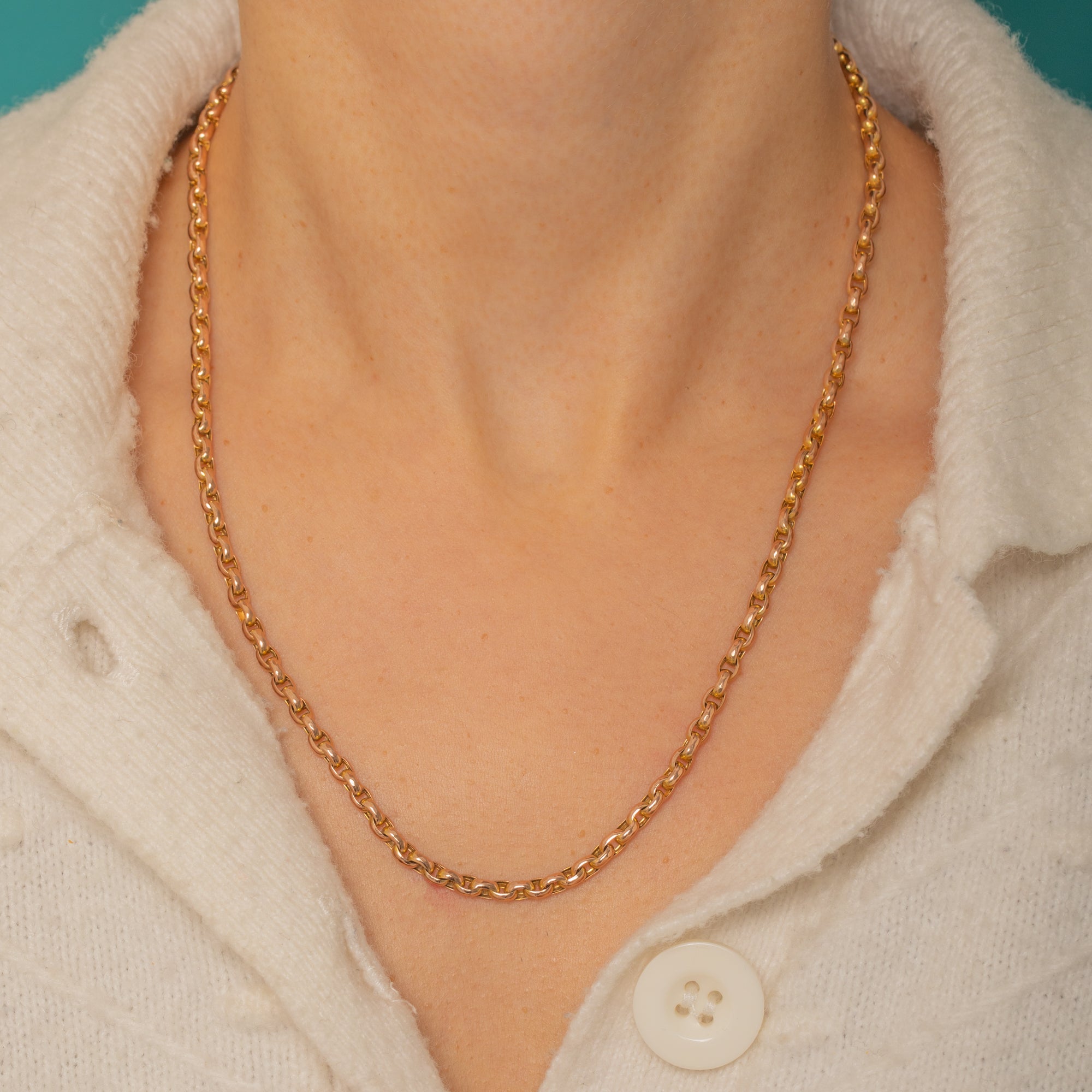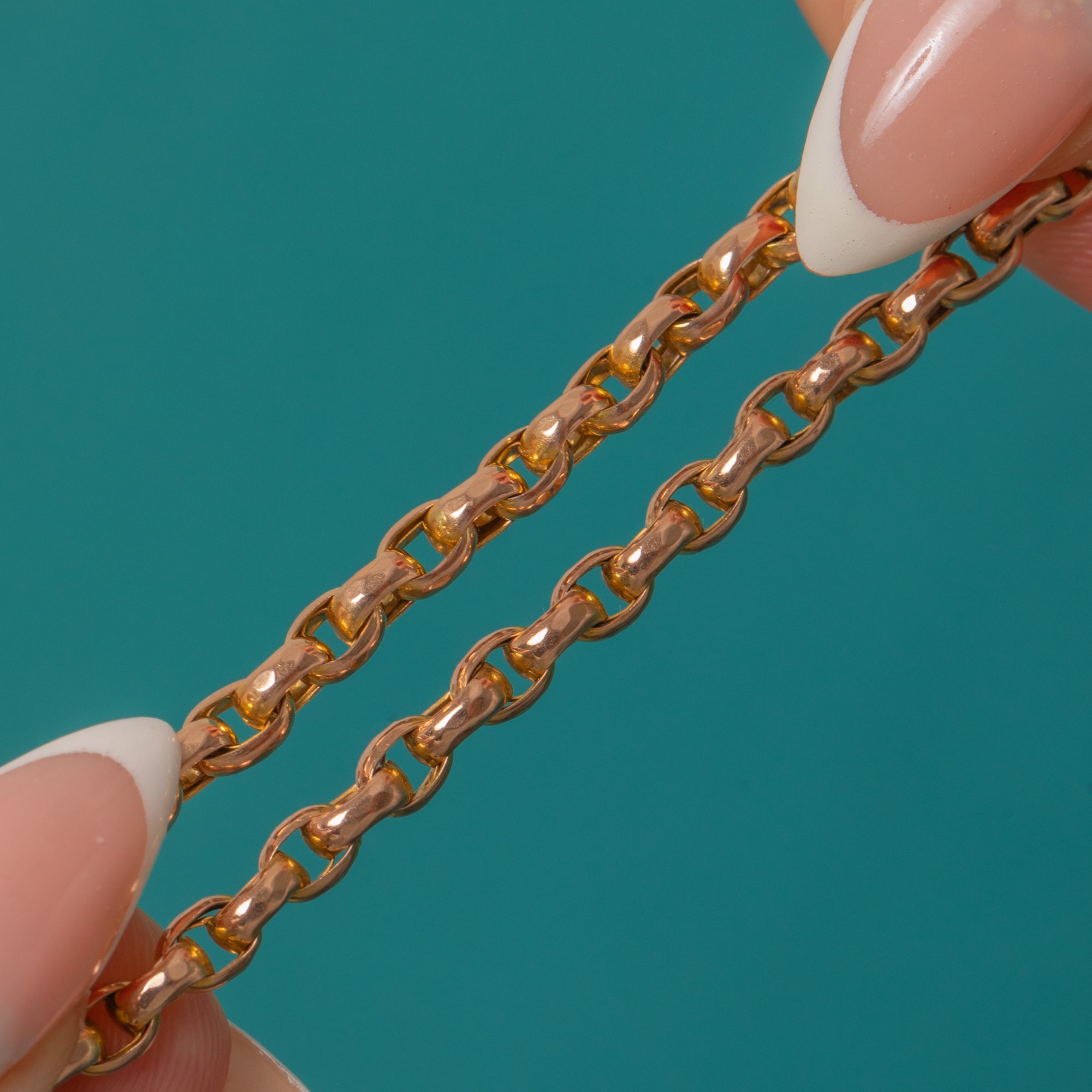 Timeless and beautifully versatile, this Victorian 9ct Gold Belcher chain is the epitome of everyday luxury. The uniform round-to-oval links have a sleek high-polish finish, giving the piece a rich golden glow and elegant fluidity around the neckline.