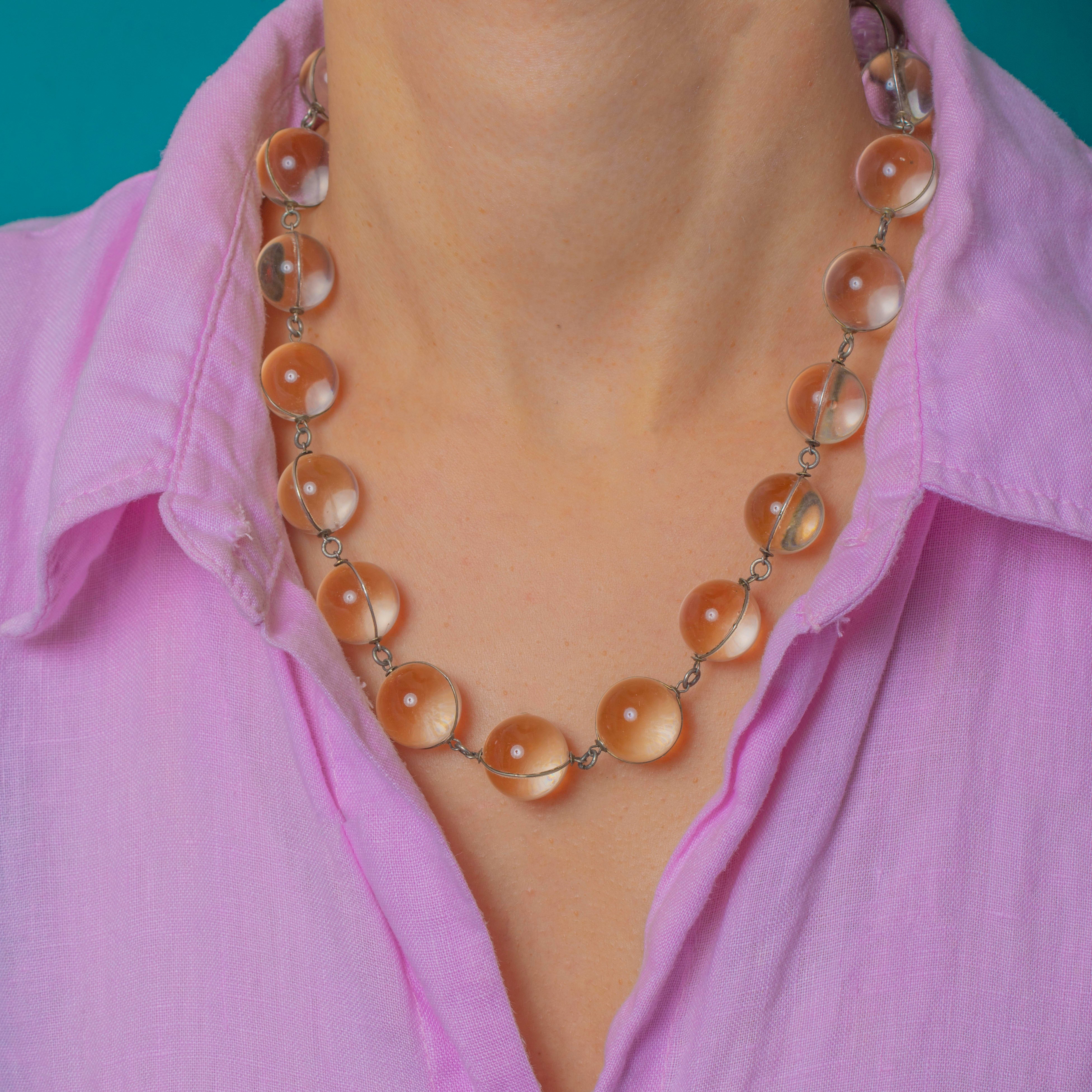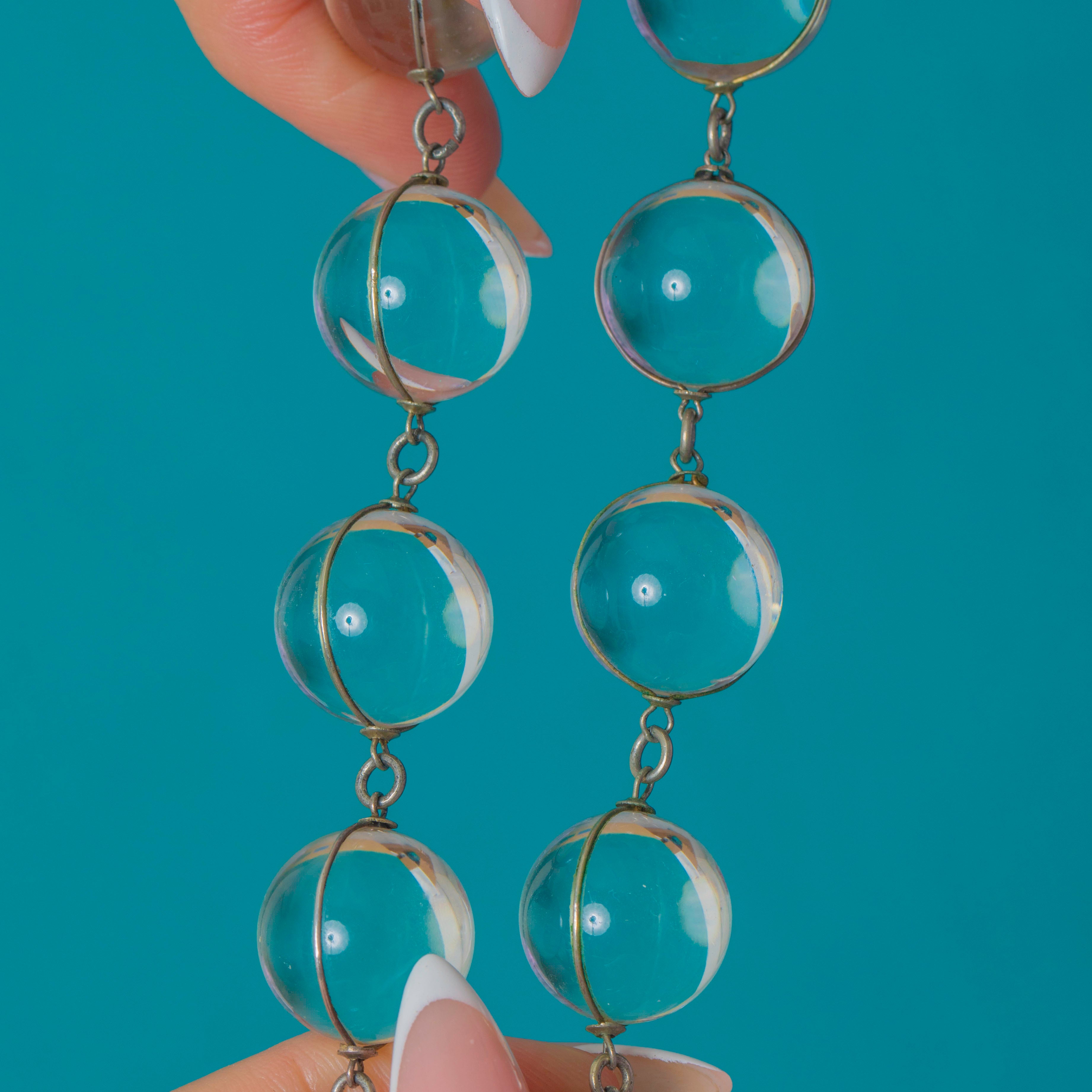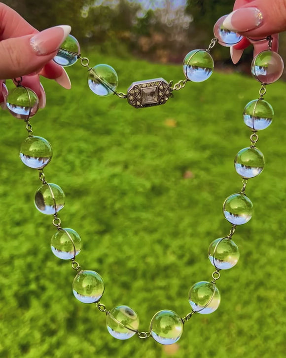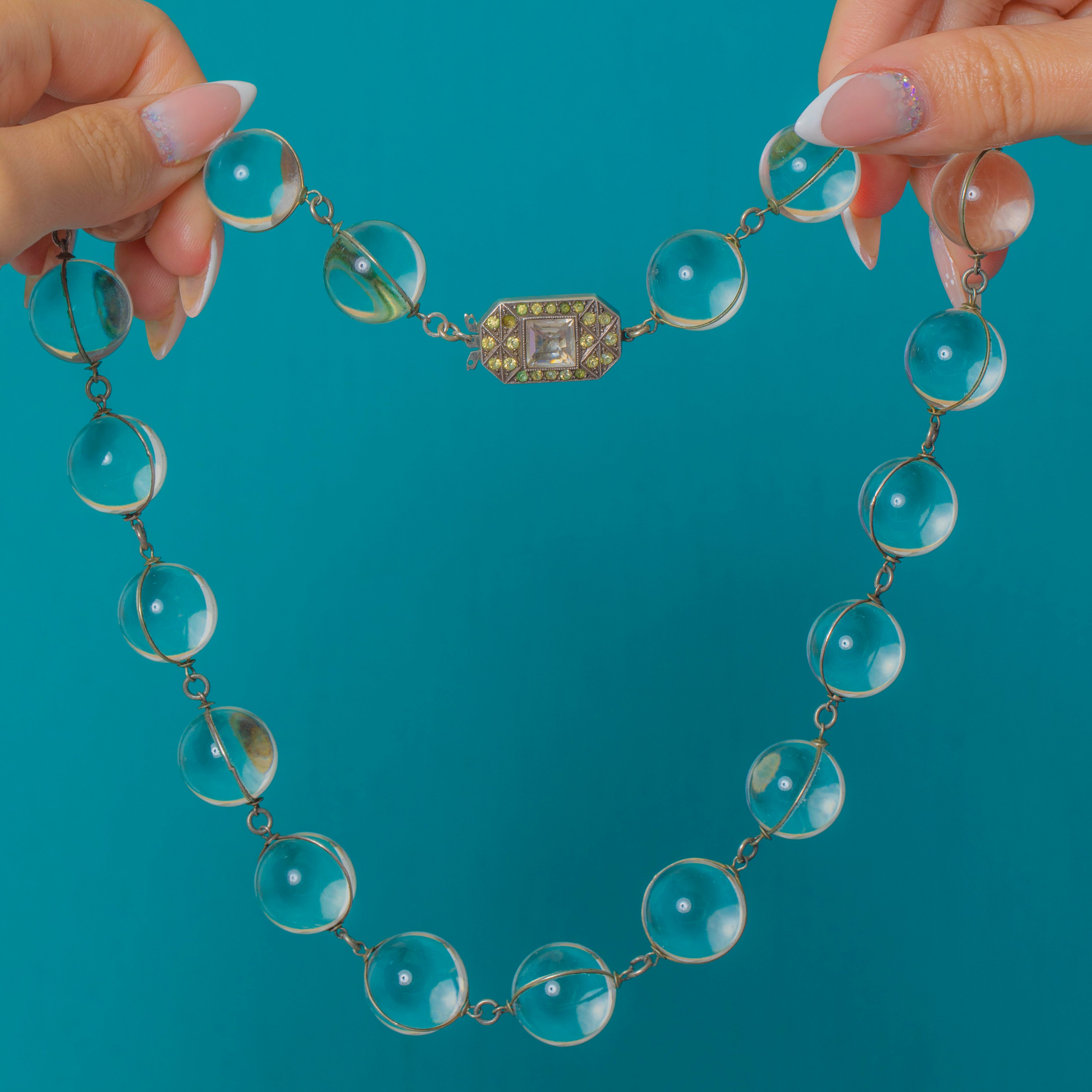 This Victorian Pools of Light necklace is a breathtaking piece, featuring large 15.5mm Rock Crystal orbs that glow with ethereal inner light. These perfectly clear spheres magnify whatever they touch, giving a magical, illuminated appearance unique to genuine Pools of Light jewellery.
