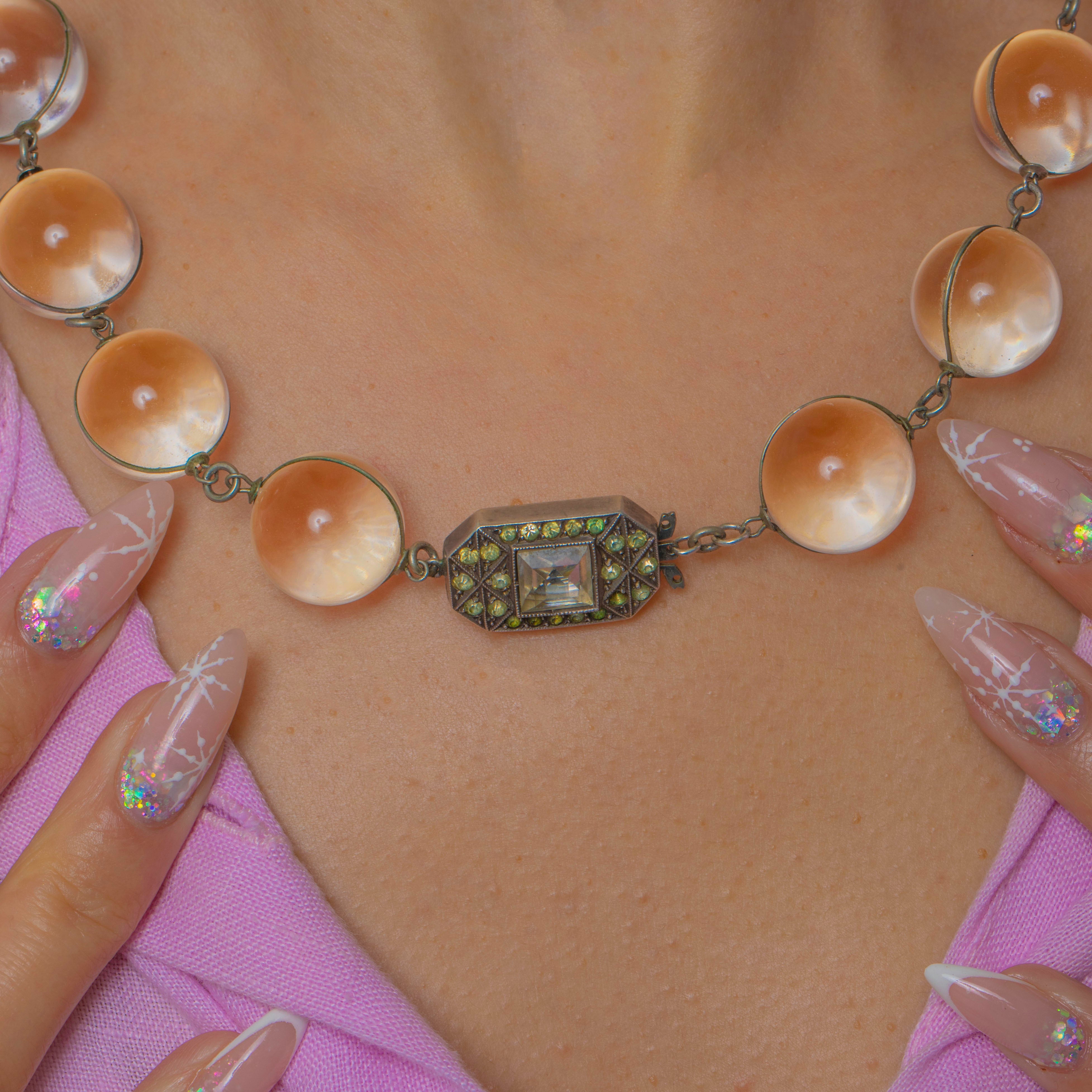 The 18" strand is completed with an ornate Sterling Silver clasp set with Yellow Paste and a decorative Square Paste accent, adding a refined touch of Victorian sparkle. A rare and highly collectible necklace with exceptional presence.